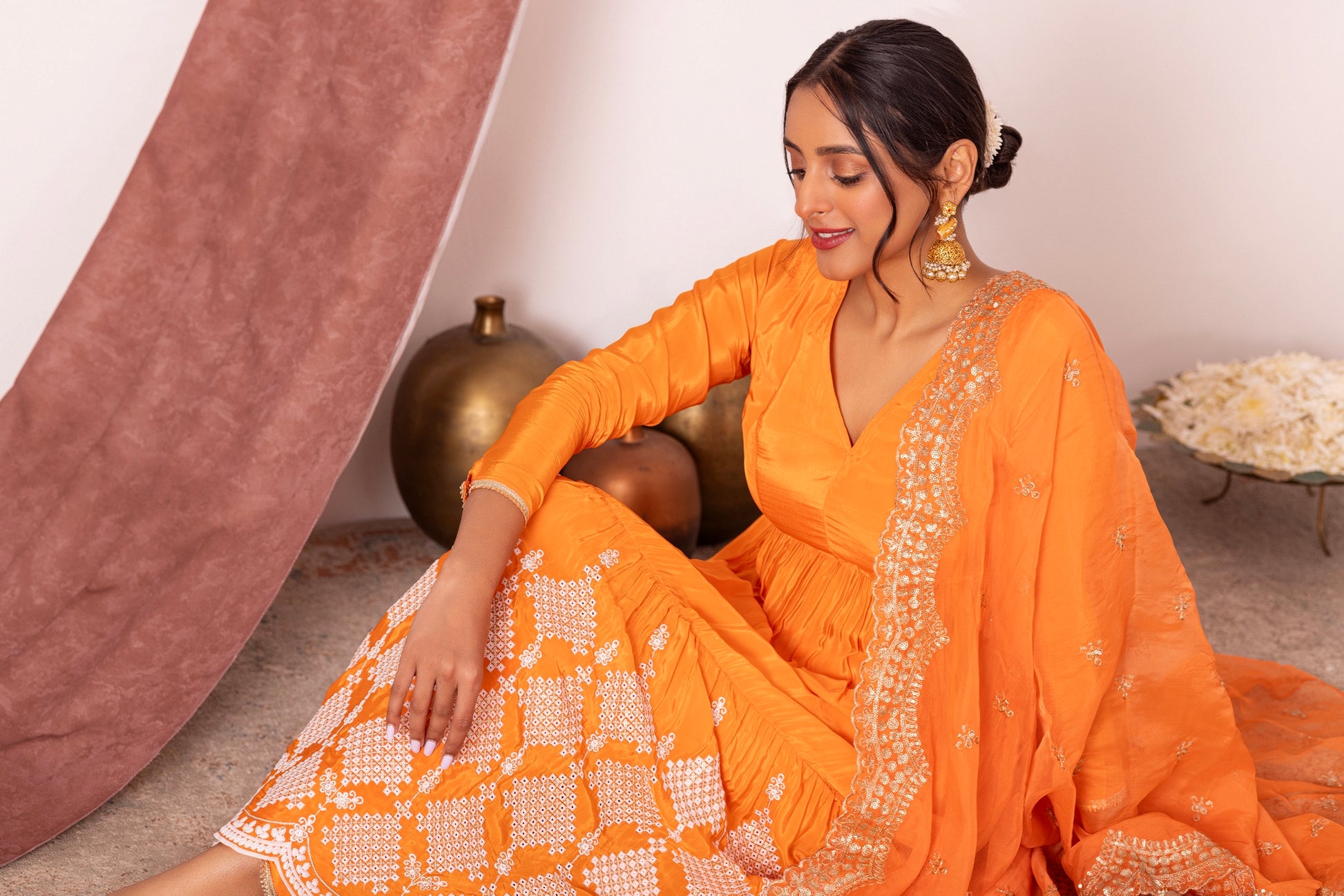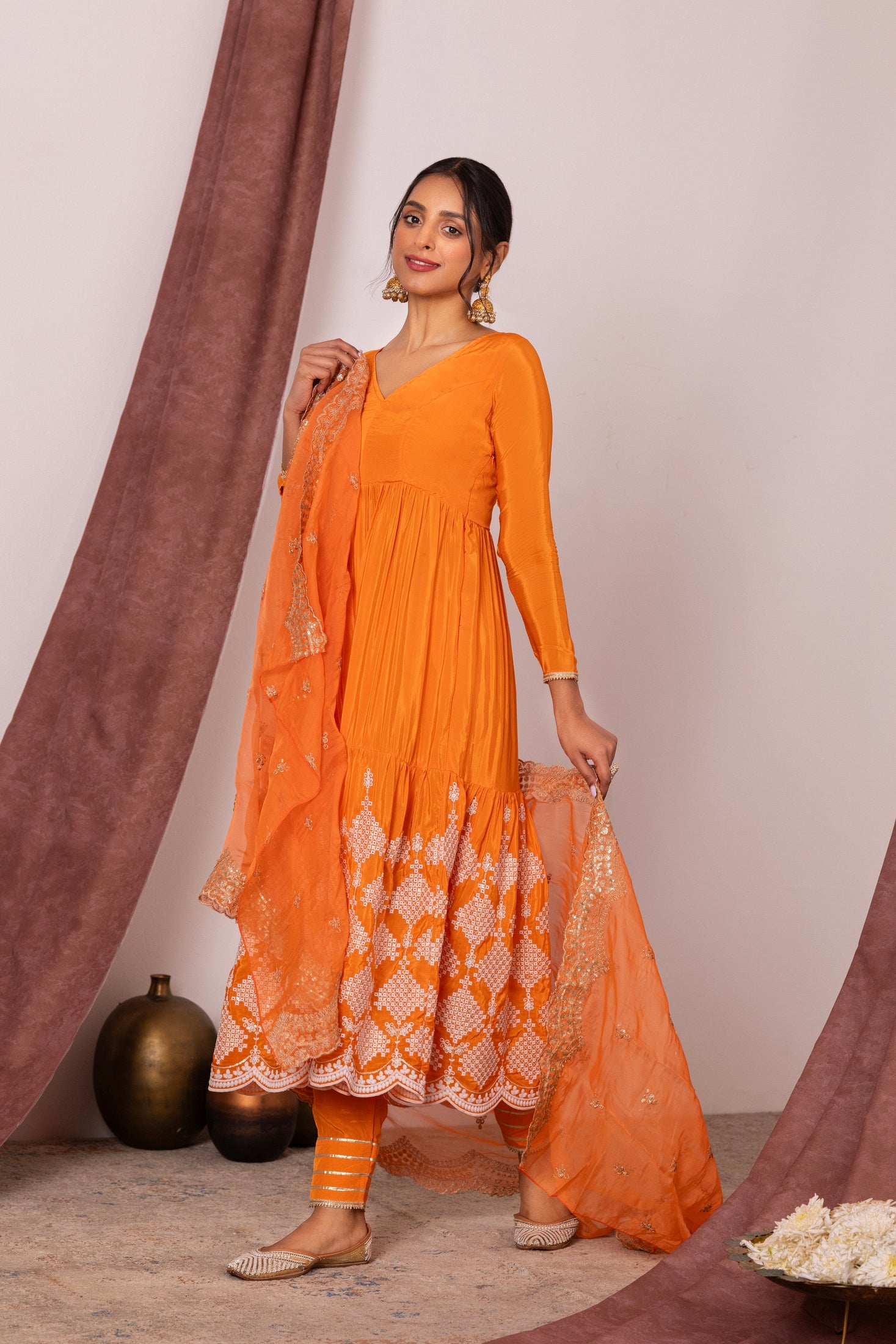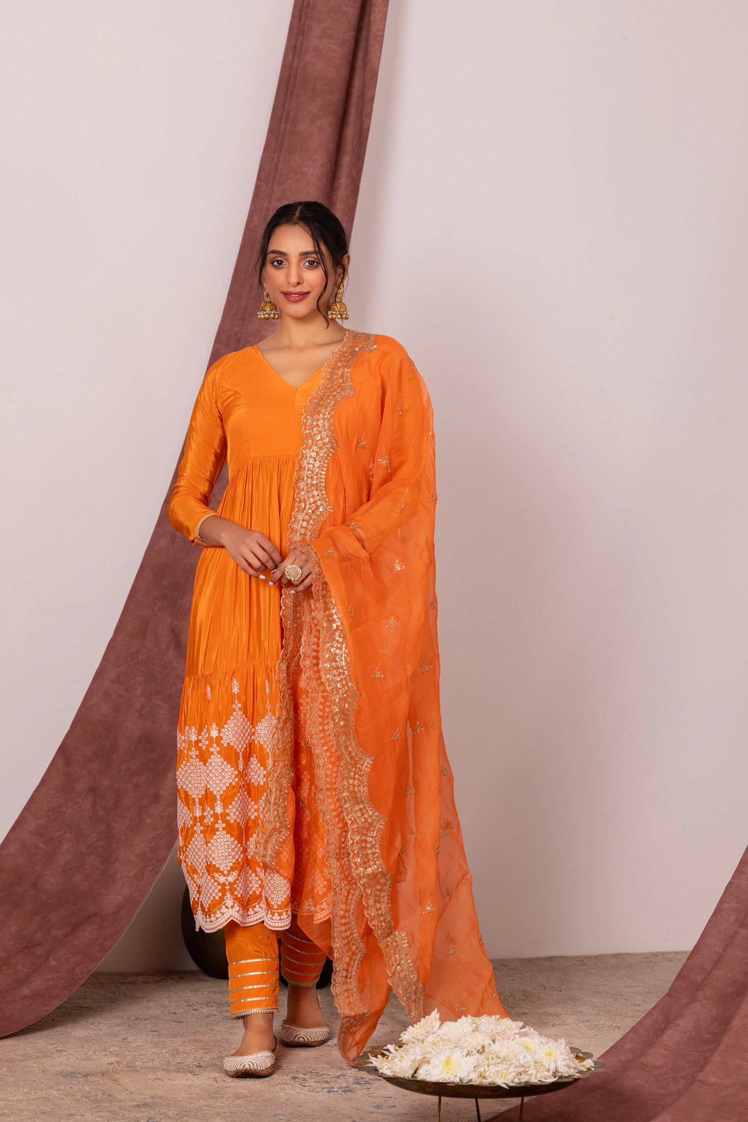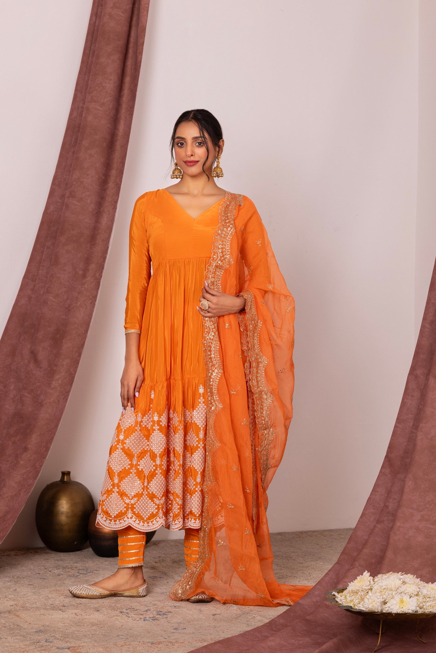 Bright Orange FLARED EMBROIDERED SUIT SET