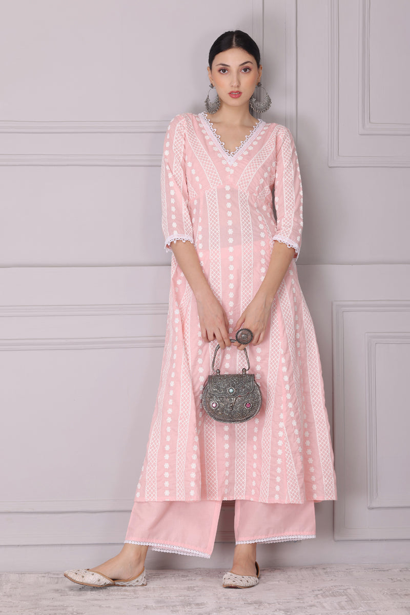 If you love pastel tones you will love this Baby Pink Lace Embroidered Kurta Set from SEW . It is made from beautiful chikankari lace embroidered cotton fabric, this kurta has V-neck outlined with scallop lace, quarter sleeves that makes it visually stunning, while the Kali stitched hemline gives a stunning fit. It comes with a matching palazzo with lace at hem that adds oodles of style.