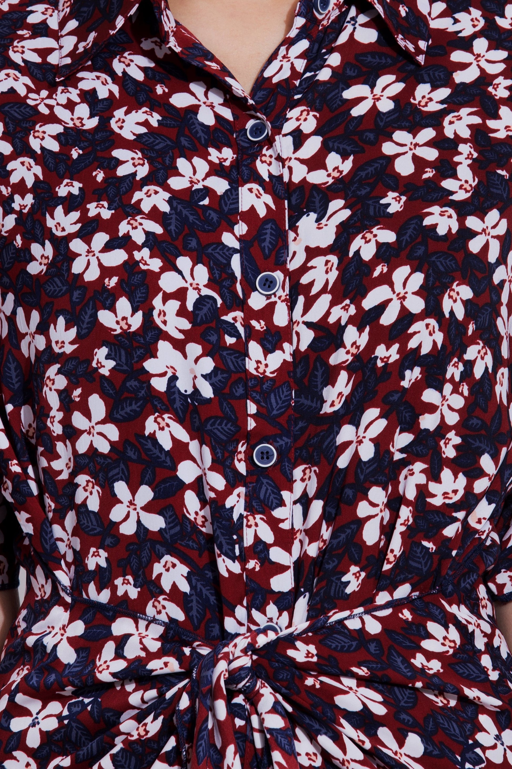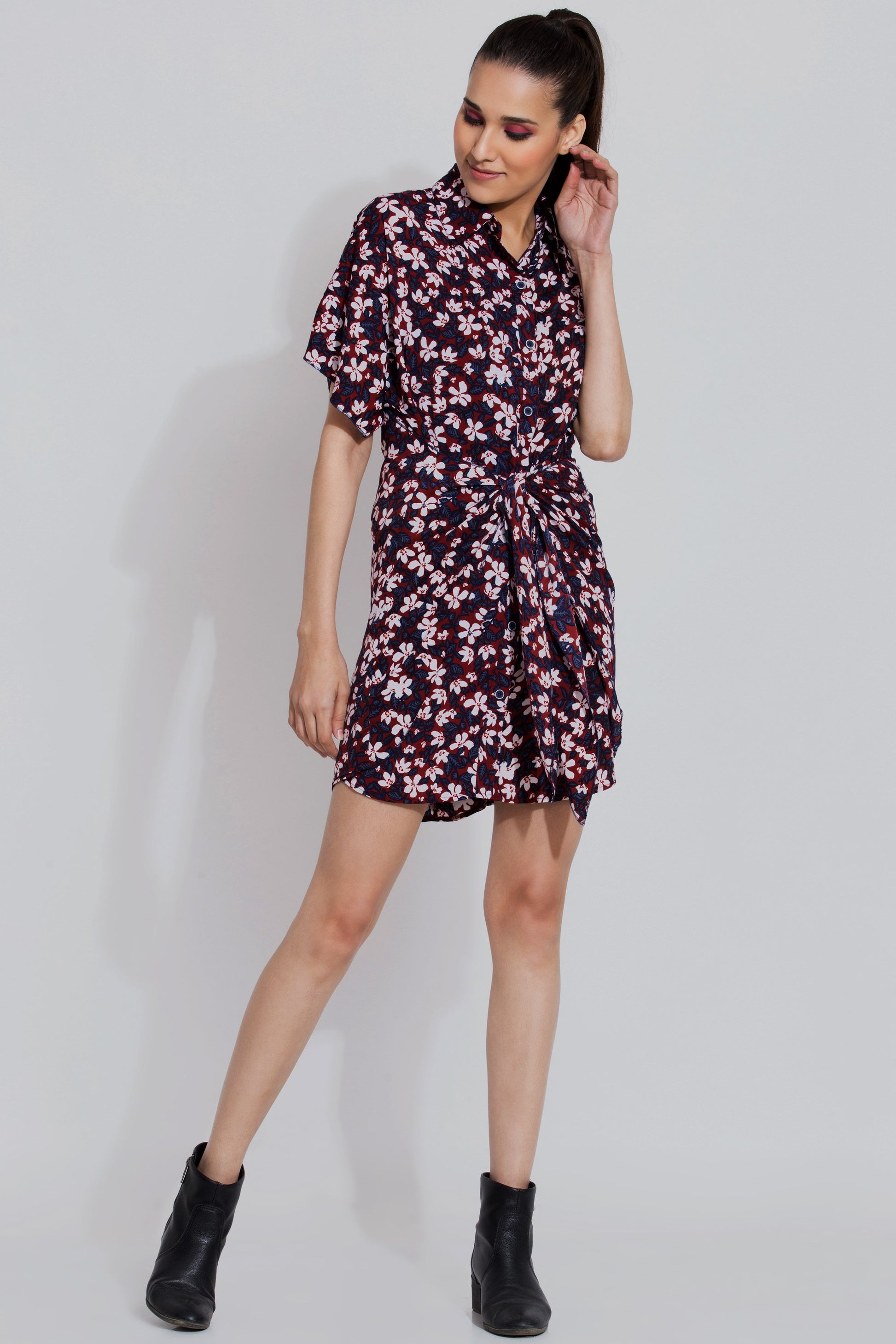 Garner the attention of the fashion freaks wearing this berry front buttoned shirt dress from SEW. Made using poly satin to assure plush feel, this top is decked with full button placeat, crisp collars and a twin layered tie knot to give the perfect fit to your body. This dress is funk, hideous and effortless to wear. Wear it to your casual outings and look your best.