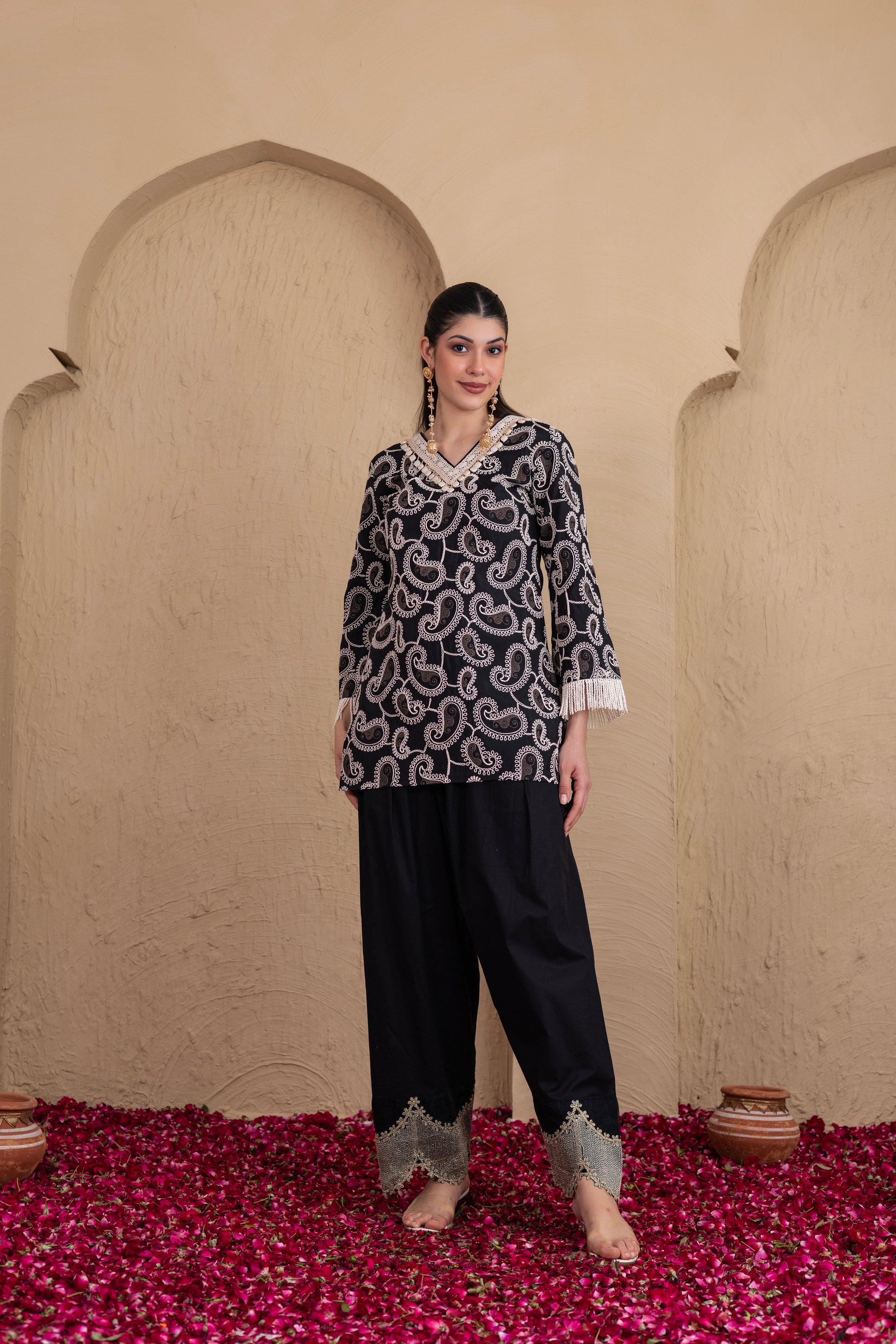 BLACK AND CREAM PAISLEY EMBROIDERED SUIT SET