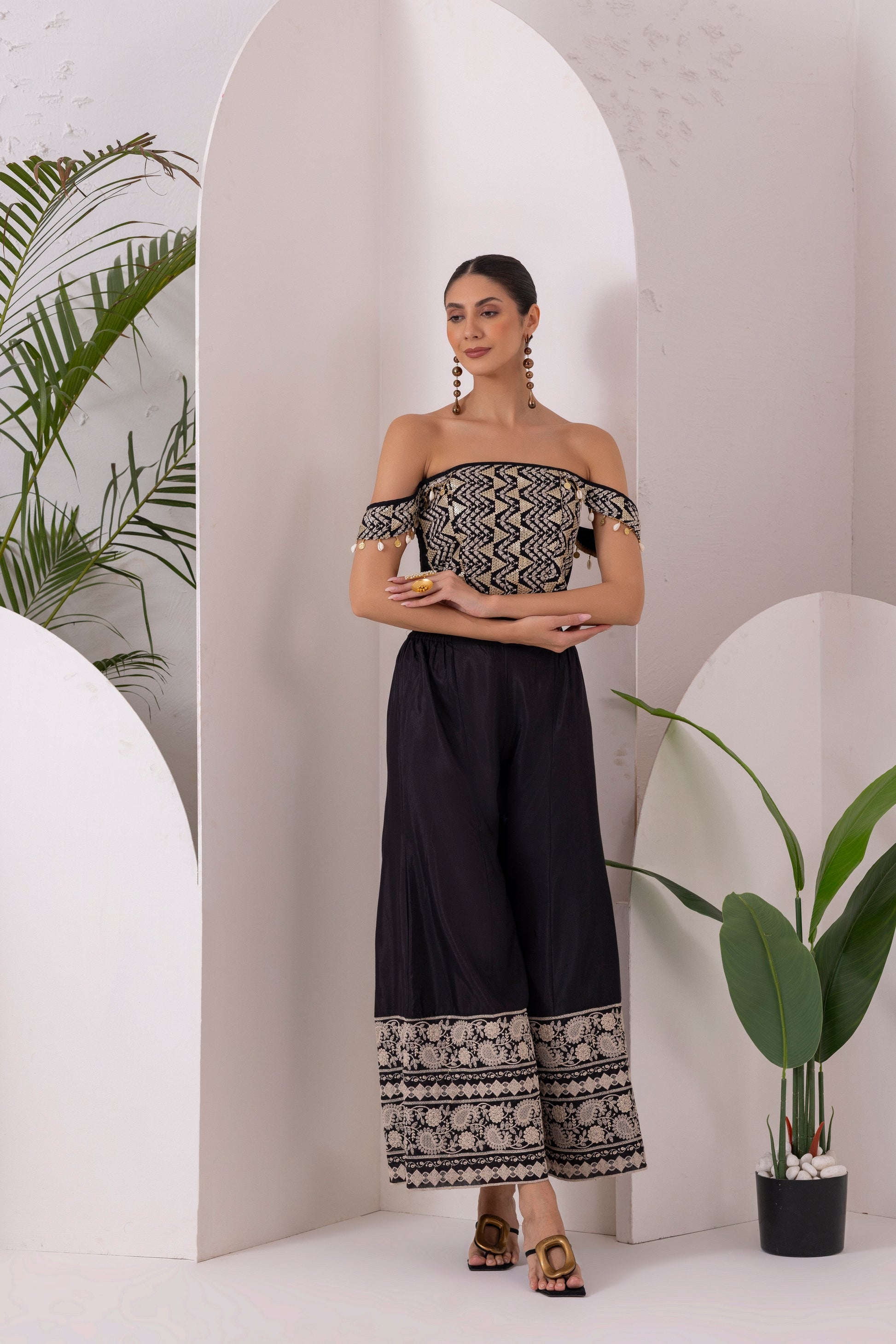 BLACK AND GOLD CORSET WITH WIDE EMBROIDERD PLAZZO FUSION SET