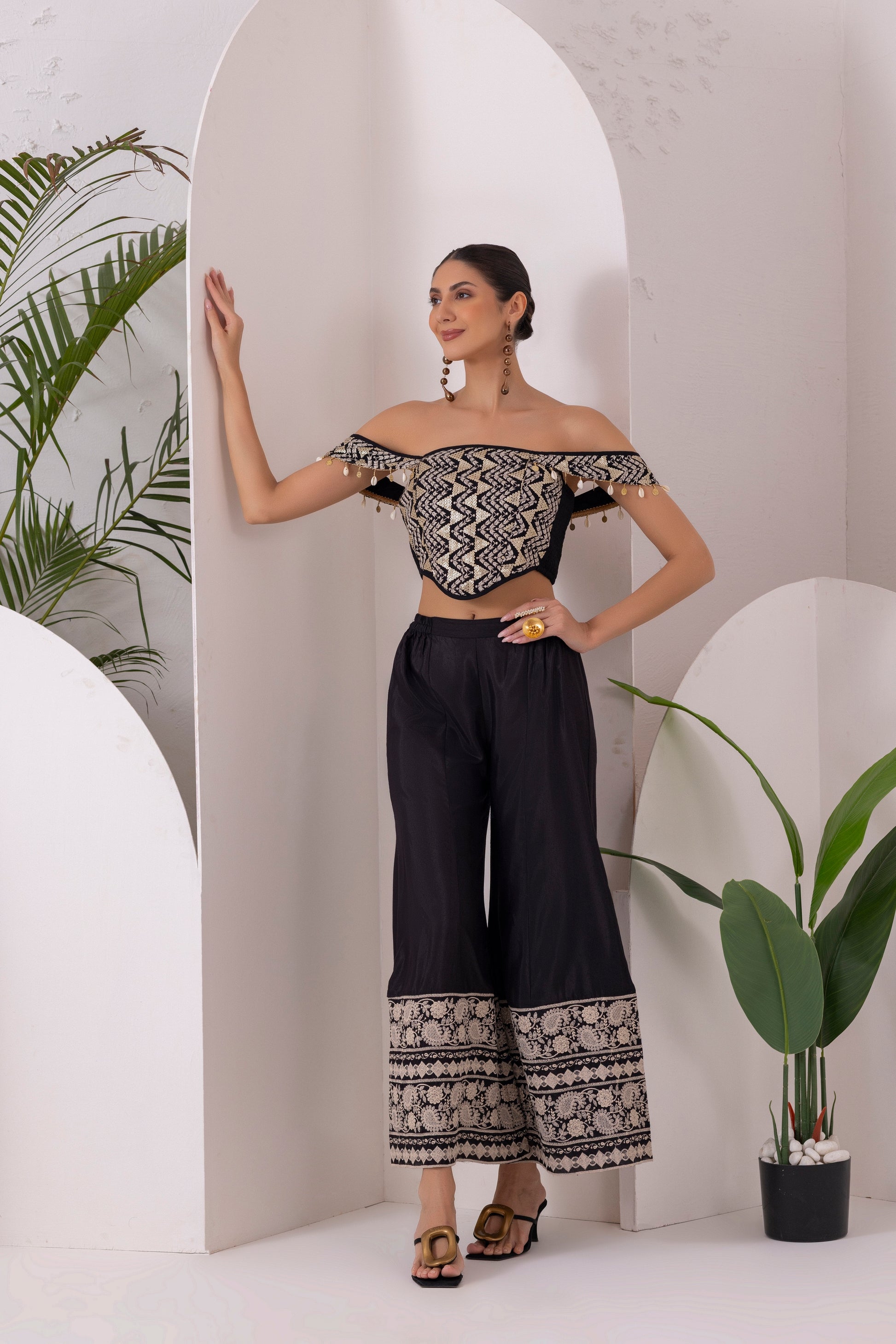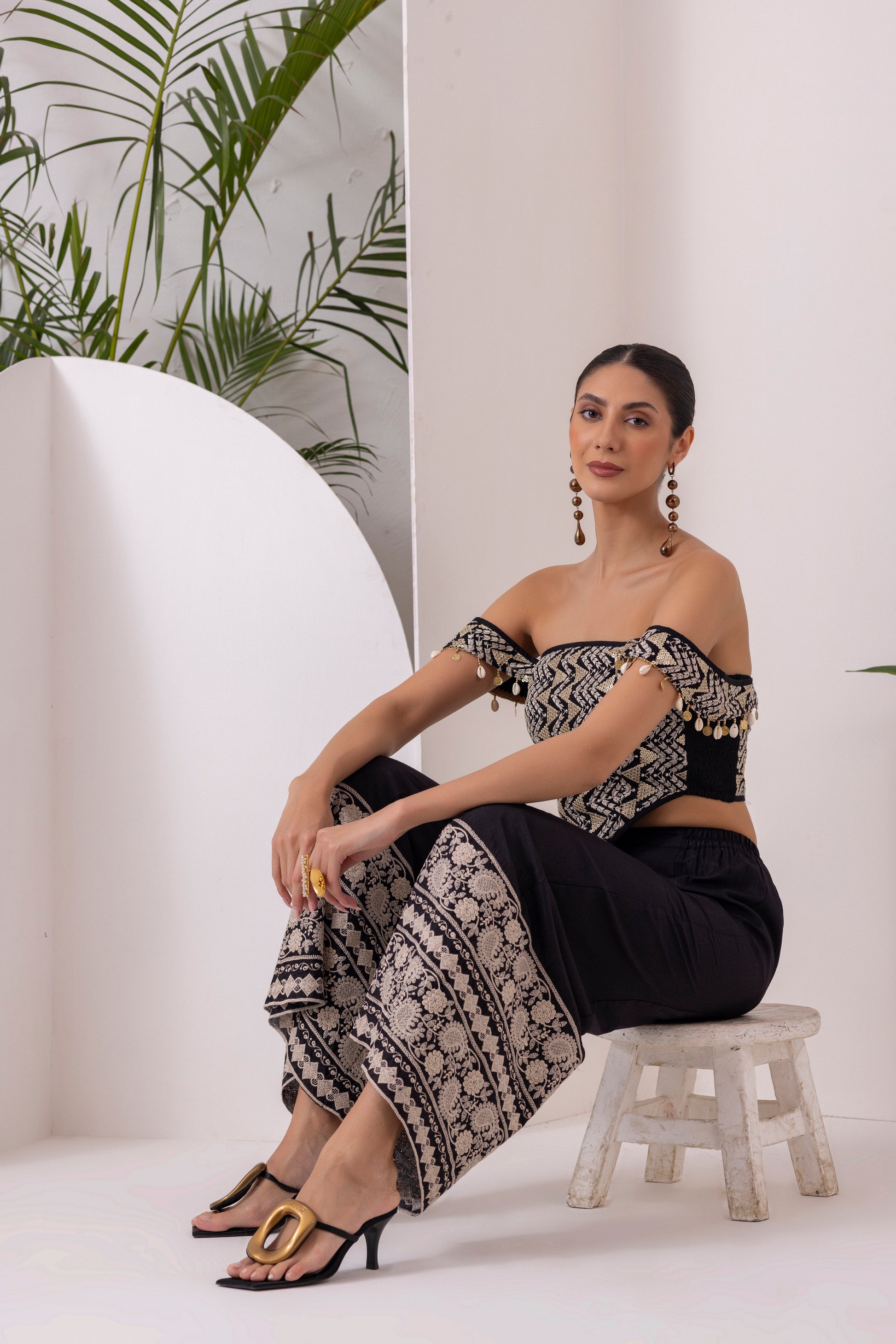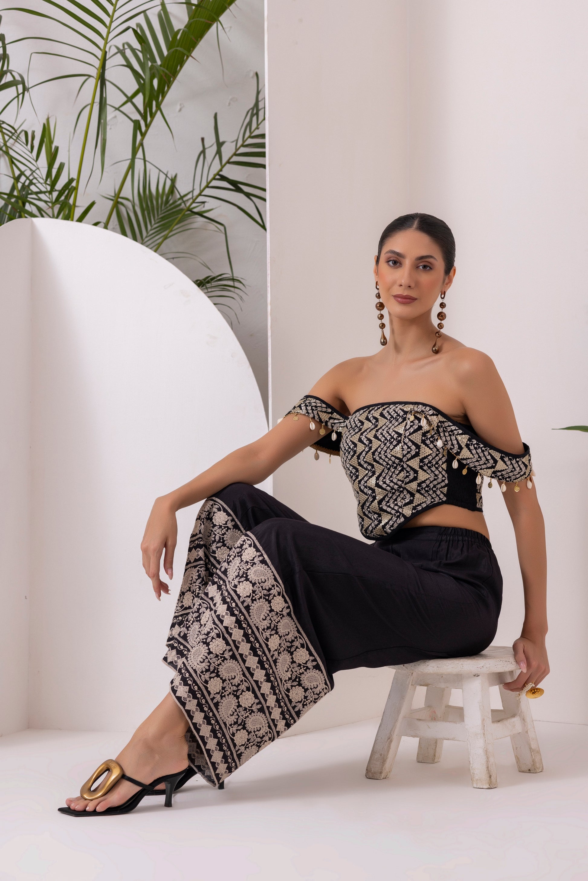 Make a bold entrance in this striking black and gold fusion ensemble. Featuring an off-shoulder corset with falling sleeves, this look is elevated with shimmering gold coin embellishments that add a touch of festive glam. The wide-legged embroidered palazzo pants offer both comfort and drama, creating a silhouette that’s equal parts modern and regal.