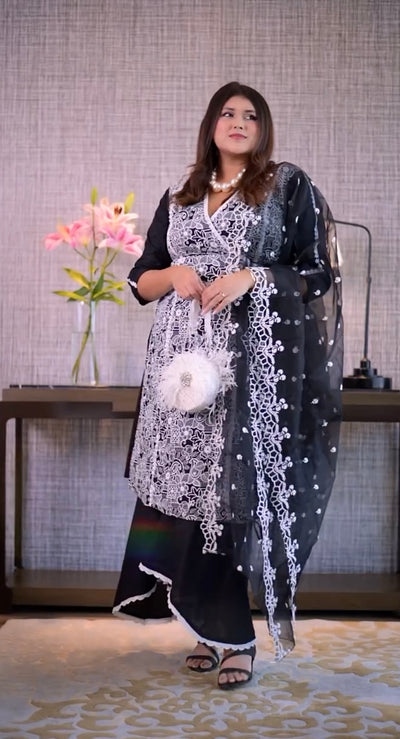 Flaunt your ethnic diva style at any occasion with this stunning black kurta set! Crafted with with softest cotton fabric with schiffli floral modern embroidery with high-low Flared palazzo highlighted with lace at hem, makes it a versatile ensemble. The wrap around kurta gives a flattering fit while as the neck and sleeves highlighted with lace makes it more beautiful. The floral buti and scalloped borders on the organza dupatta will add oodles of elegance to this ensemble.