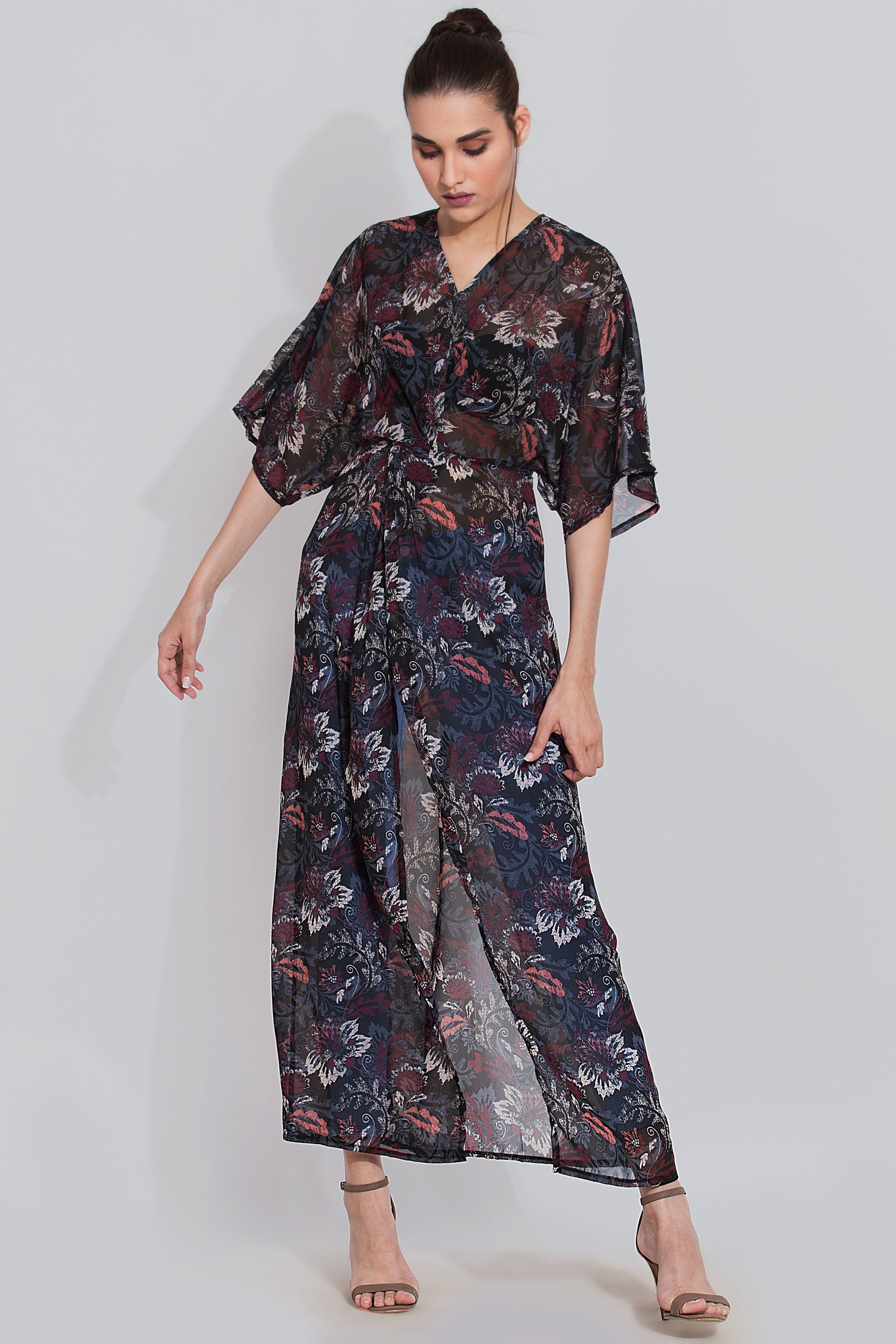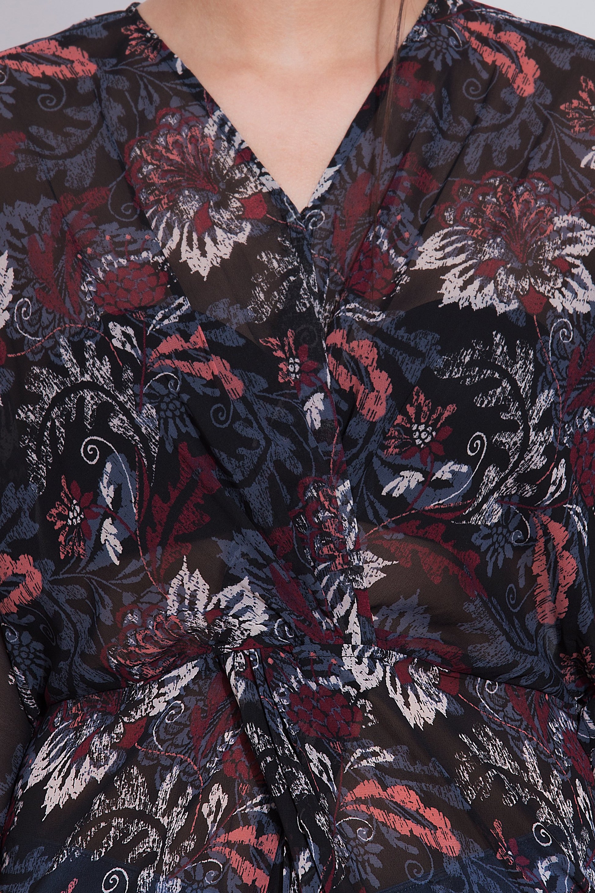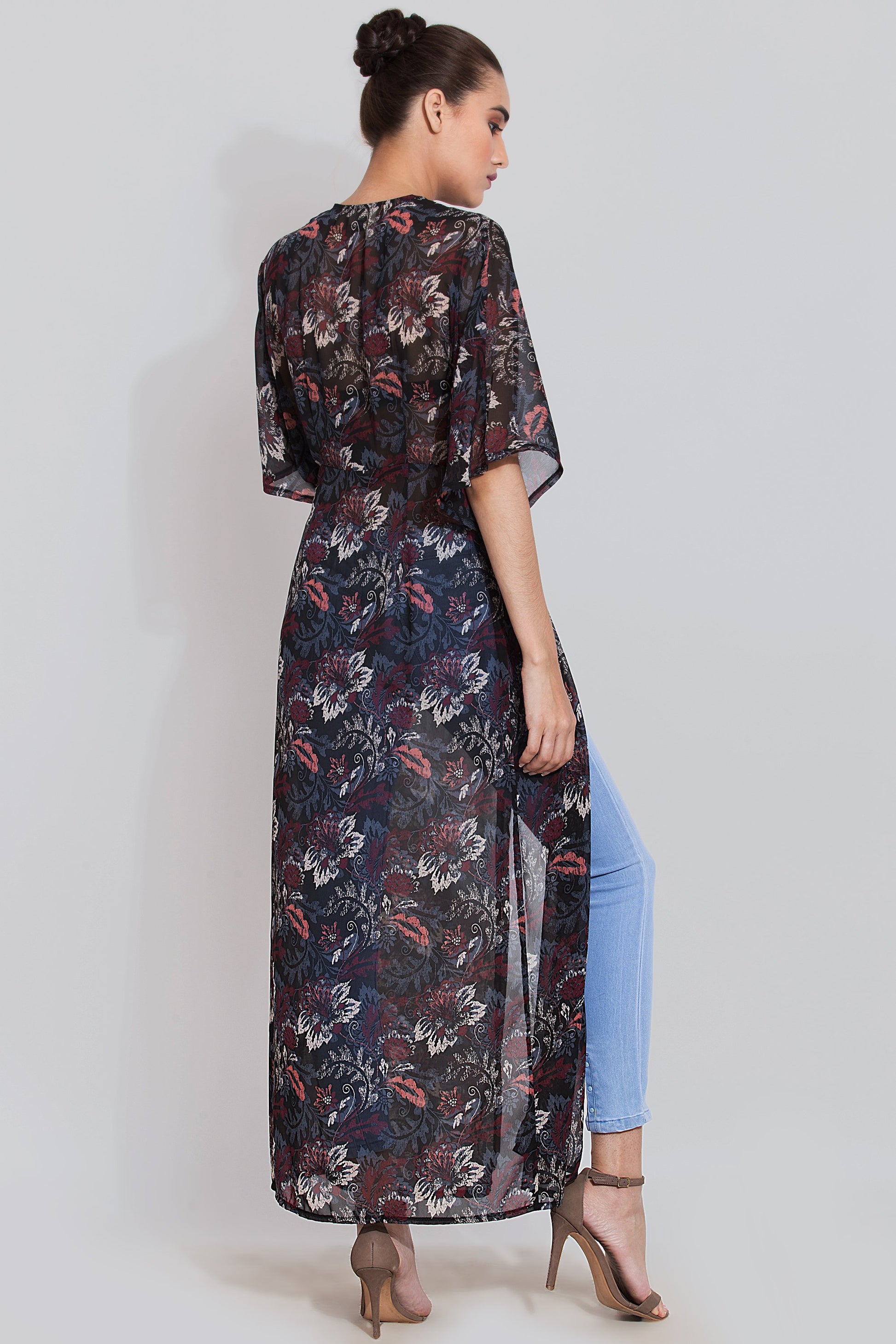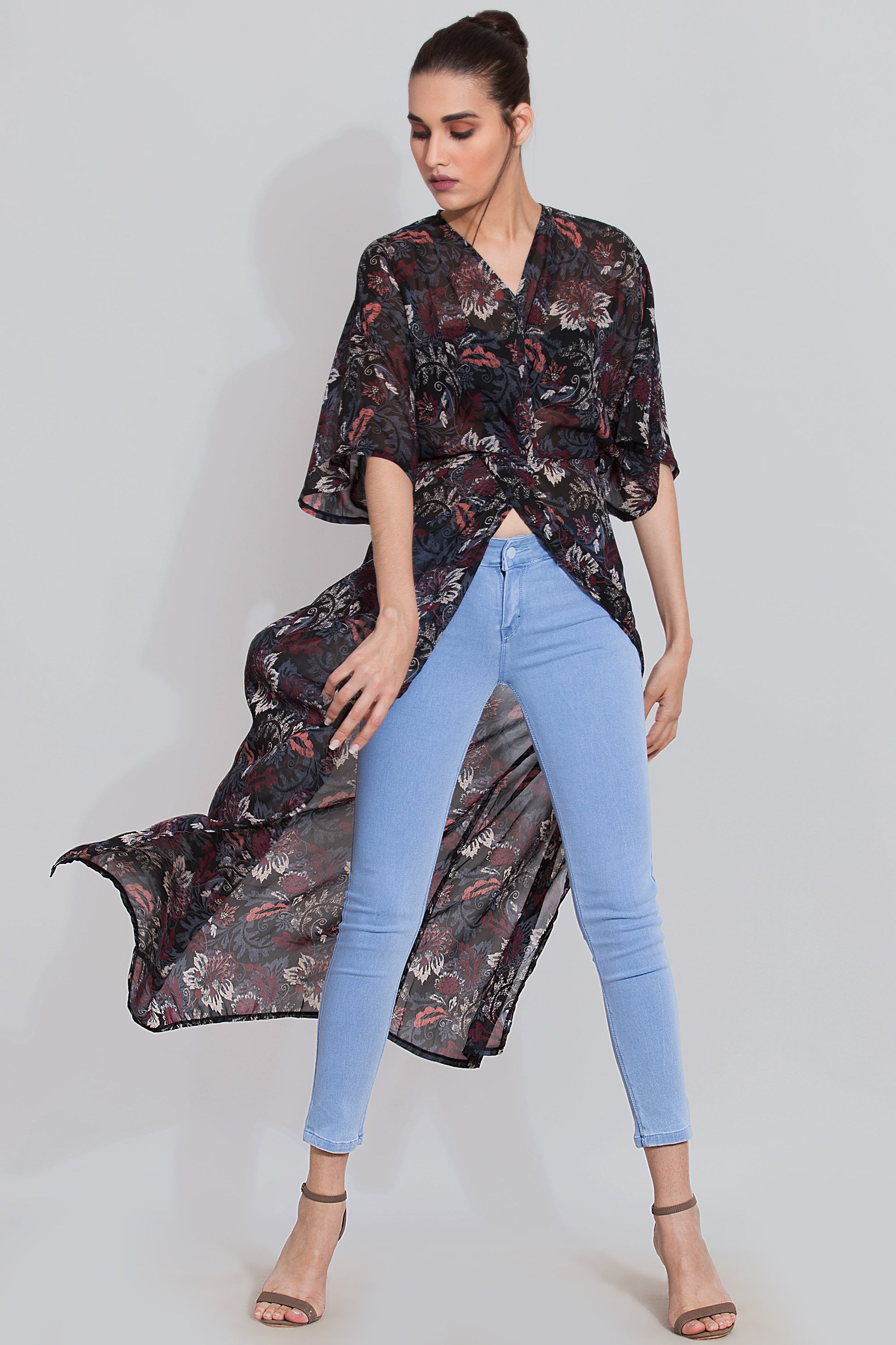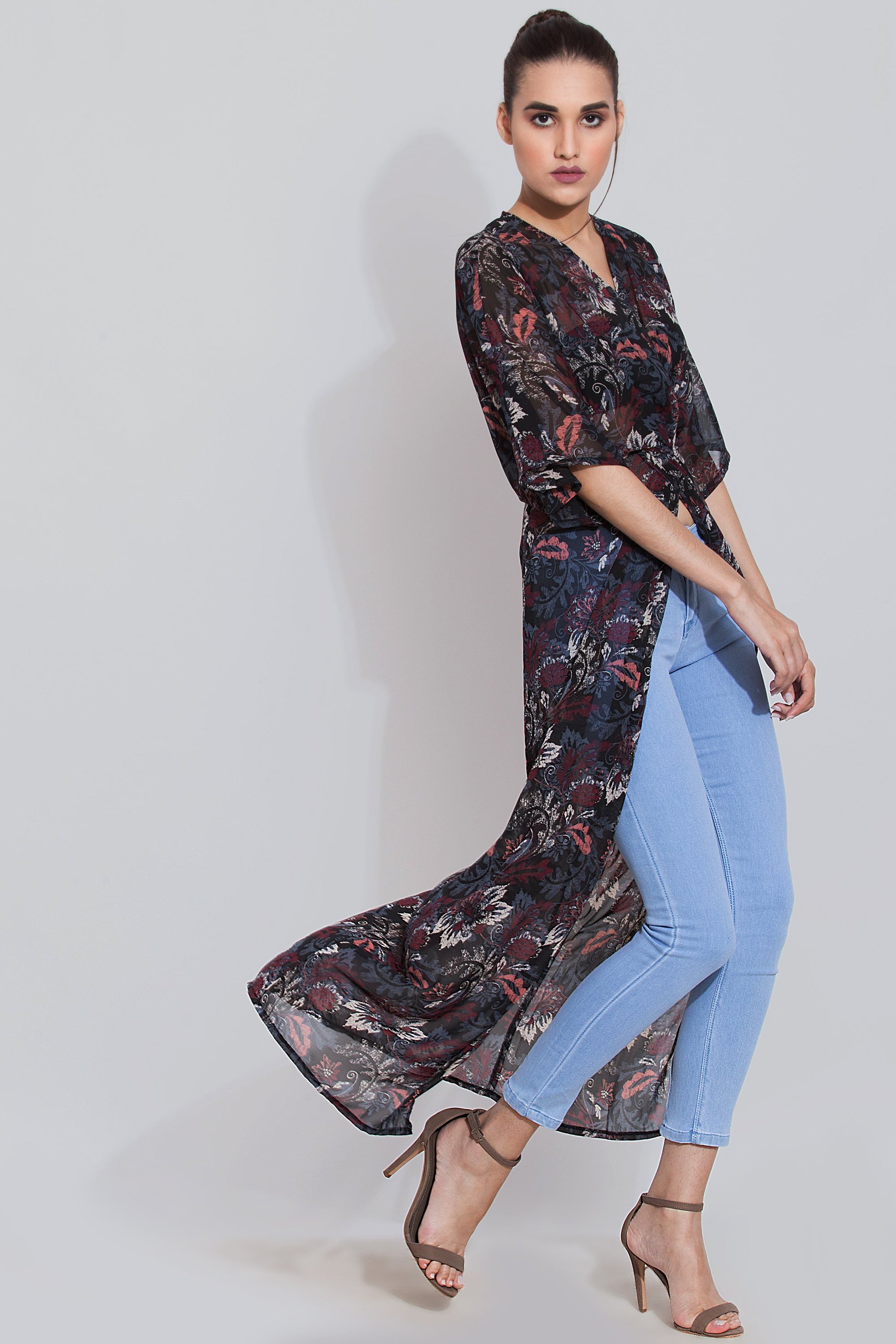 Comfortable and sassy this black print maxi top is a dapper fashion choice. It has knot detailing at the front with the overlapping open bottom that falls beautifully. Pair it with a pair of denims and look your casual best