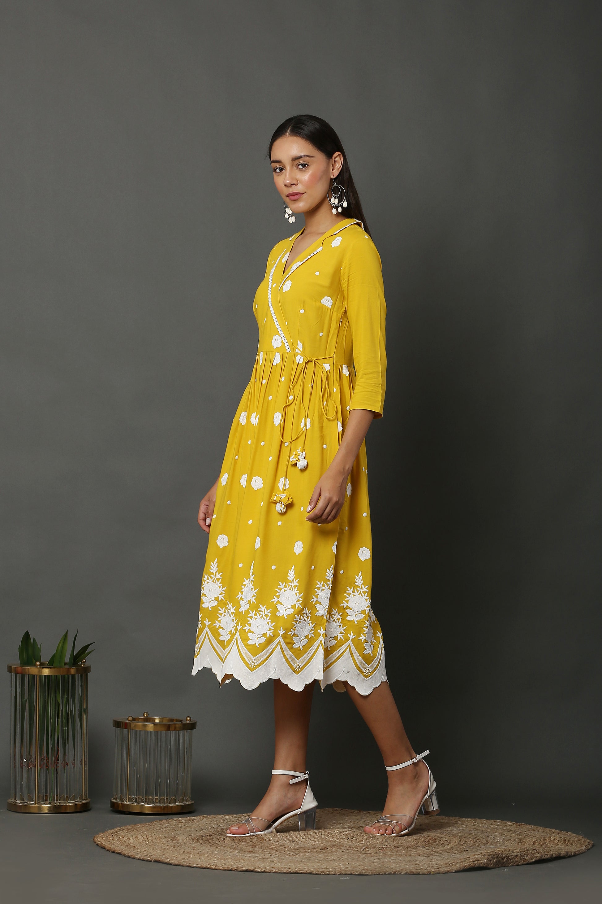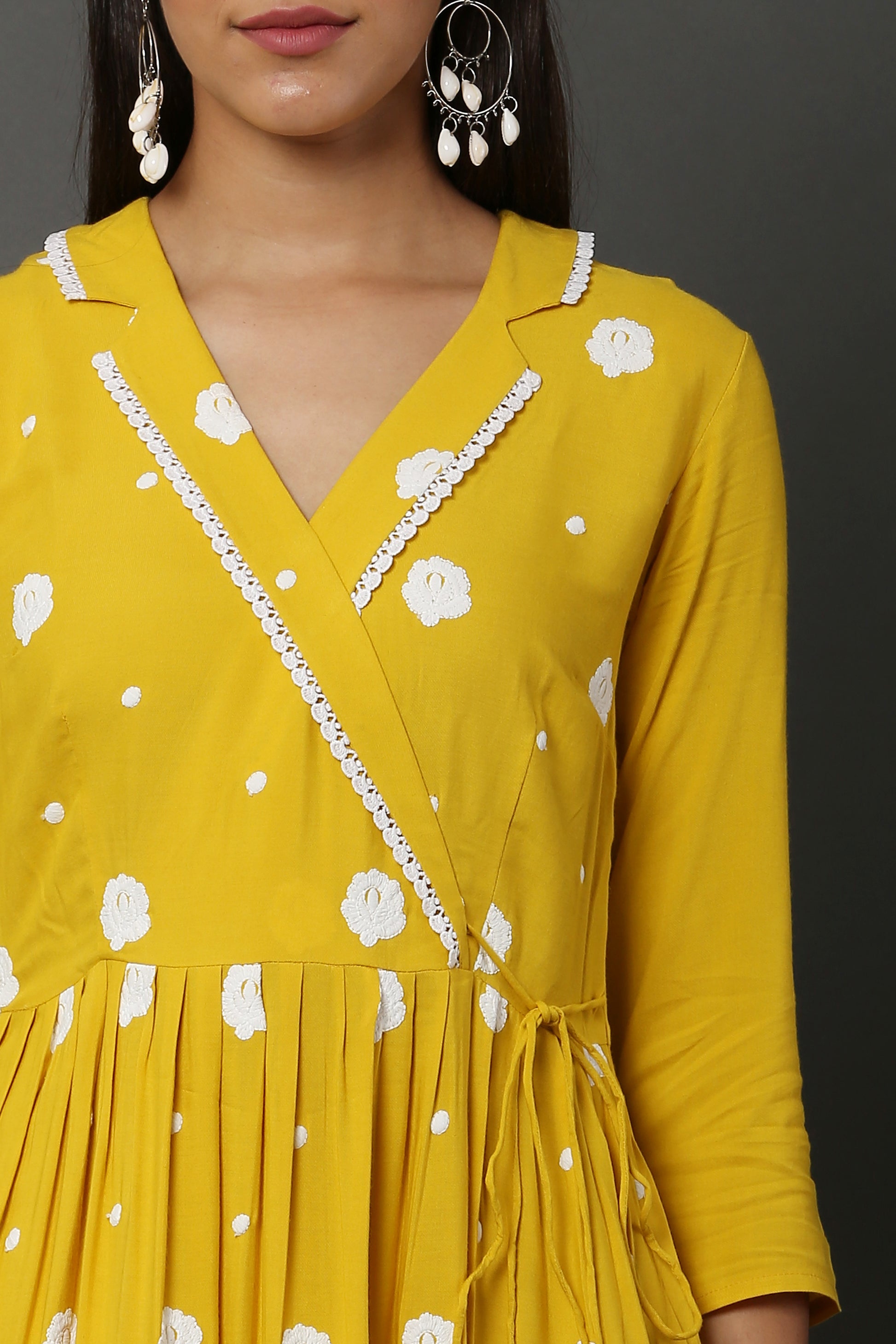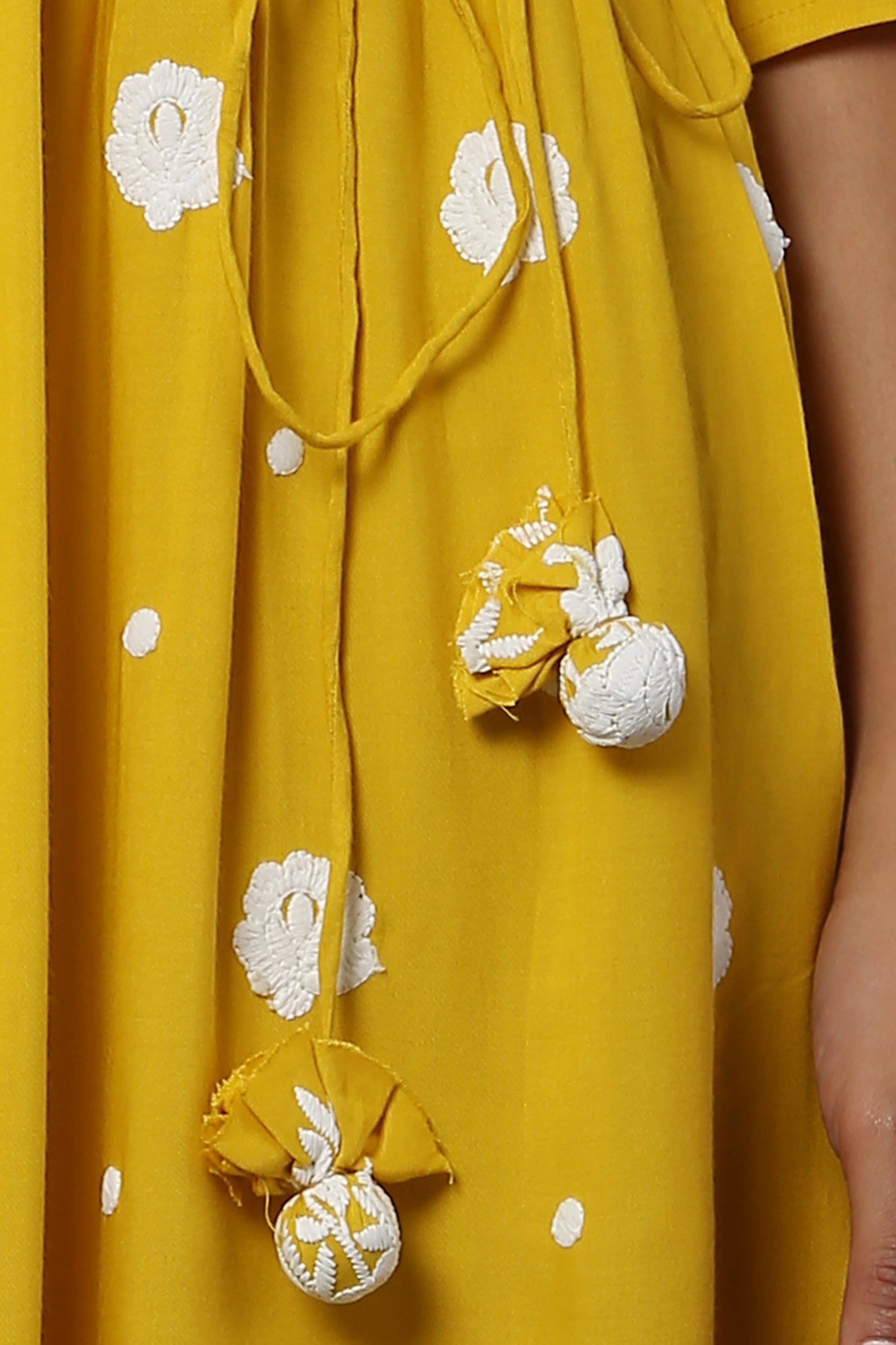 This season add vibrancy to your wardrobe with this beautiful Bright Yellow Embroidered Midi Dress. This wrap style dress, with lace embossed collars and potli's- tie at waist, is a unique style. Fashioned from soft cotton modal fabric, this dress promises supreme comfort all day long. You can style with heels and earrings for a classic look. It comes with a side zip that ensures a beautiful fit.
