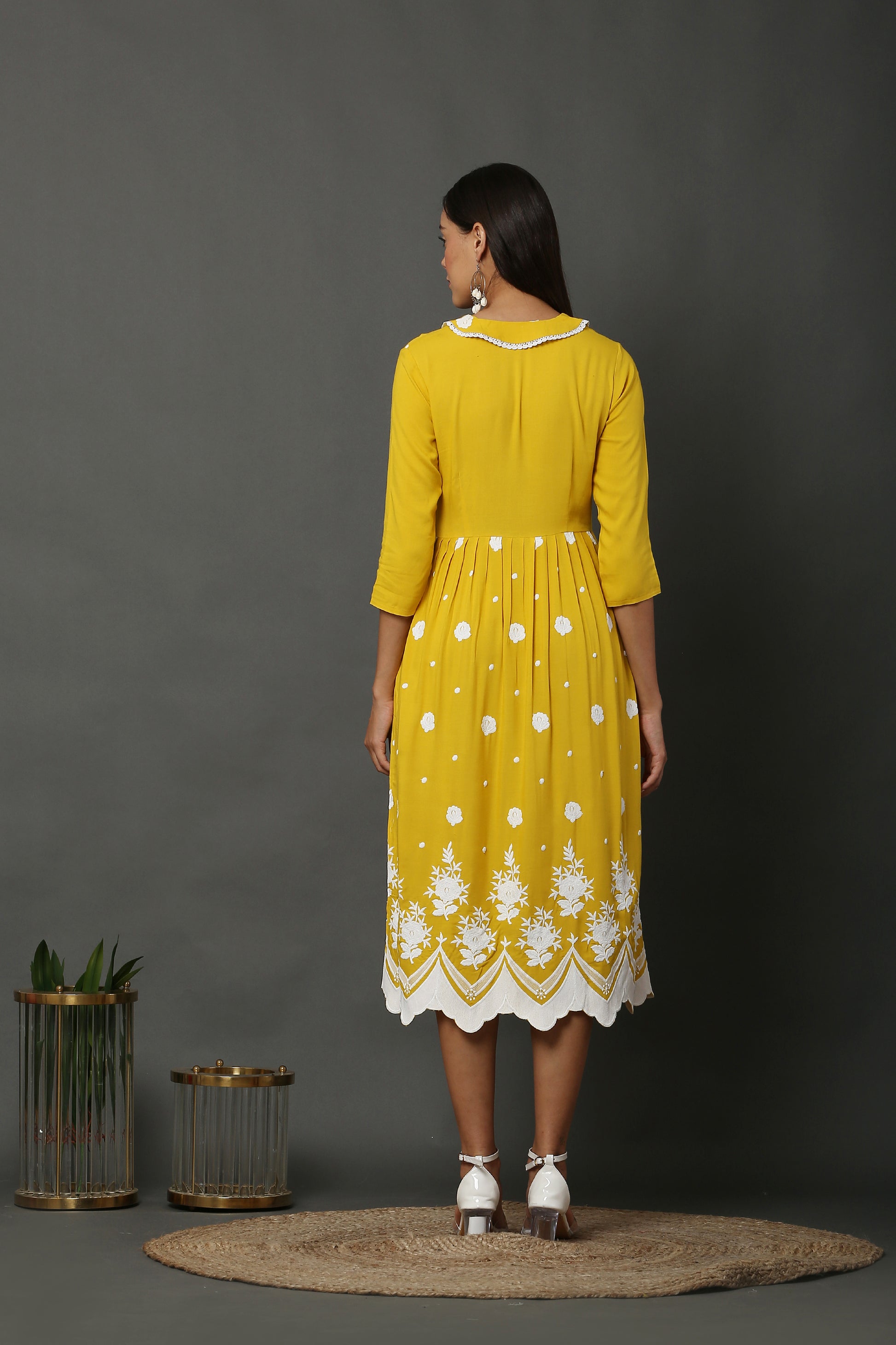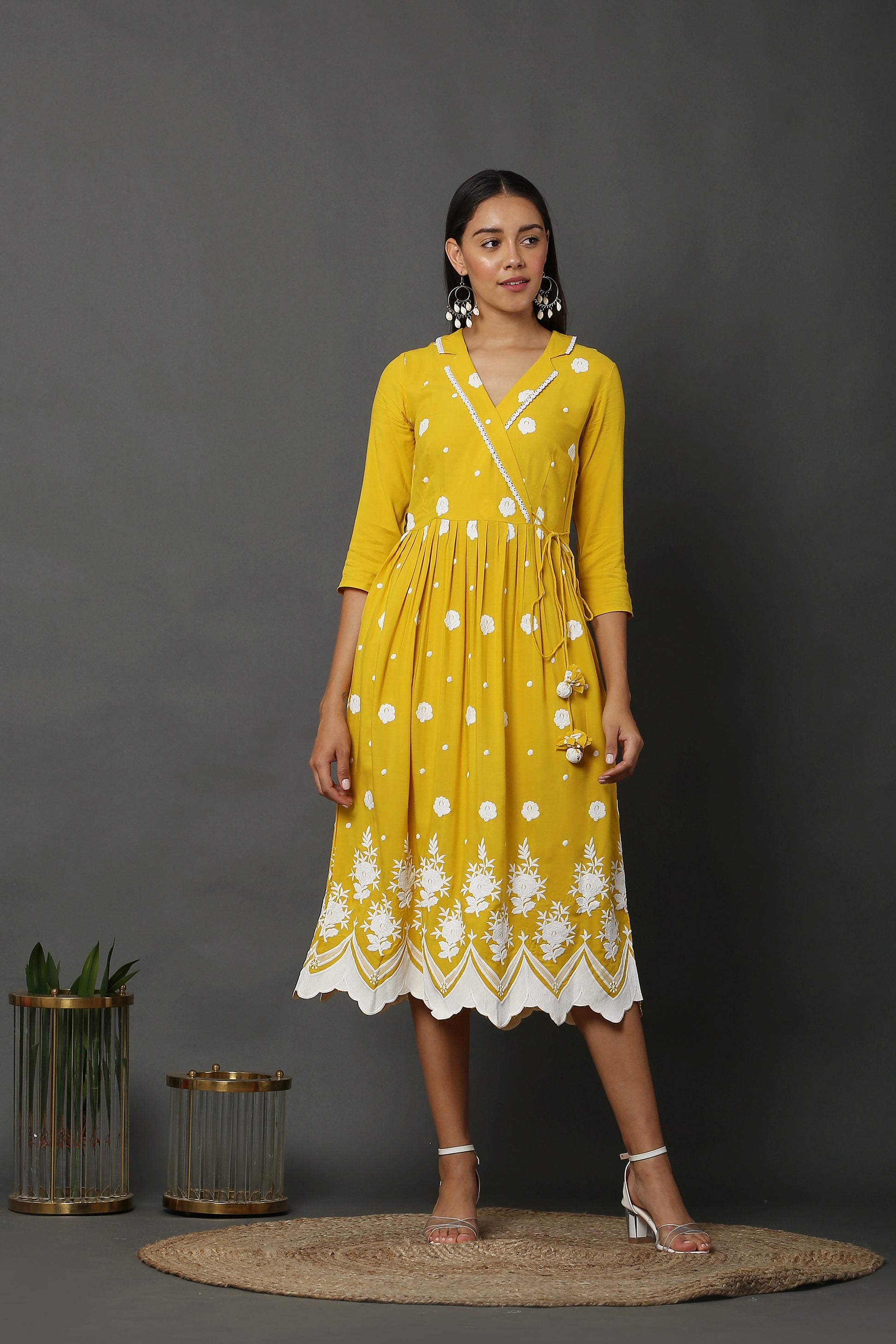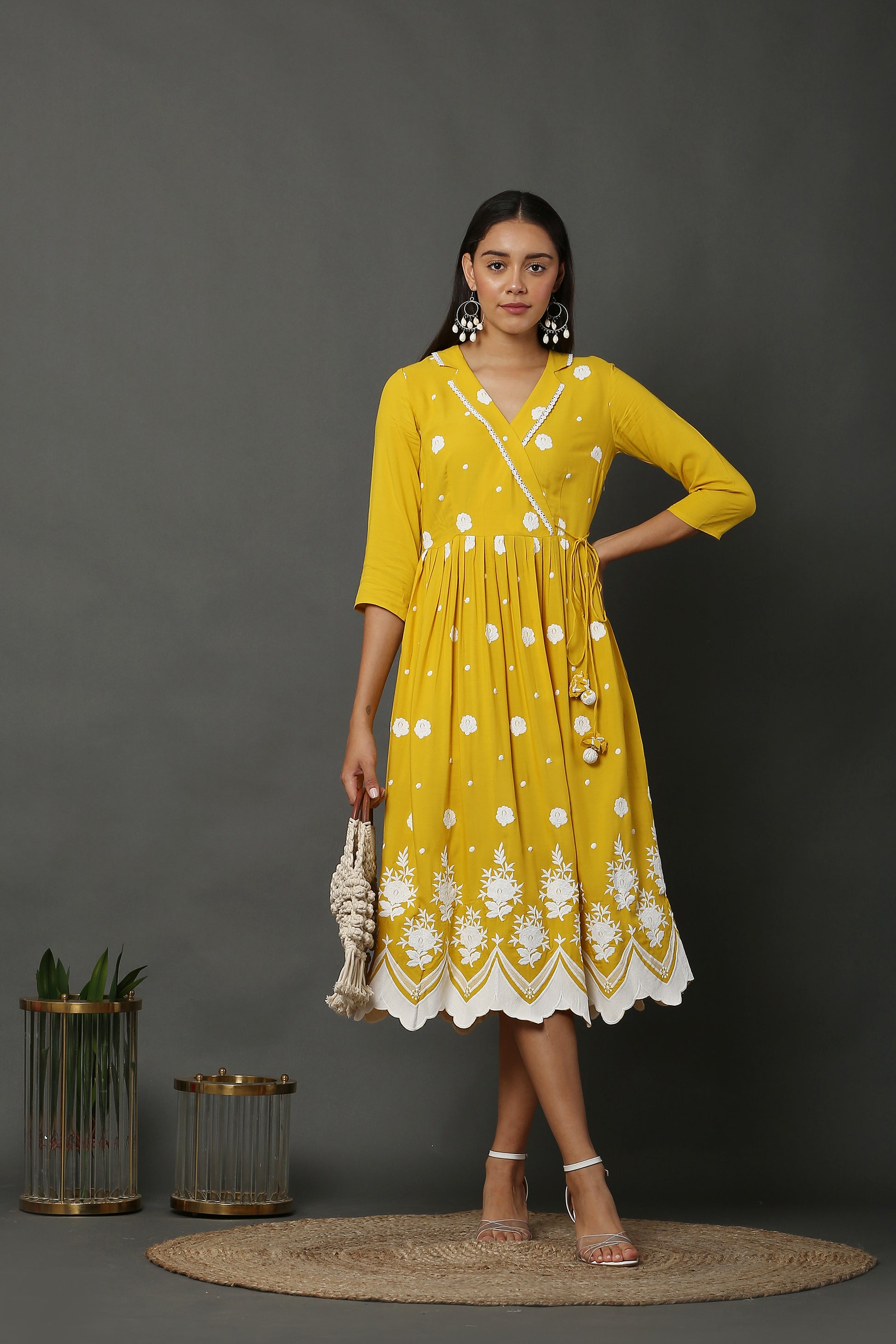 This season add vibrancy to your wardrobe with this beautiful Bright Yellow Embroidered Midi Dress. This wrap style dress, with lace embossed collars and potli's- tie at waist, is a unique style. Fashioned from soft cotton modal fabric, this dress promises supreme comfort all day long. You can style with heels and earrings for a classic look. It comes with a side zip that ensures a beautiful fit.