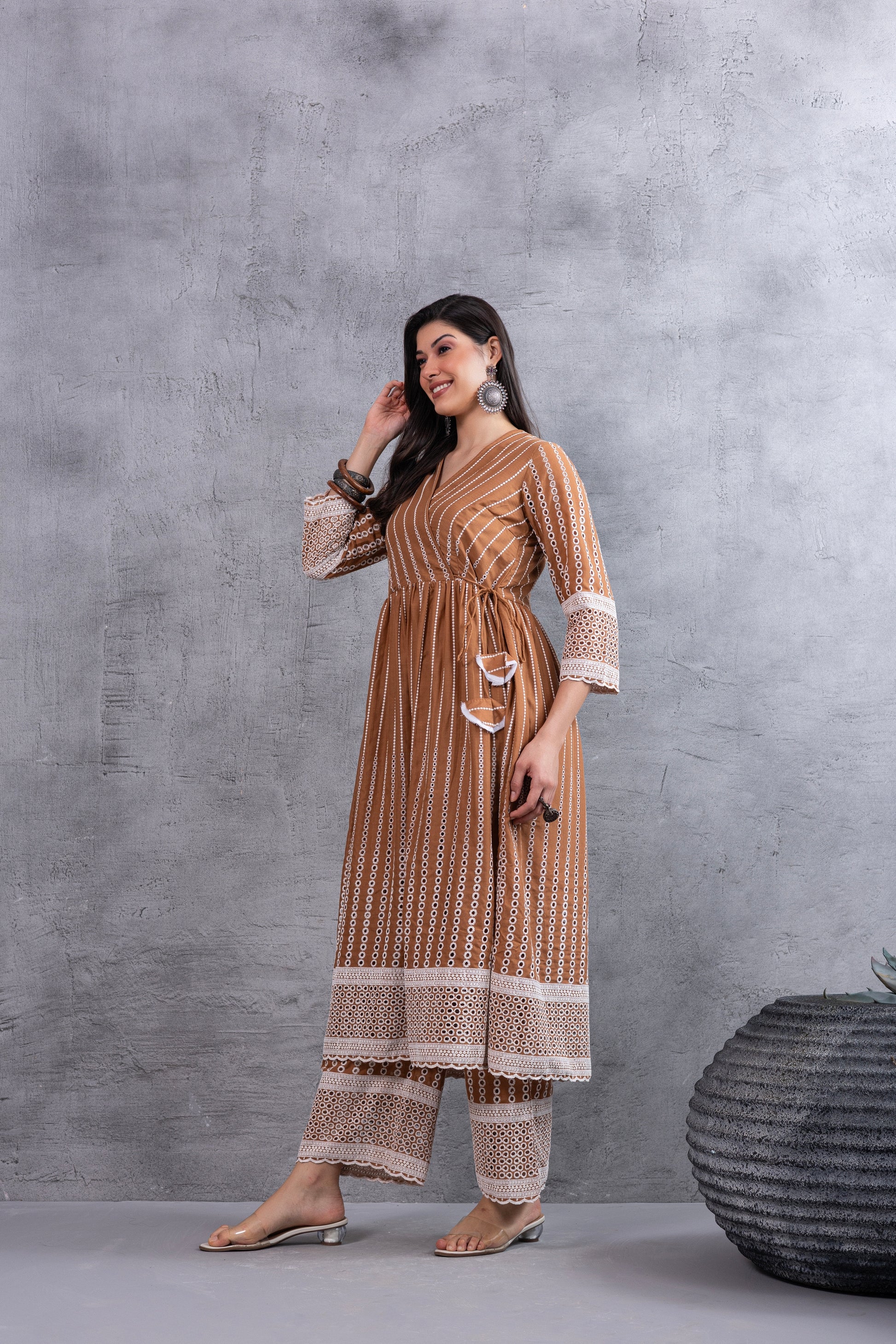 Make a style statement with our signature Angrakha-style Kurta Set, crafted in breathable cotton and elevated with intricate Schiffli embroidery. This Caramel Brown ensemble features a flattering wrap silhouette with tie-up tassel details at the waist, enhancing its traditional yet contemporary charm. The full sleeves and hem are highlighted with delicate cutwork-inspired embroidery, giving it a refined finish. Paired with matching scalloped hem pants, this set offers effortless elegance — perfect for festive gatherings, intimate celebrations, or standout everyday wear.