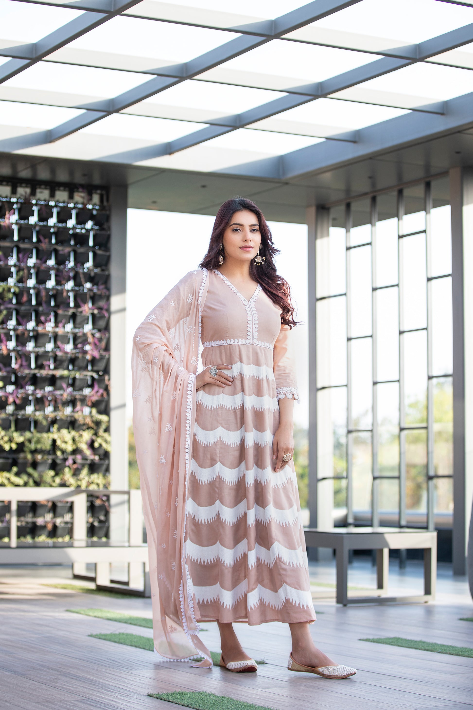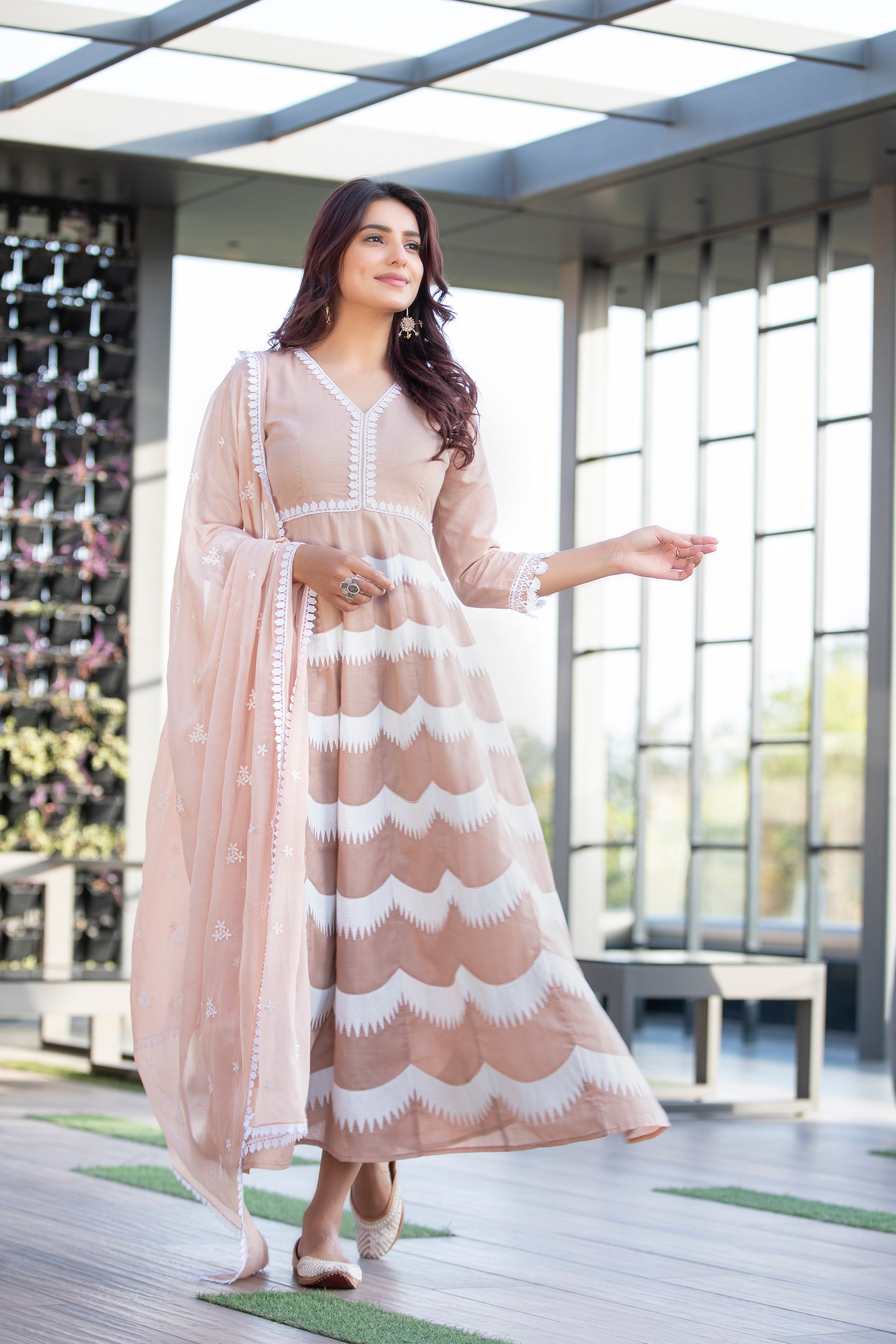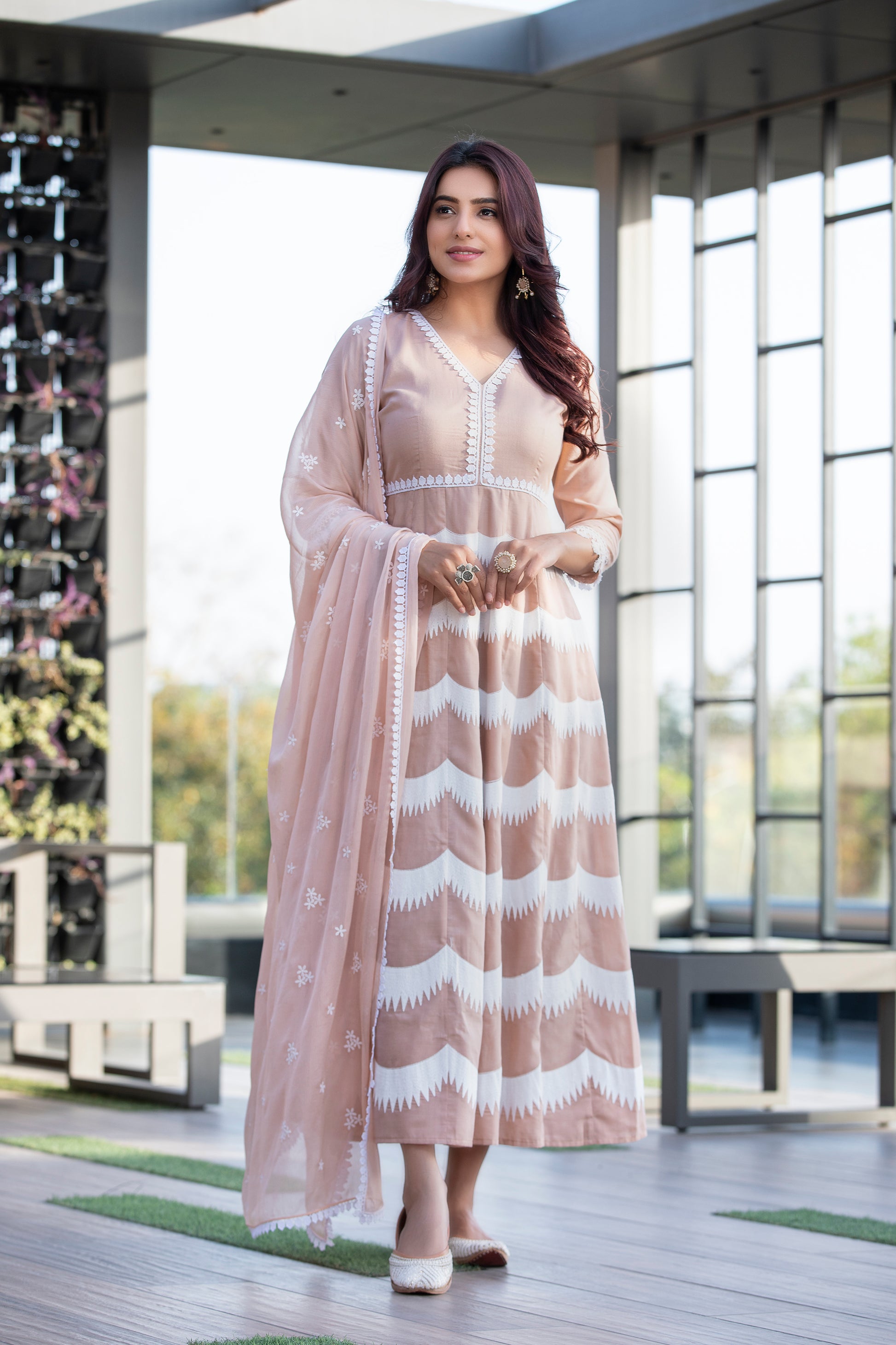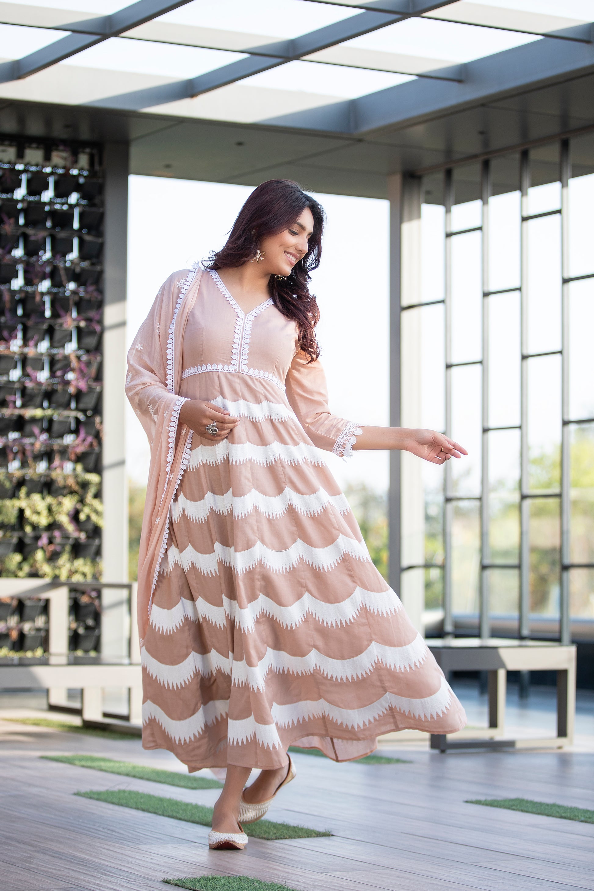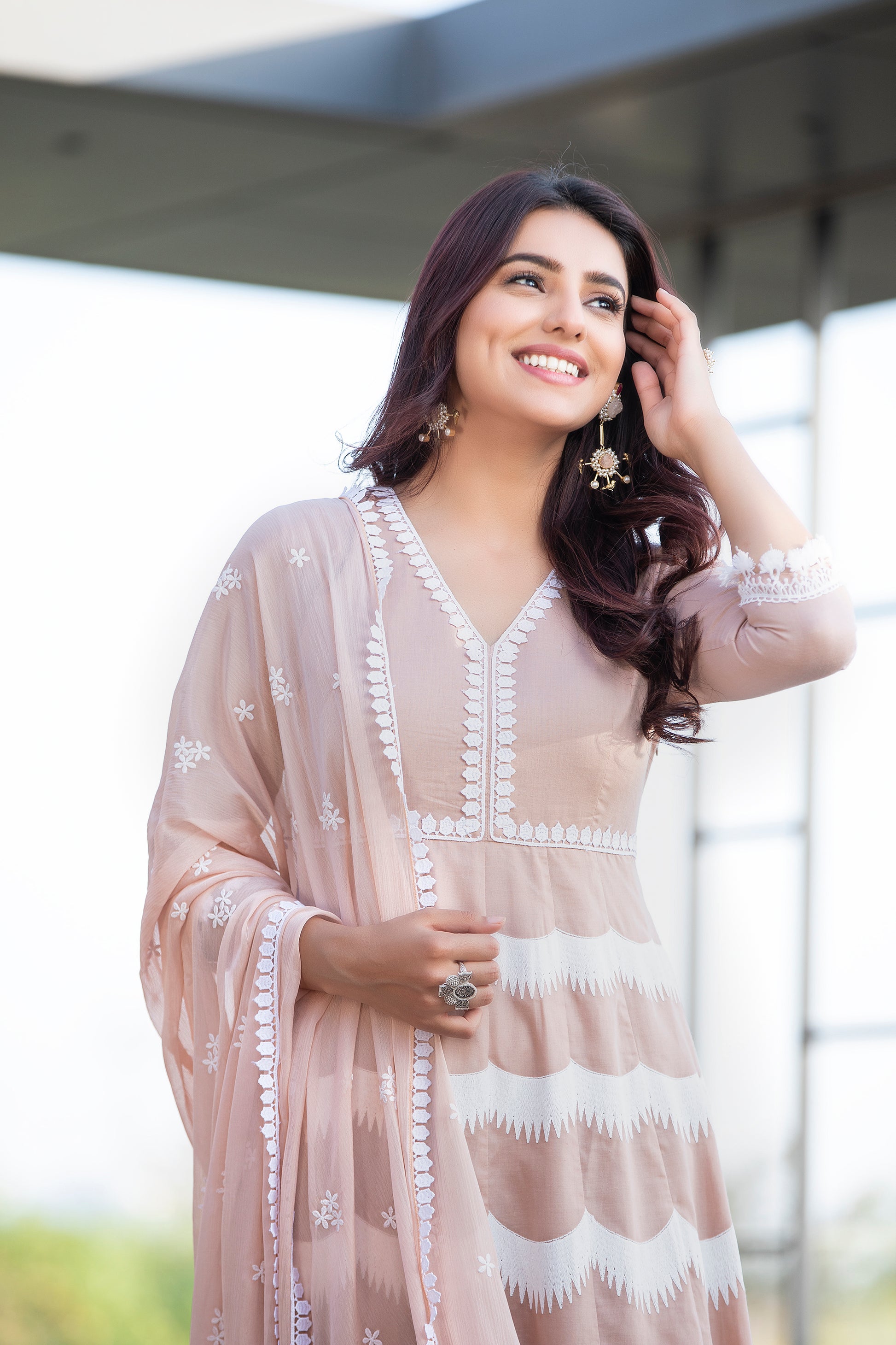 Give a fresh spin to your ethnic wardrobe with this gorgeous Caramel White Embroidered suit set. Enlivened with intricate floral lace outlined from neck till waist and on sleeves with the geometrical embroidery all over the kurta and flared palazzo, gives a beautiful fit and looks so feminine. The set comes with a matching chiffon dupatta with white embroidered floral motifs which just adds to its grace. Pair it with your favorite earrings and rock your festivities.