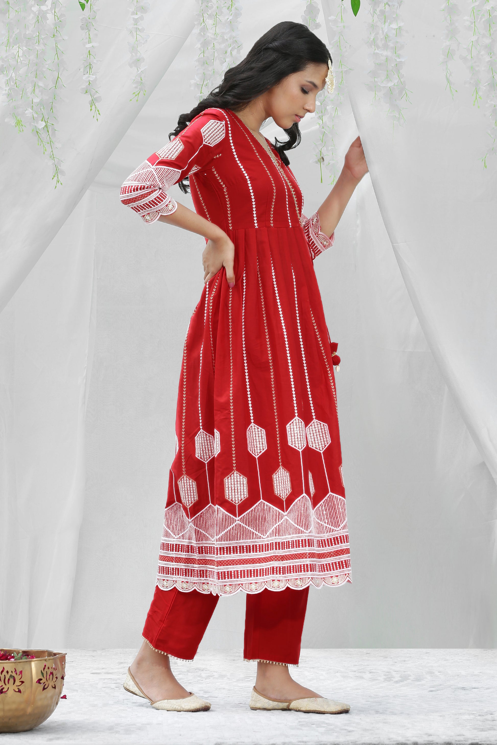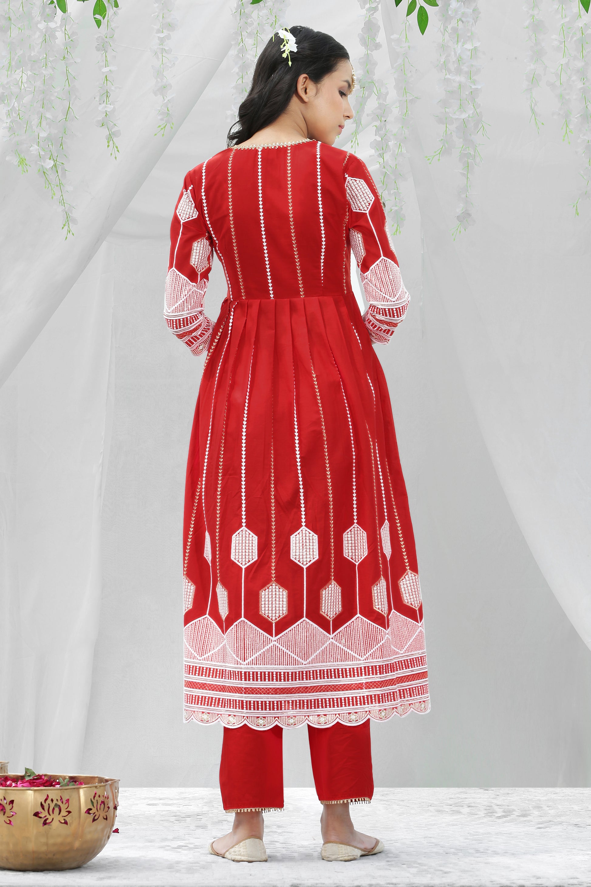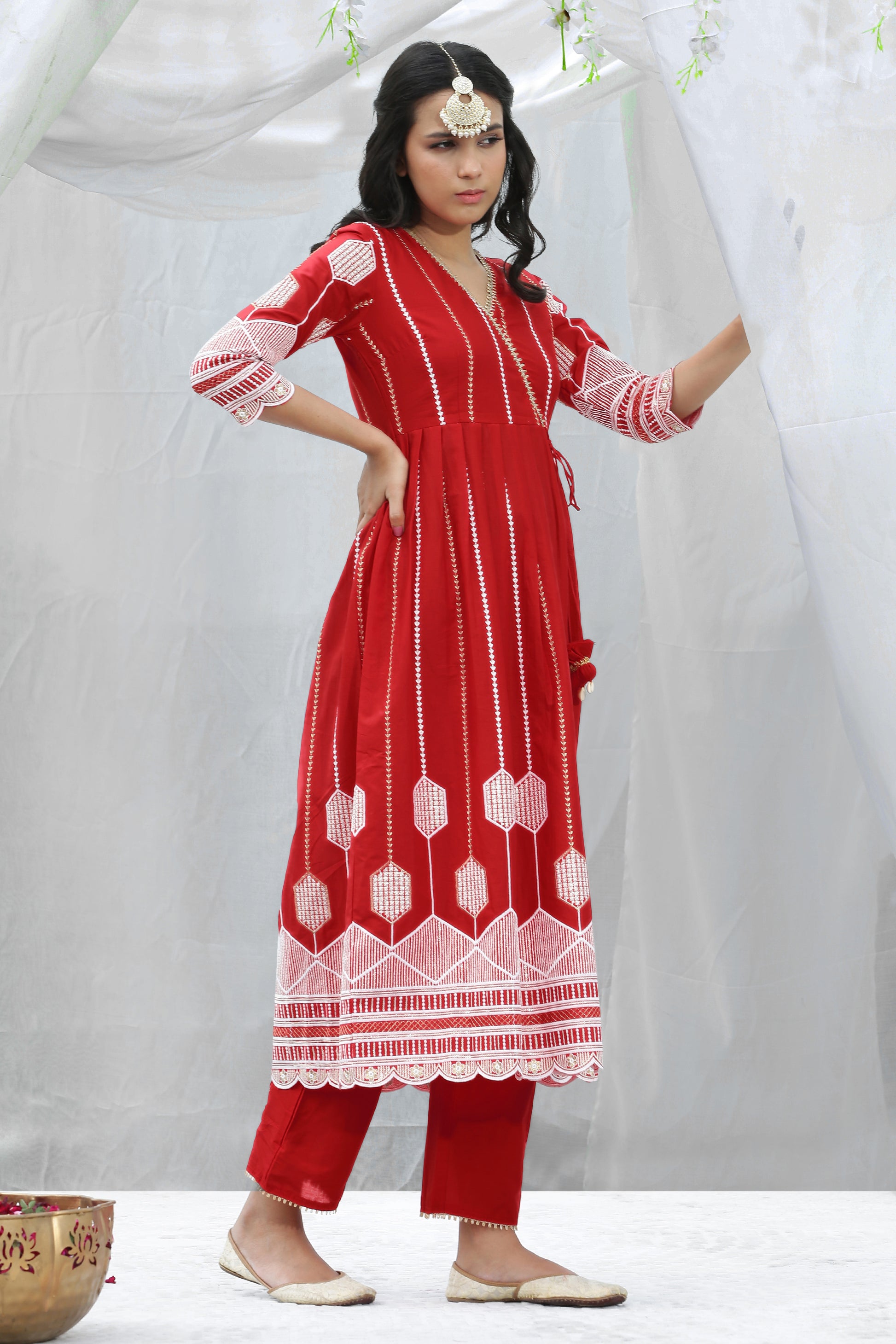 Discover our luxurious spring summer collection GULMOHAR, inspired by one of the most beautiful tropical tree of India - the Gul mohar Tree that blossoms colorful flowers and beautiful aroma in summers. Rich colors and floral embroideries that echoes the spirit of the season. Taking inspiration from crystal , meaning both "ice" and "rock", this kurta set is embroidered with white and gold threads along with gold sequence creating an illuminating effect along with internal symmetry.