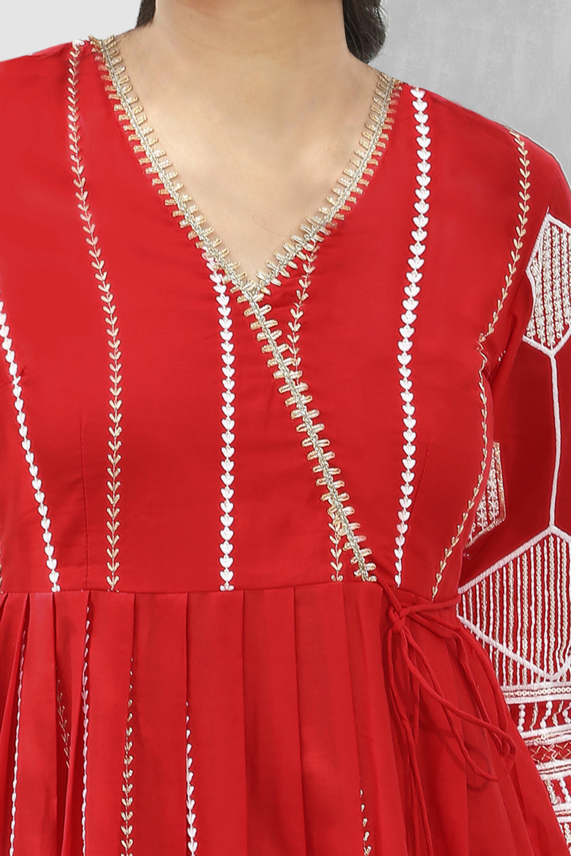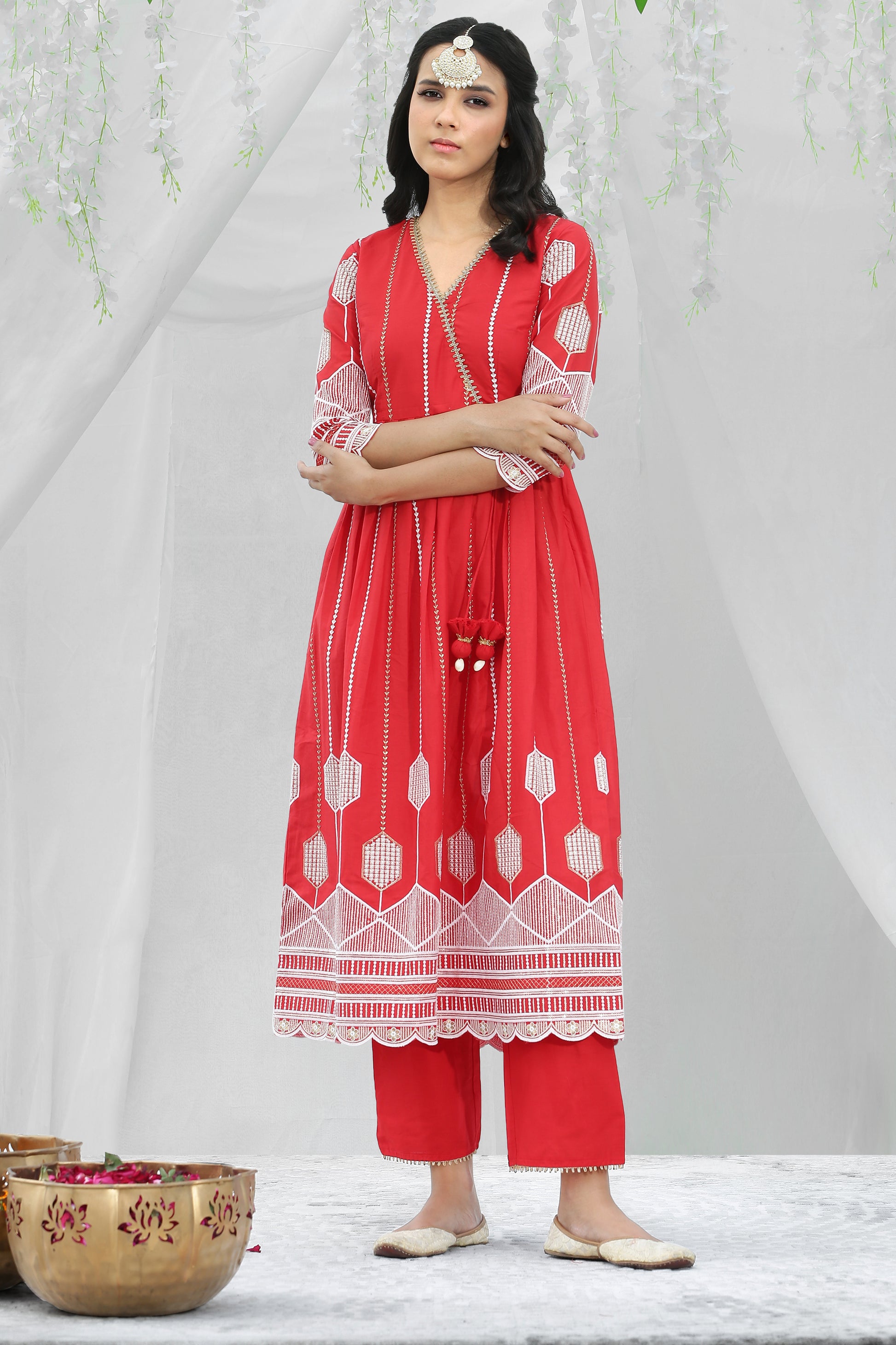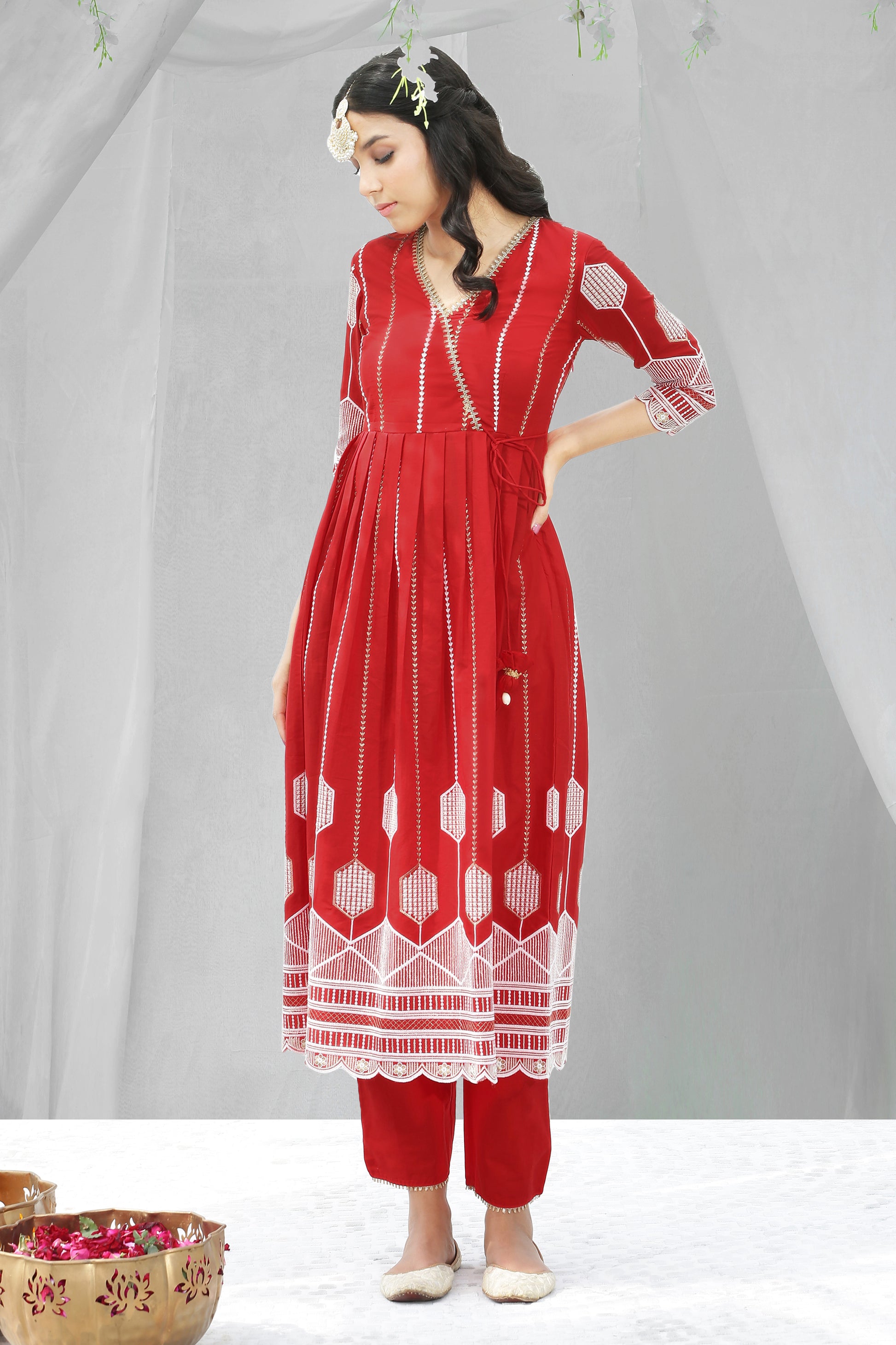 Discover our luxurious spring summer collection GULMOHAR, inspired by one of the most beautiful tropical tree of India - the Gul mohar Tree that blossoms colorful flowers and beautiful aroma in summers. Rich colors and floral embroideries that echoes the spirit of the season. Taking inspiration from crystal , meaning both "ice" and "rock", this kurta set is embroidered with white and gold threads along with gold sequence creating an illuminating effect along with internal symmetry.