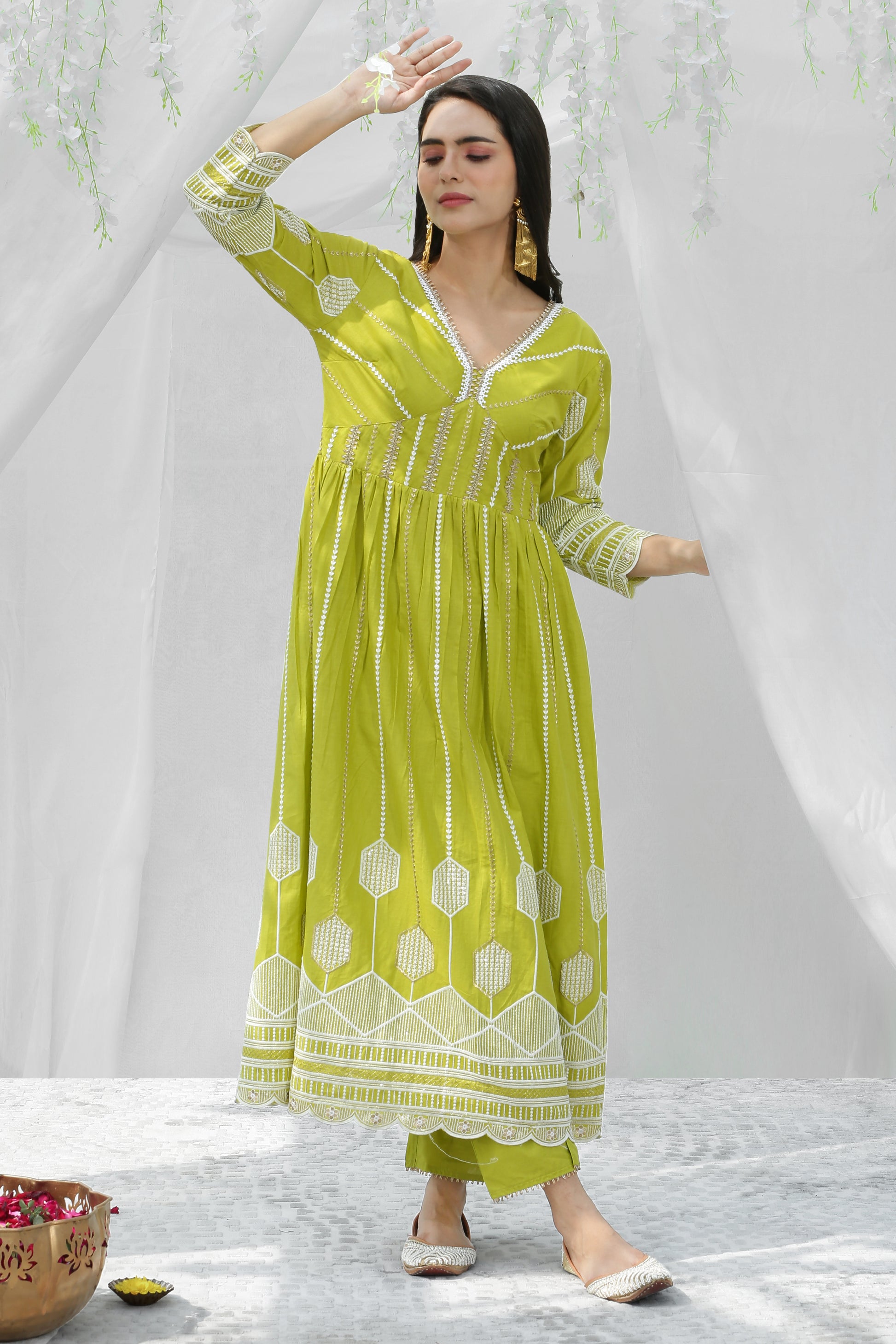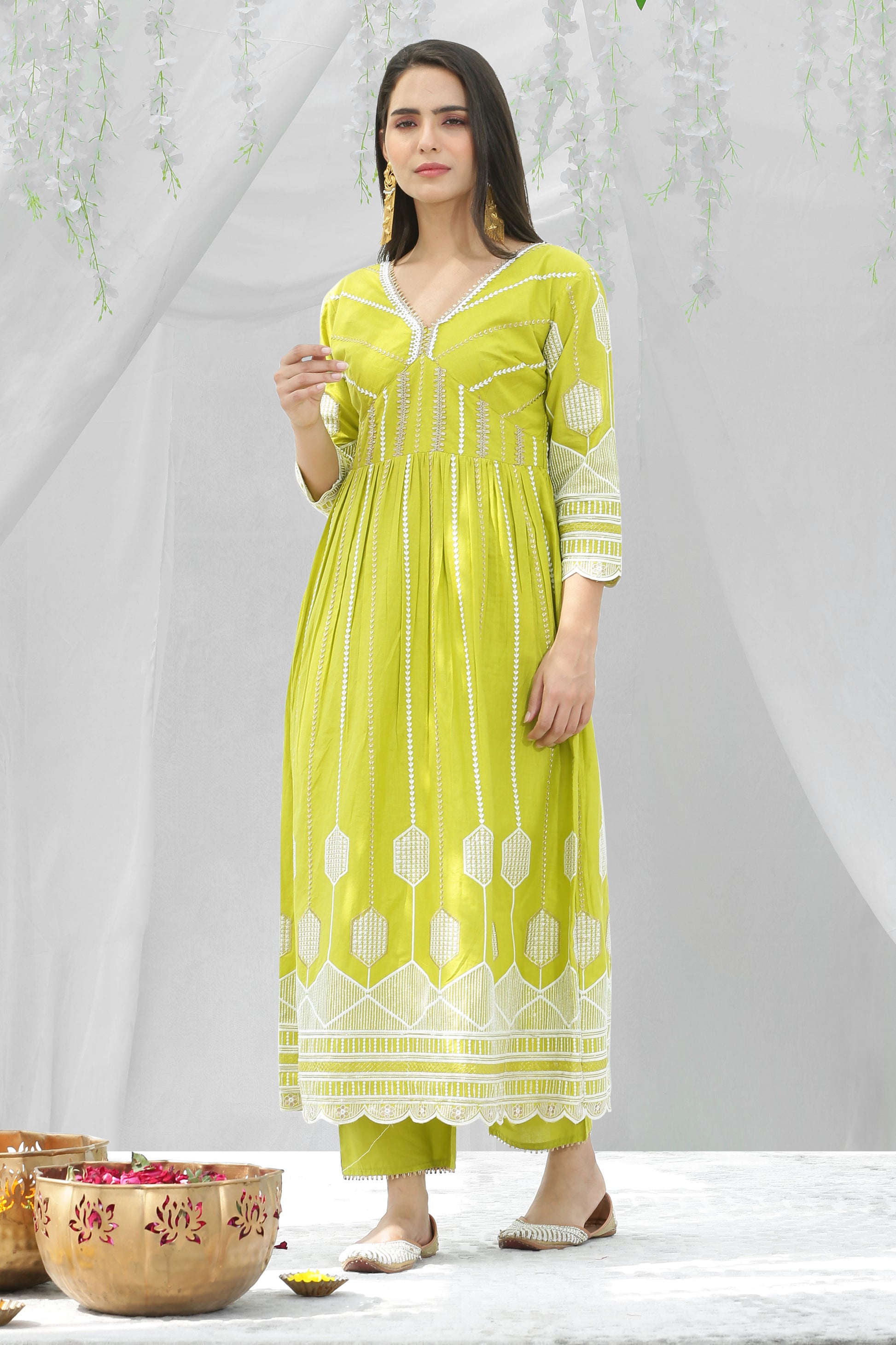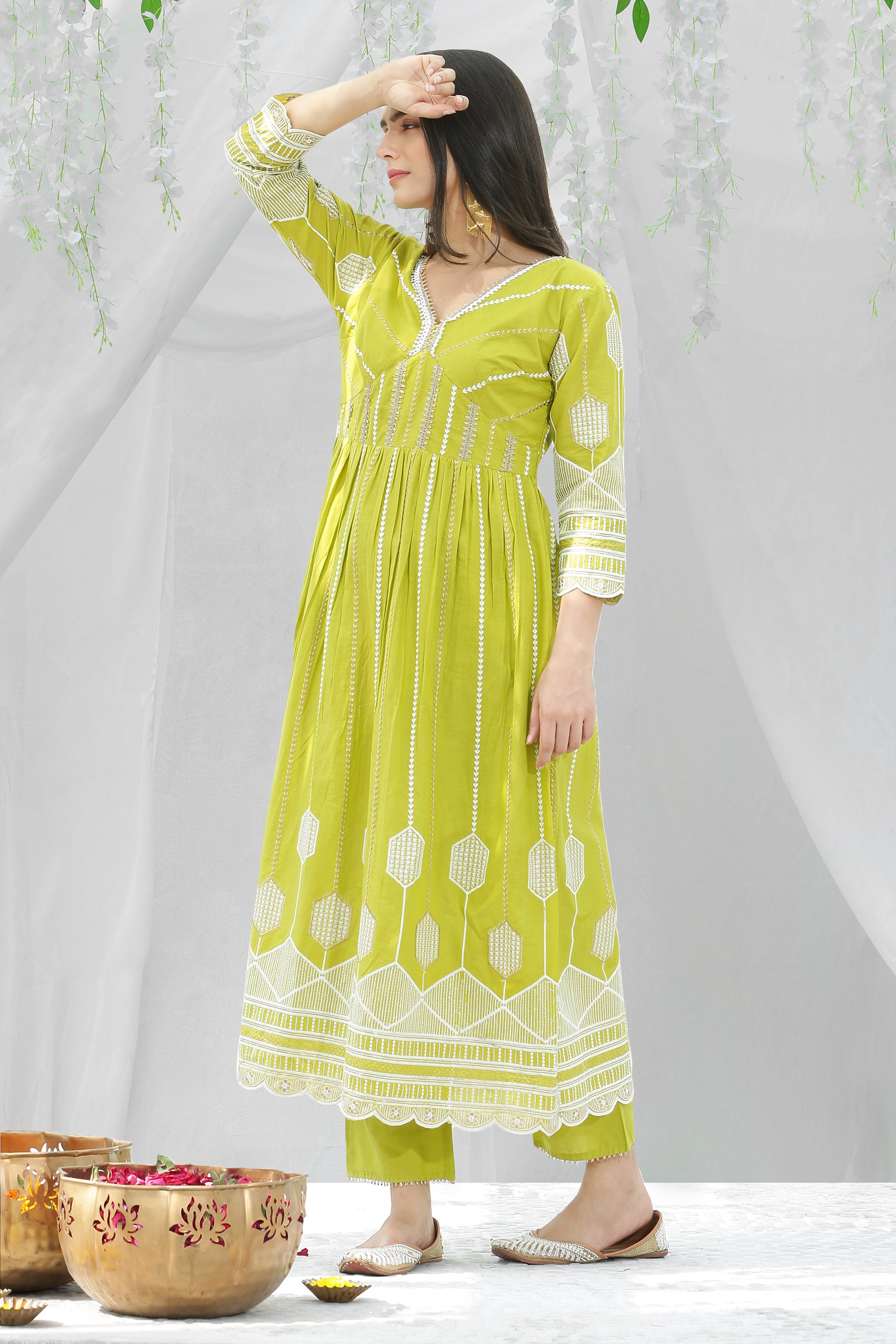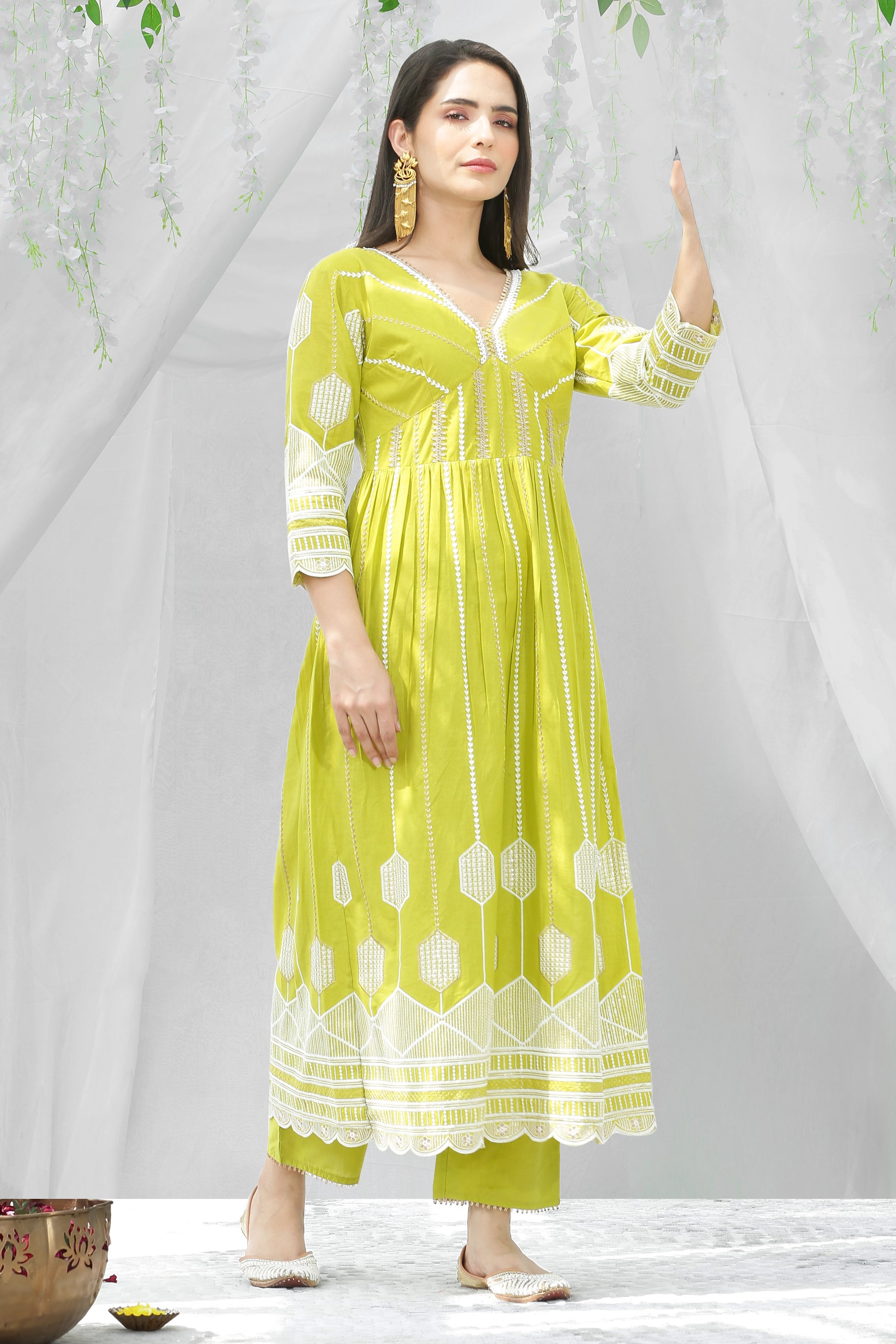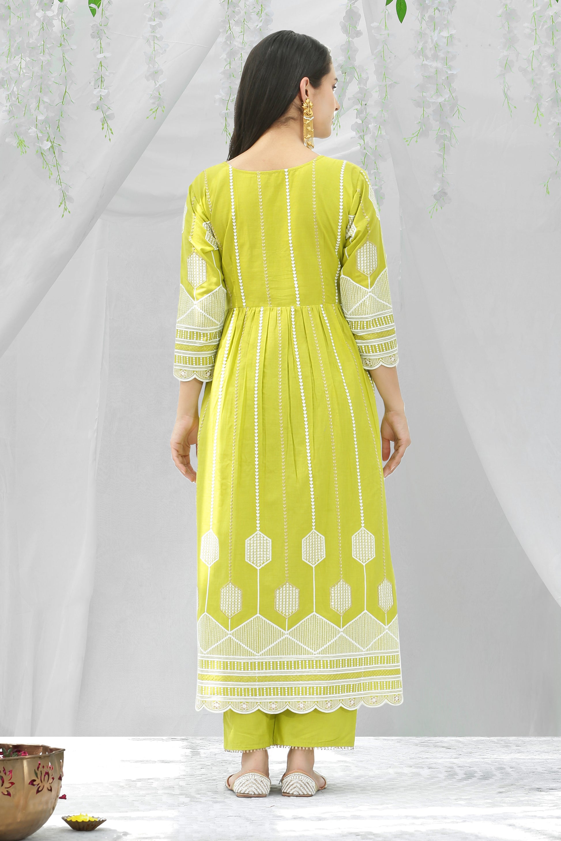 Lime And Gold Chikankari Embroidered Kurta Set