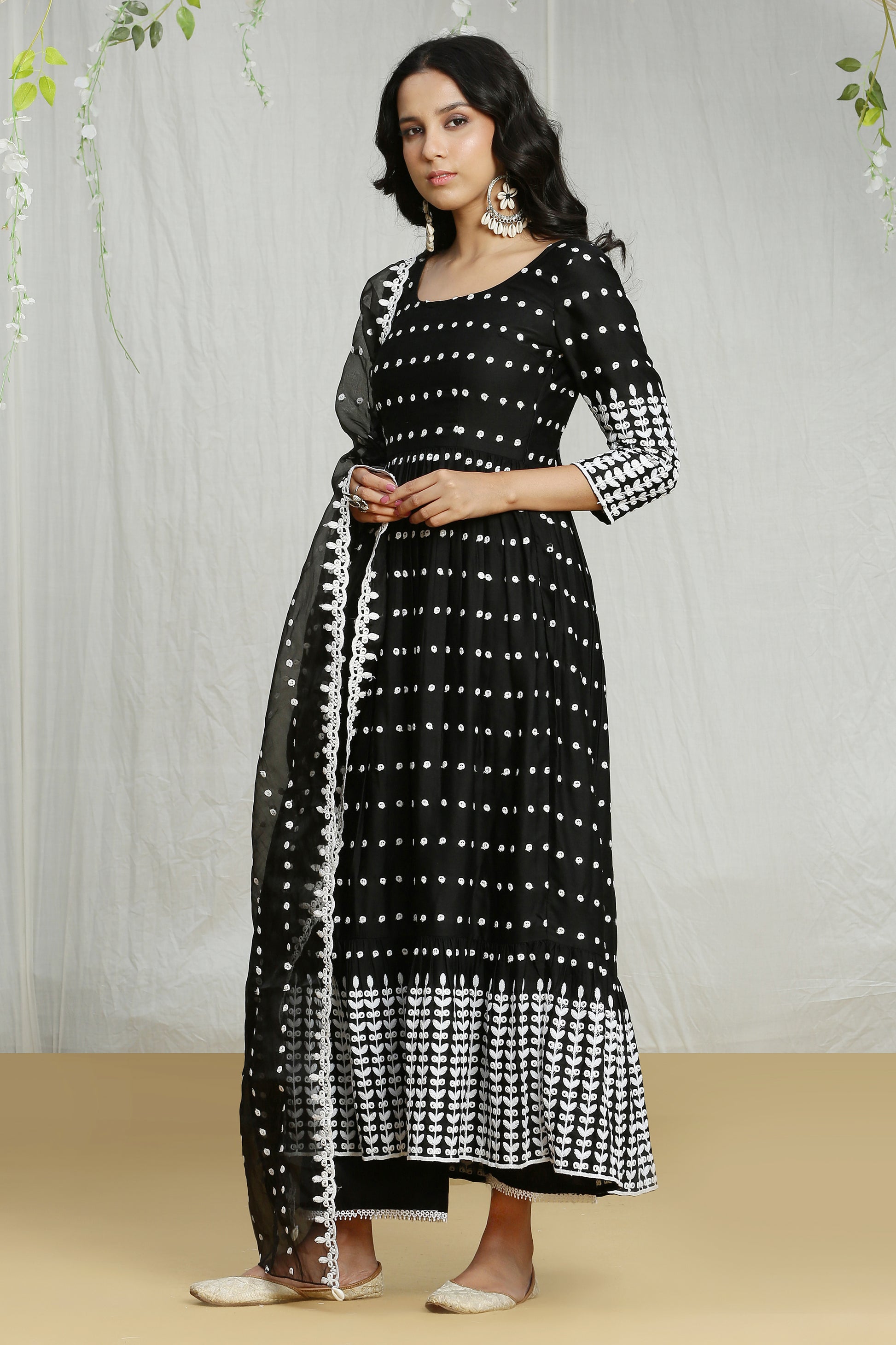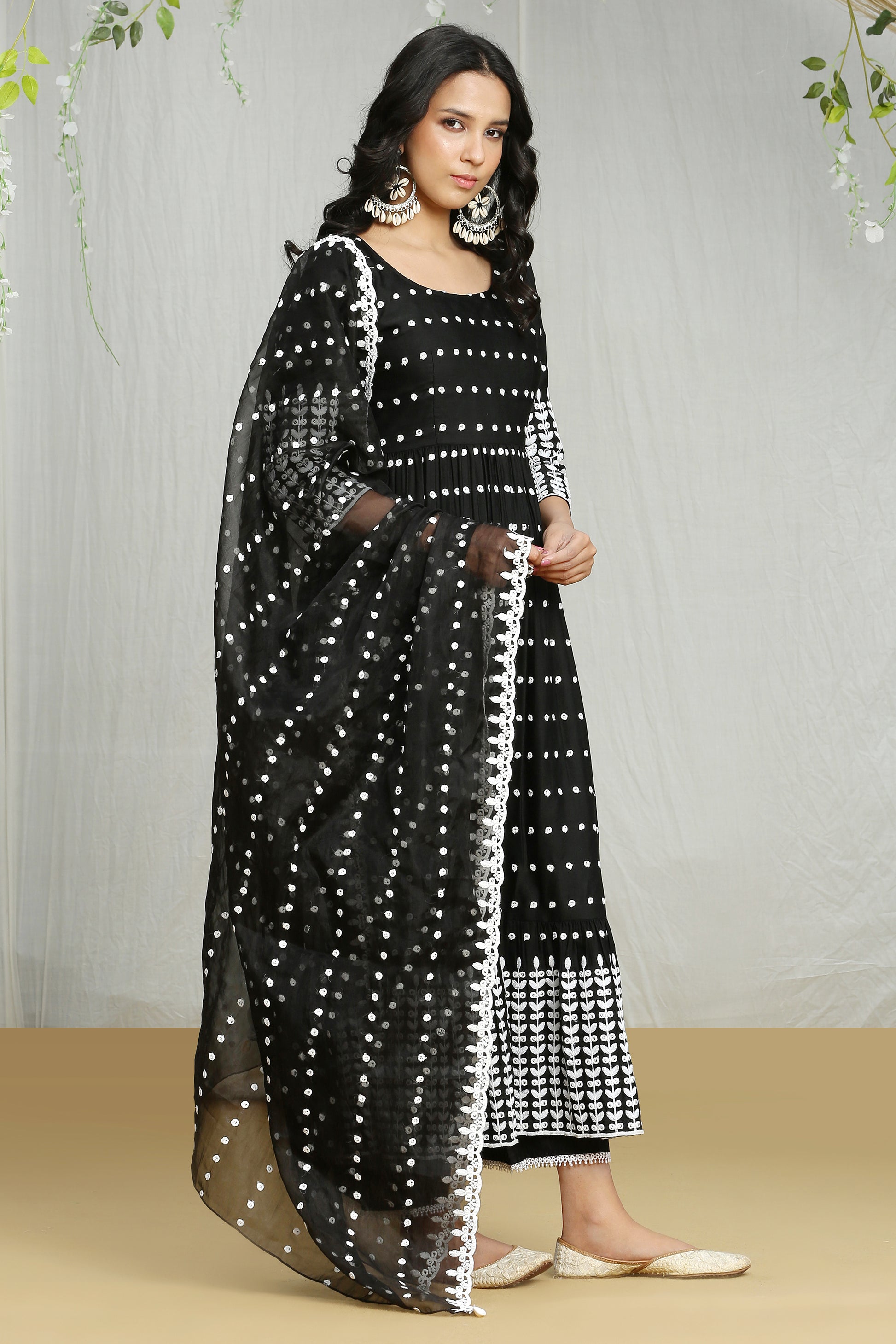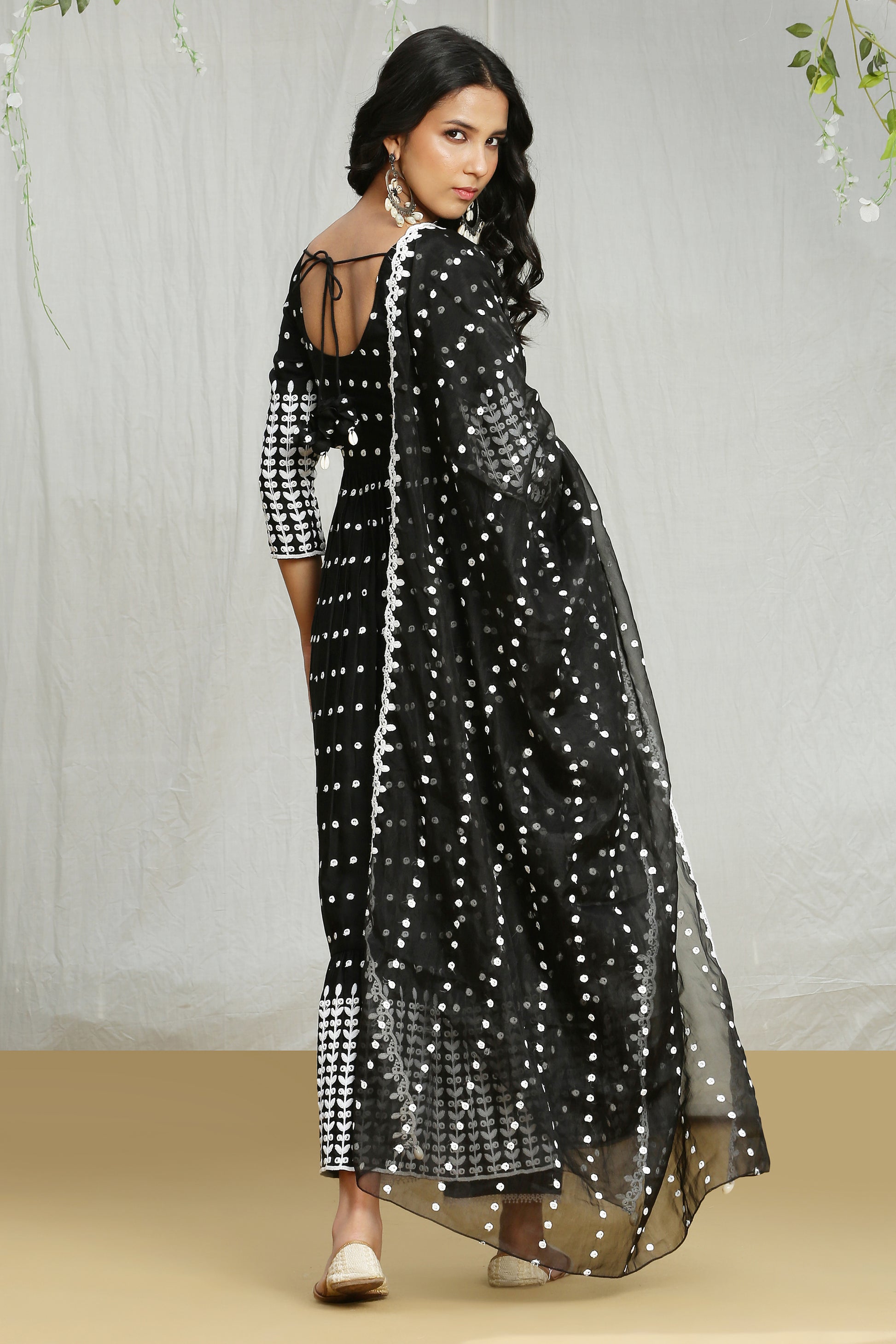 Black Buti Embroidered Kurta Set with Organza Dupatta