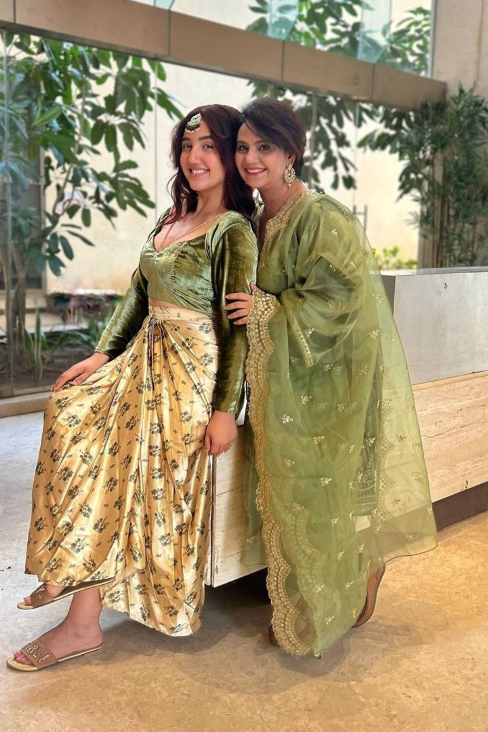 Dark Green Velvet Crop Top and Printed Skirt Set