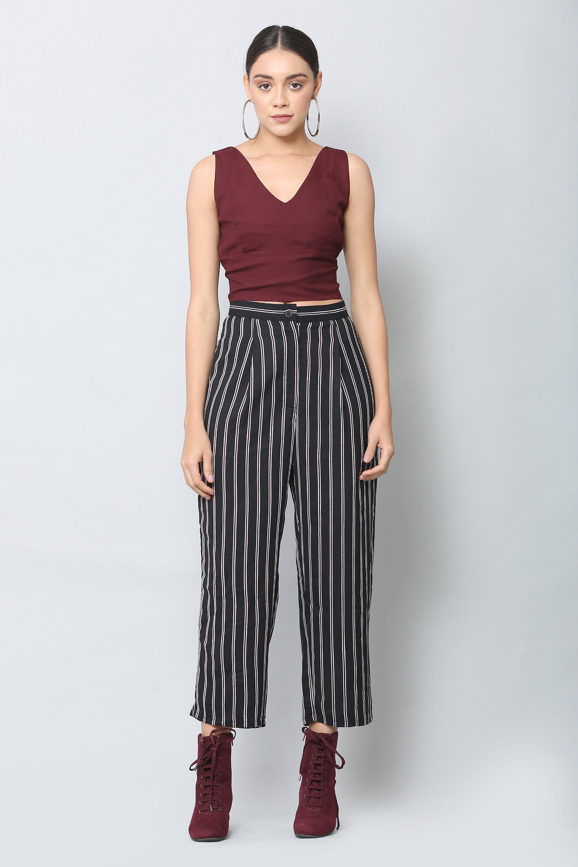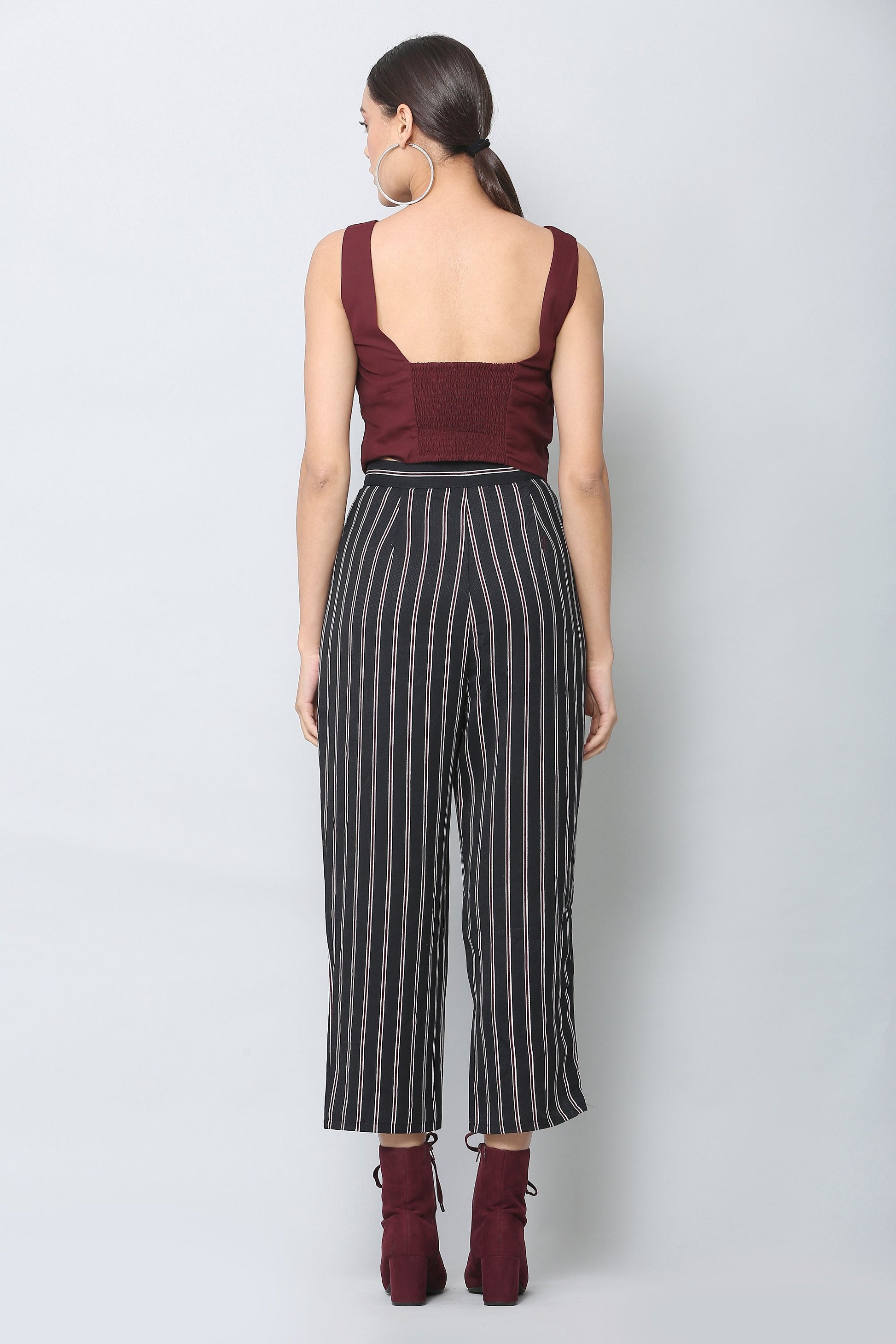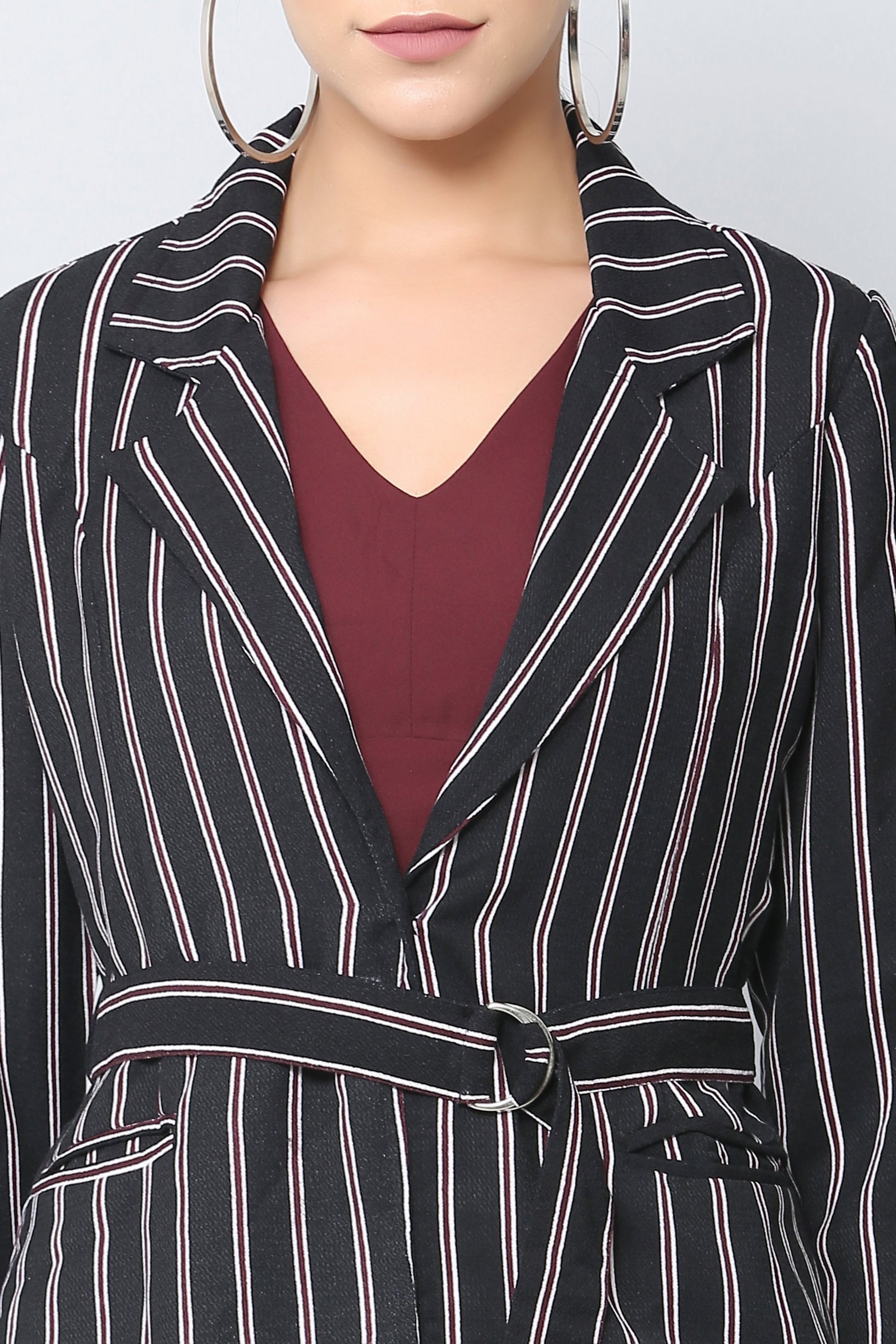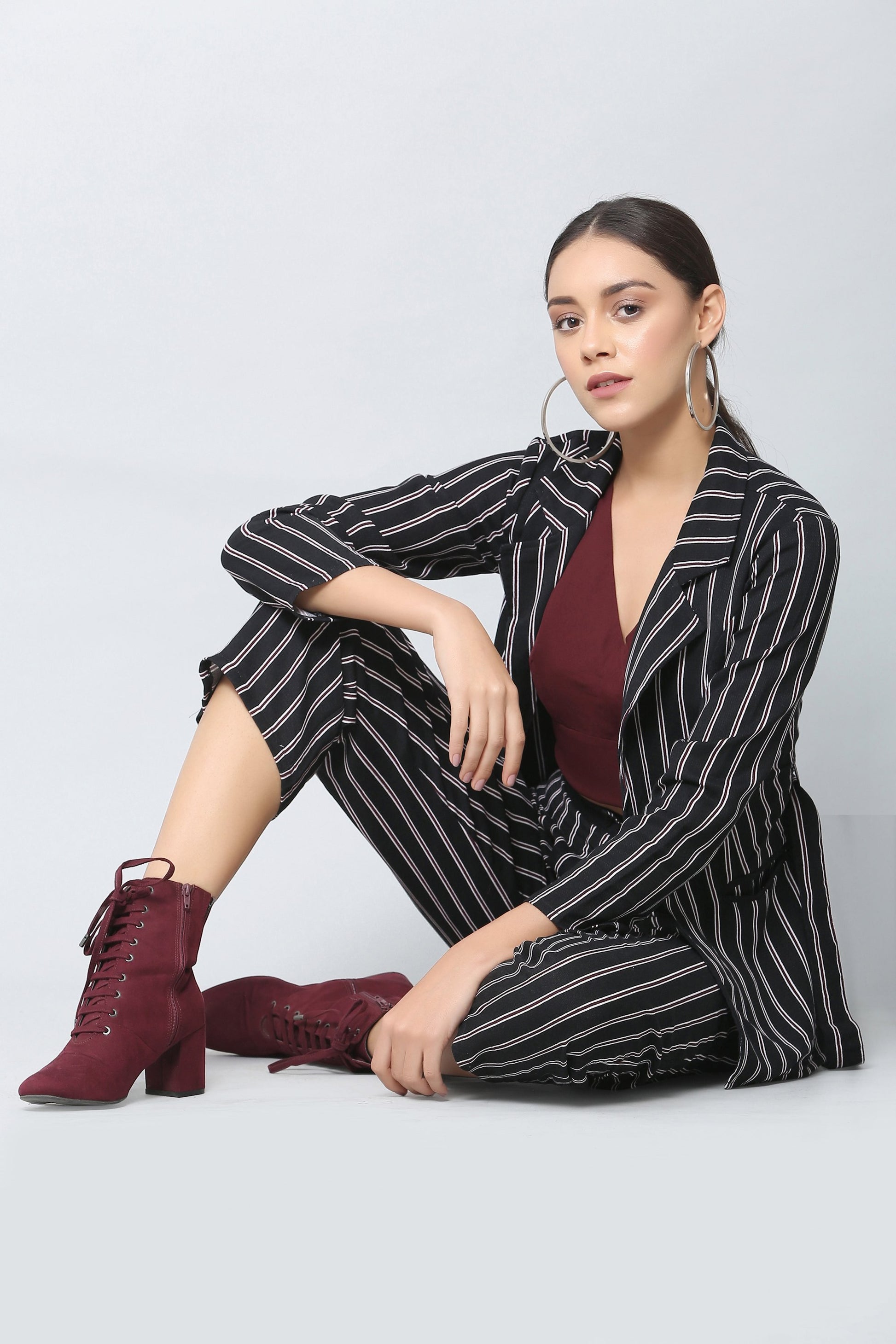 Garner the attention of the fashion freaks wearing this Dark Navy Striped Co-ord Set from SEW. This trendy set will be your best pick this winter season, Its sassy, edgy and effortless to carry. The trench coat has a relax fit and slit at back that takes the shape of your body with matching belt to adjust to your waistline, crisp collars, dual pockets and long sleeves to add the style quotient to it. The pants are very comfortable and with belt loops you can adjust the waist fit as per your fit. This set is funk, hideous and effortless to wear. Wear it to your parties and look your best.