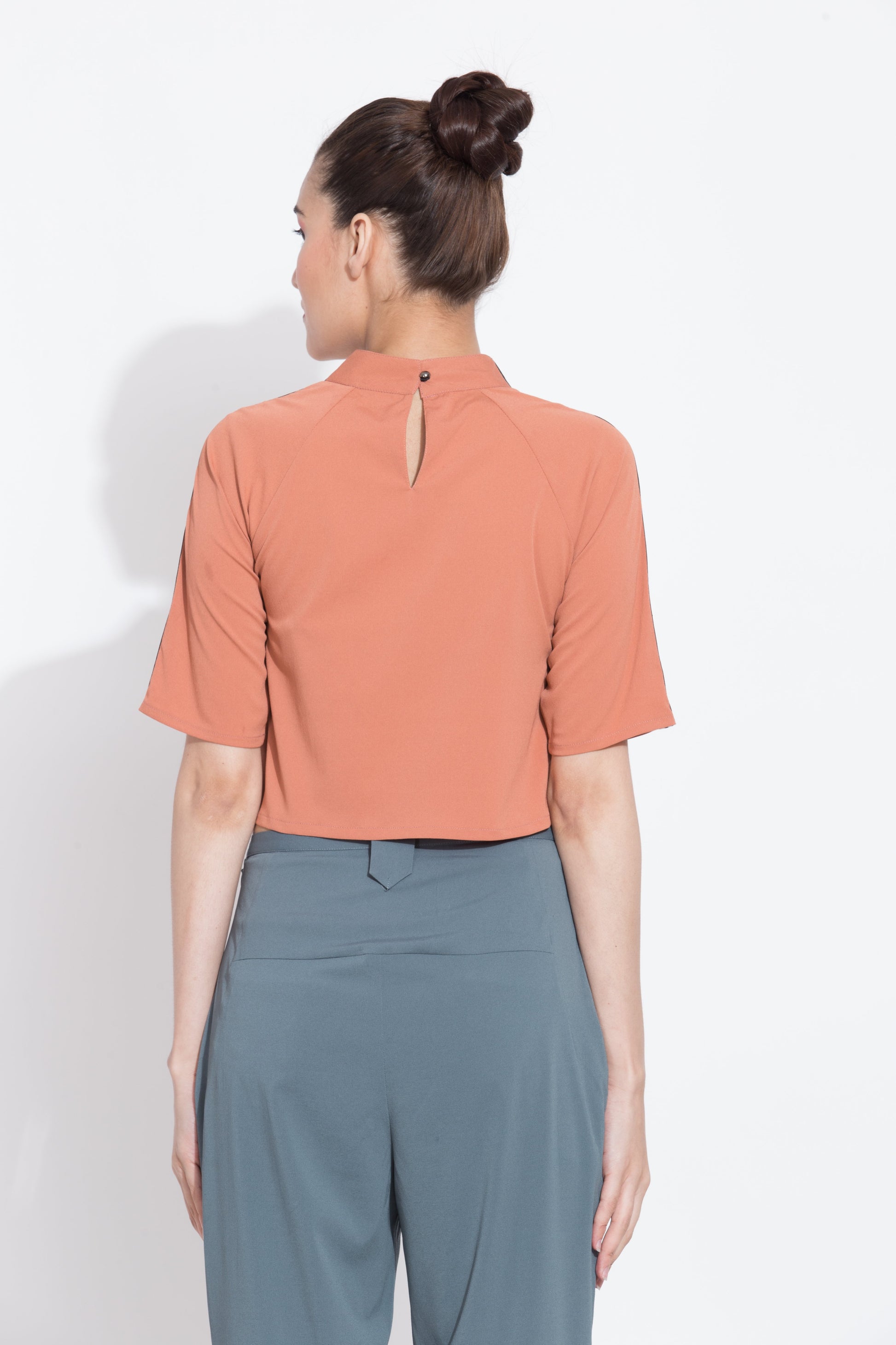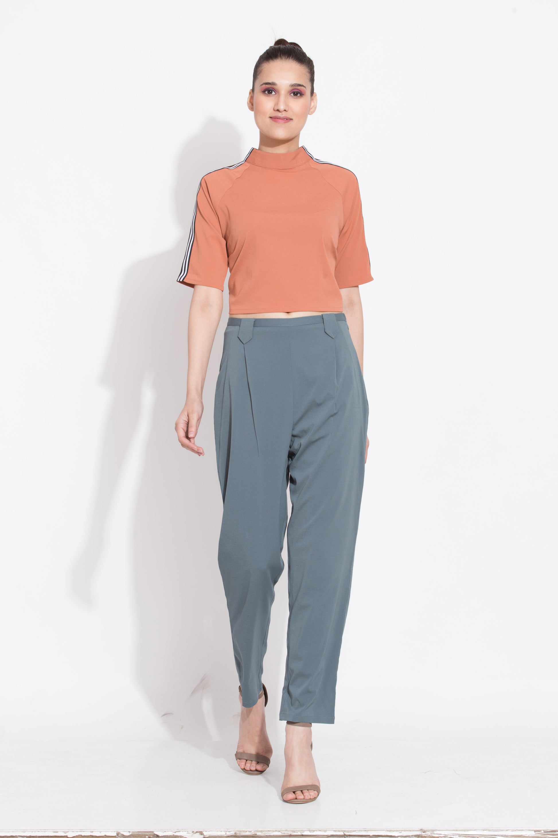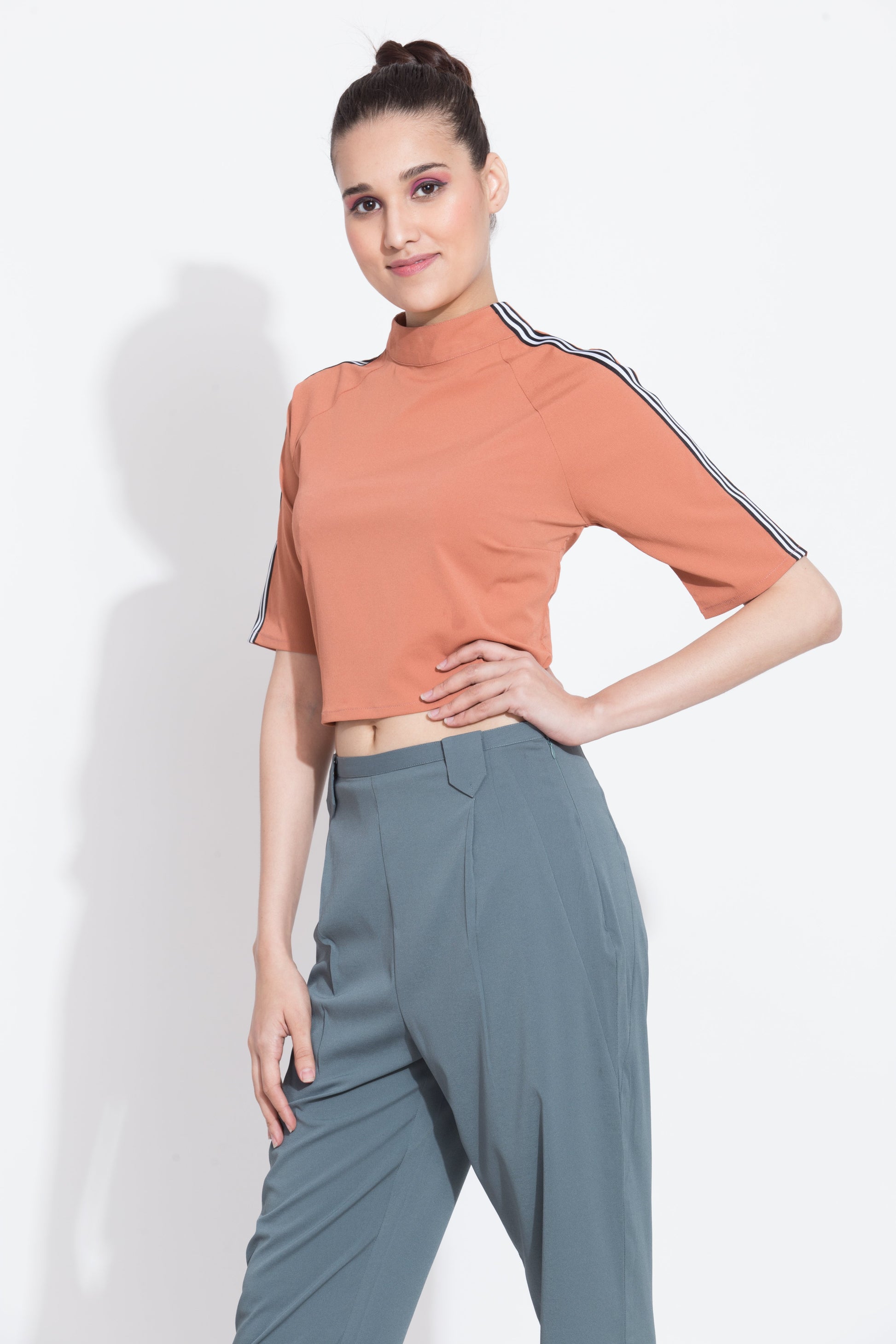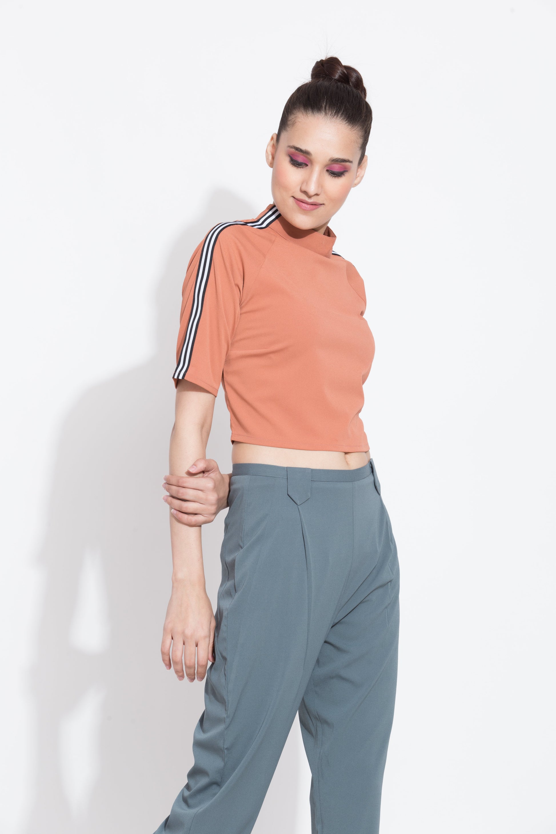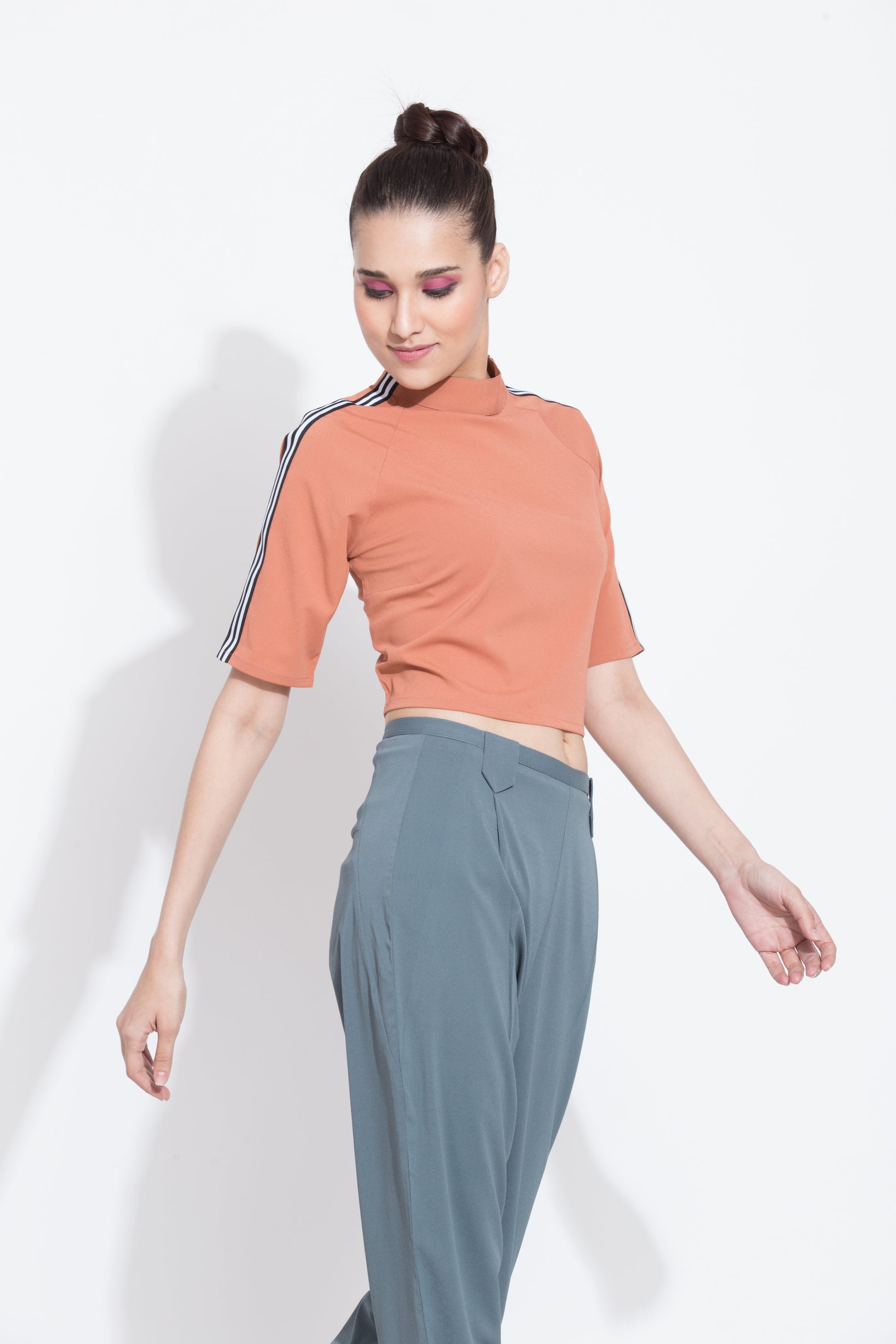 Stitched with excellence, this flamingo pink striped sleeve crop top is a timeless fashion staple. The beautiful striped band detailing from collar to sleeves, breaking the monotone of the top is a beautiful pattern. Made from poly moss fabric, the fabric has stretch in it and fits the body really well. For a perfect match, we have paired it with our grey pants to create a perfect evening look.