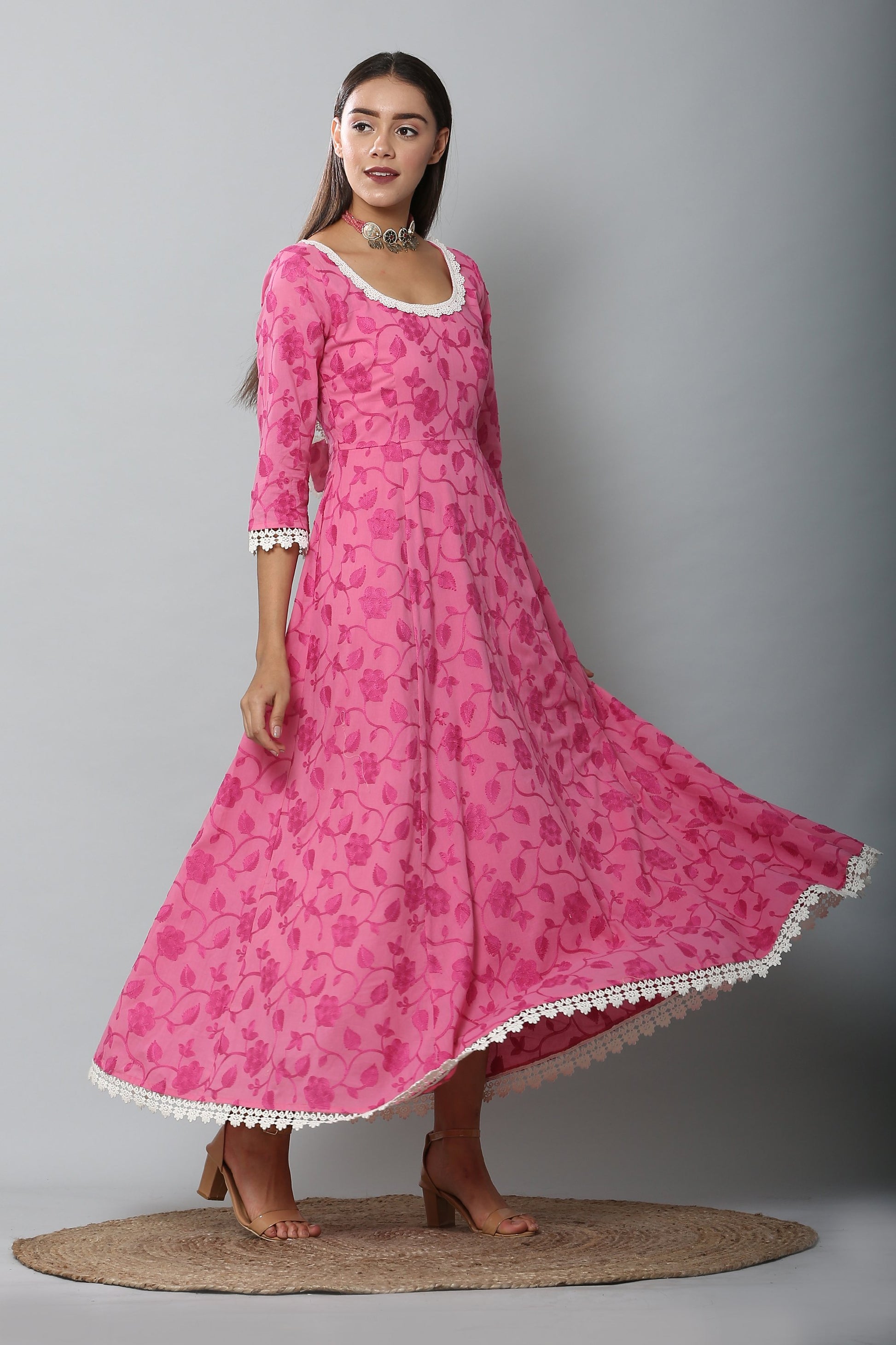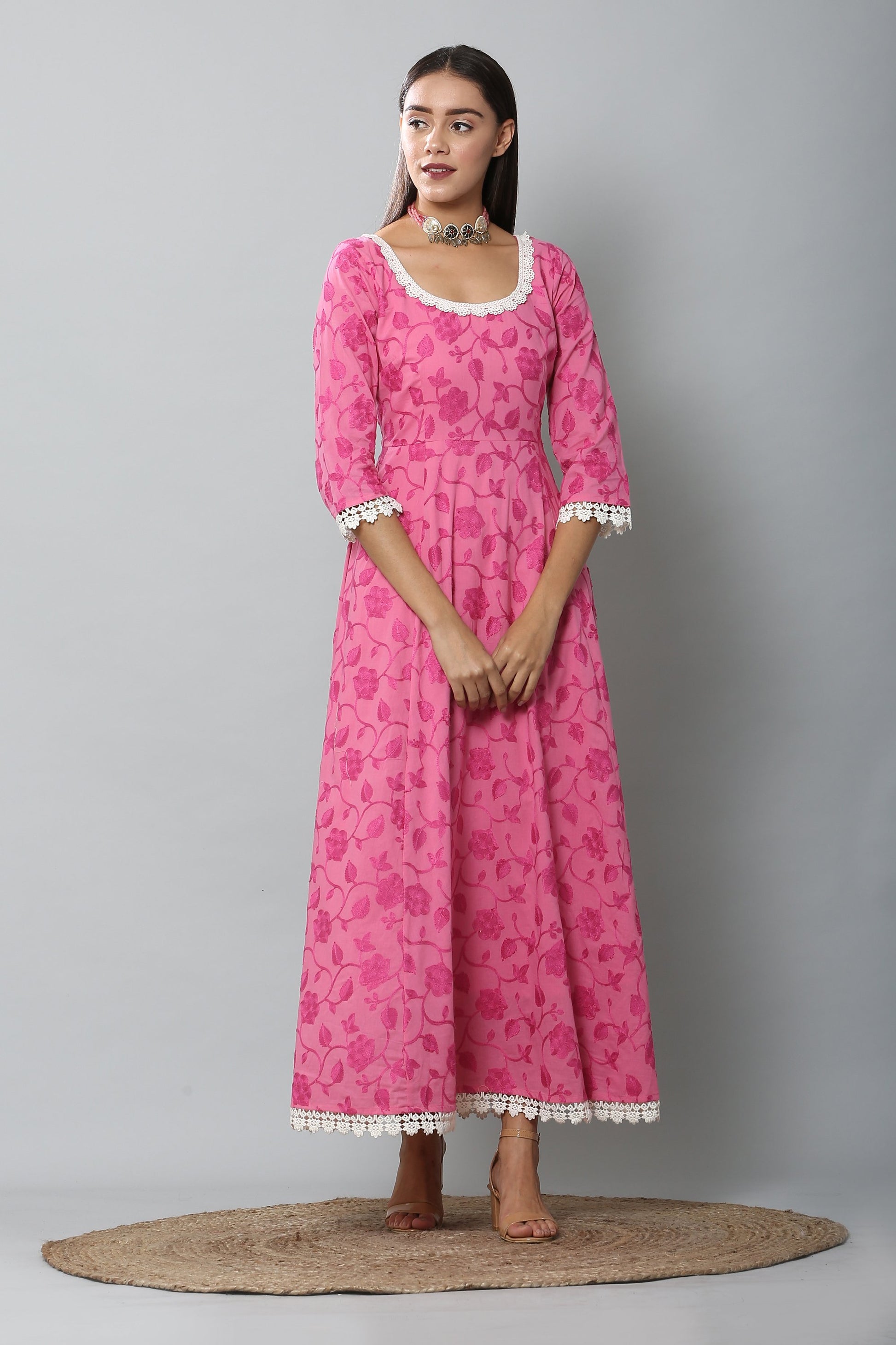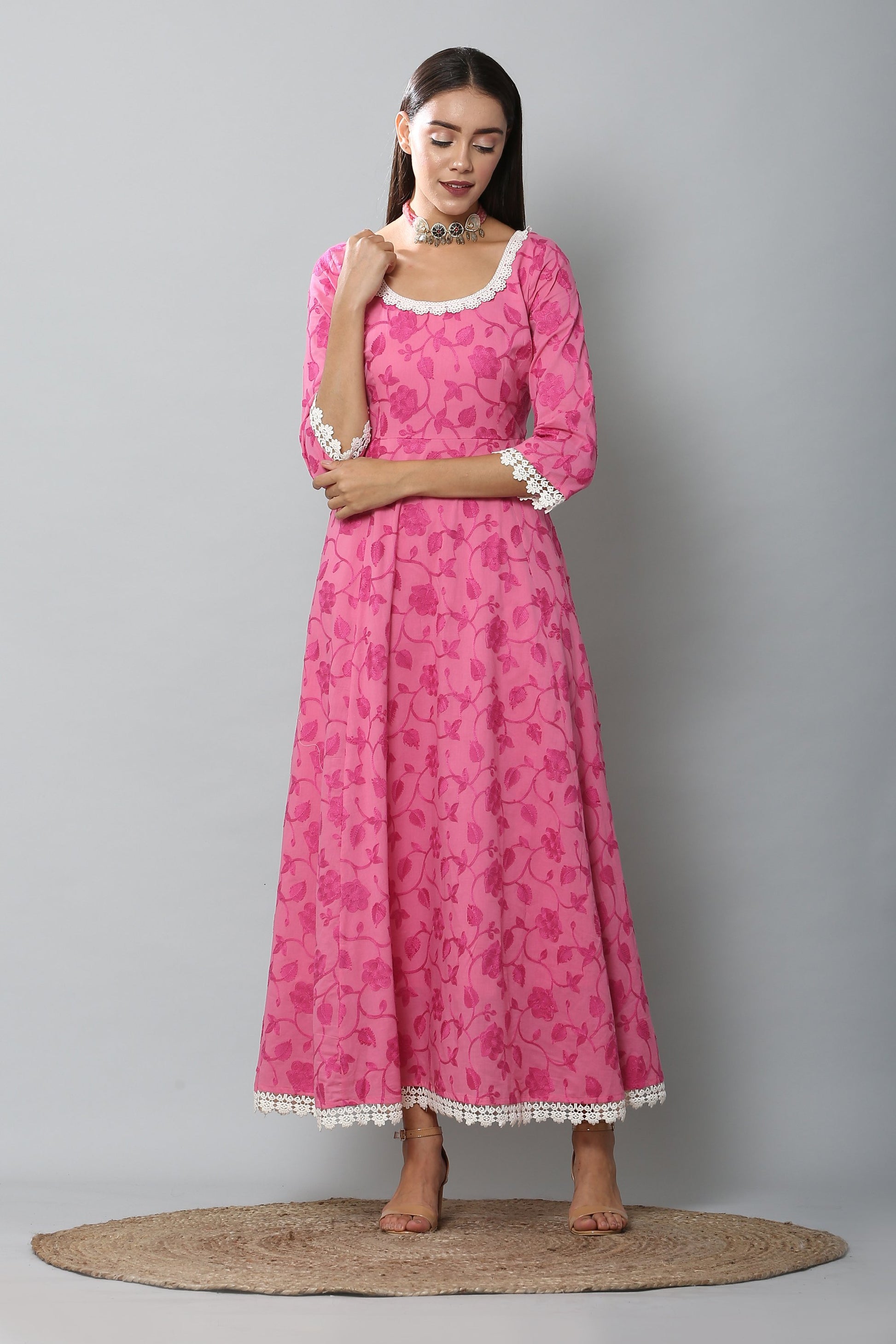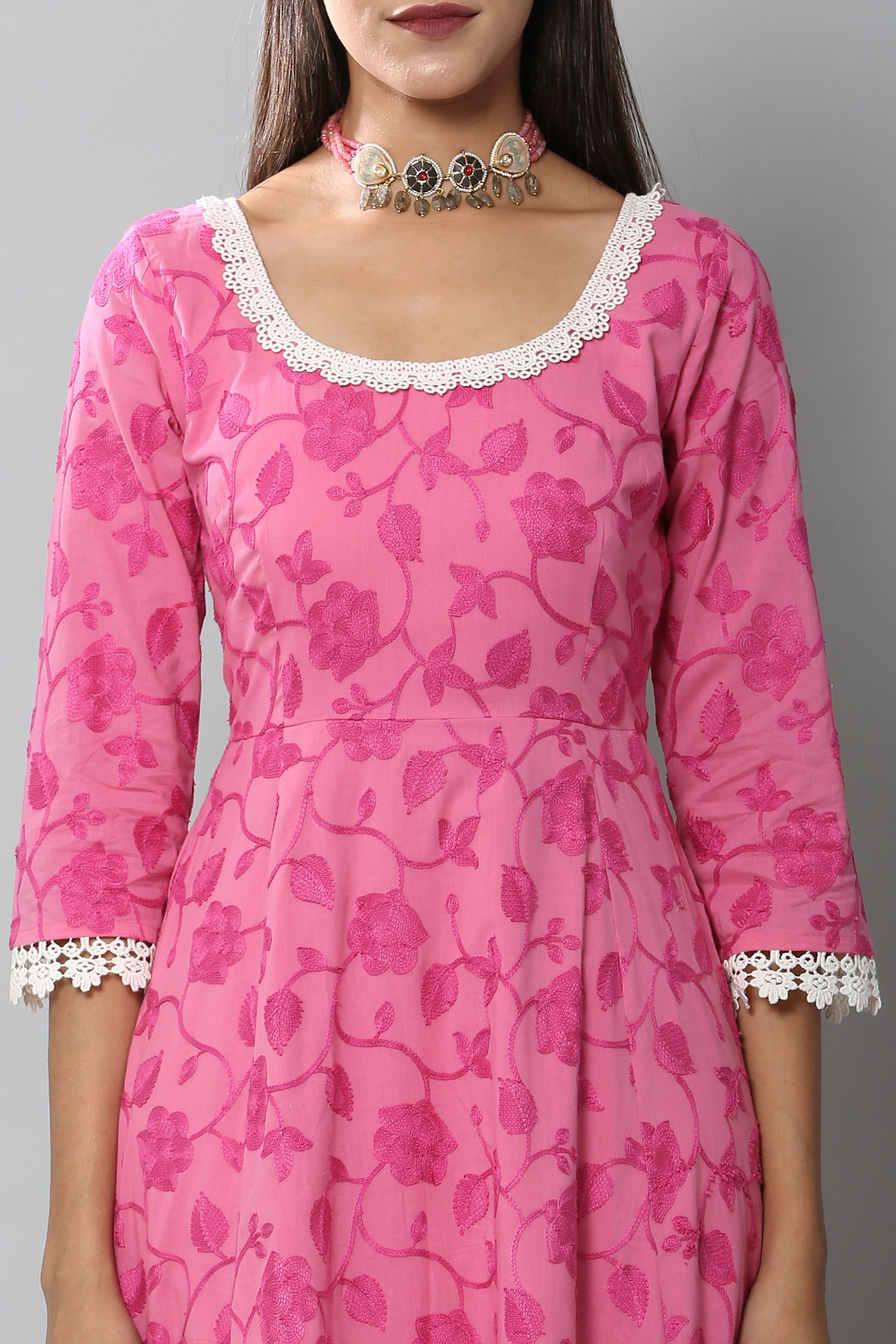 Inspired by Indian crafts, this kurta from SEW is a perfect combination of traditional fabric and modern cuts. Made from beautiful fuschia chain stitch embroidery cotton fabric, this kurta has round neck and quarter sleeves embossed with beautiful lace that makes it visually stunning, while the chhiffon dupatta outlined with lace adds oodles of style. Pair it with silver jewellery and let the monotone of the set elevate your style quotient.
