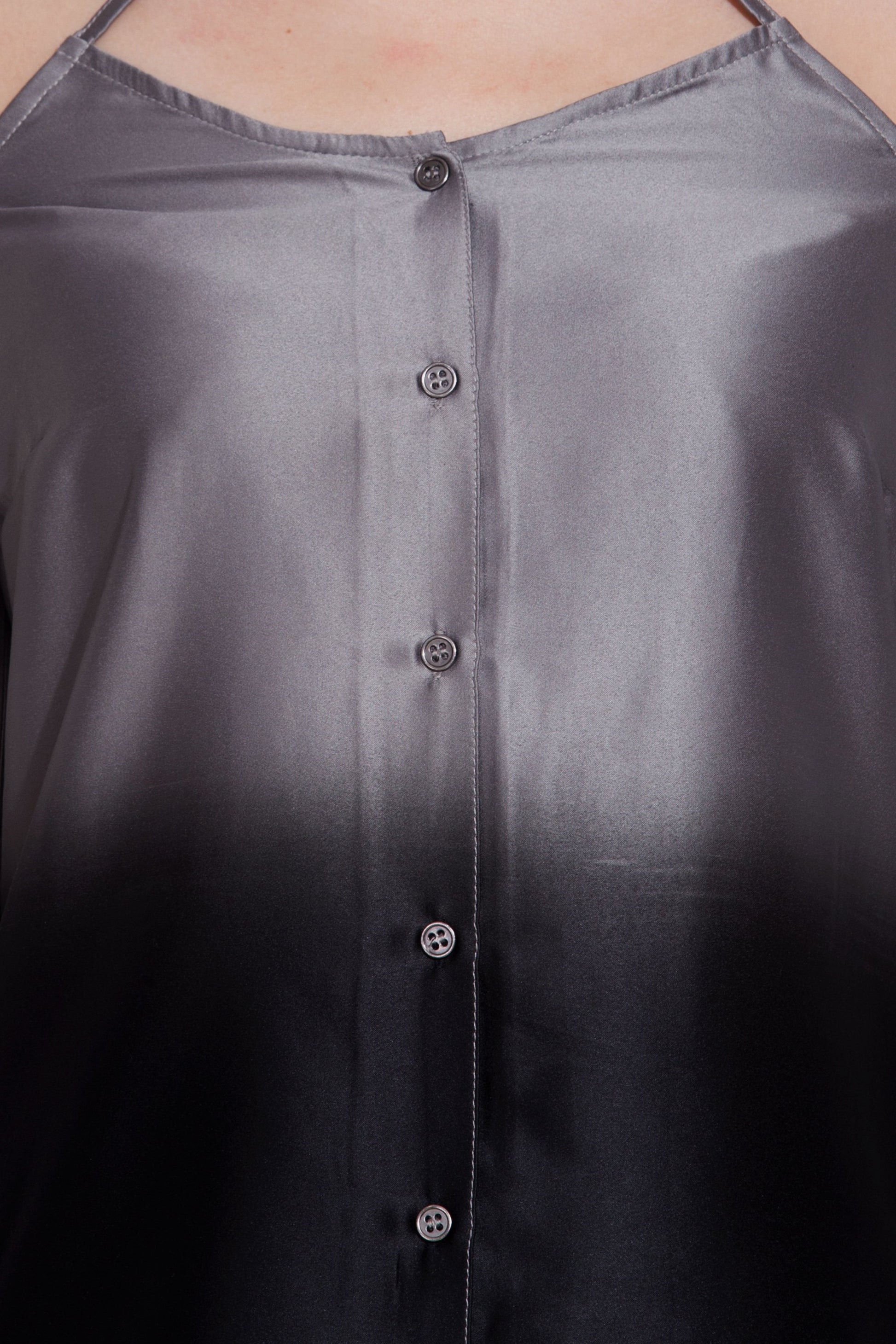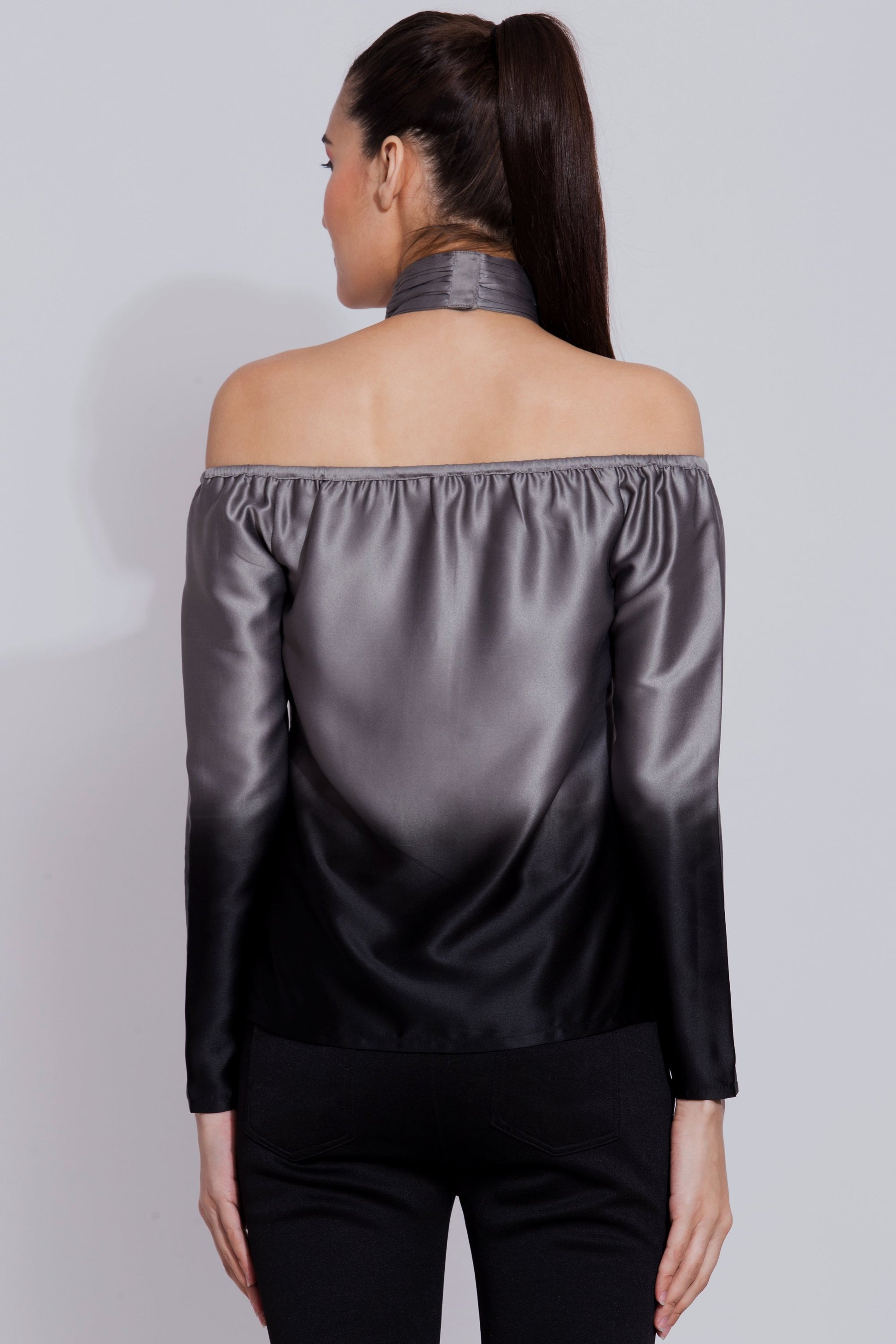Color Blocking gives an edgy look to the Grey and Black Ombre top. Featuring Ruched high collar with back closure, halter neck cuts, off shoulder long sleeves, button placket and elasticated back, this top is a classic party pick for your evenings. Made from poly satin fabric, it is light in weight and will be soft against your skin.