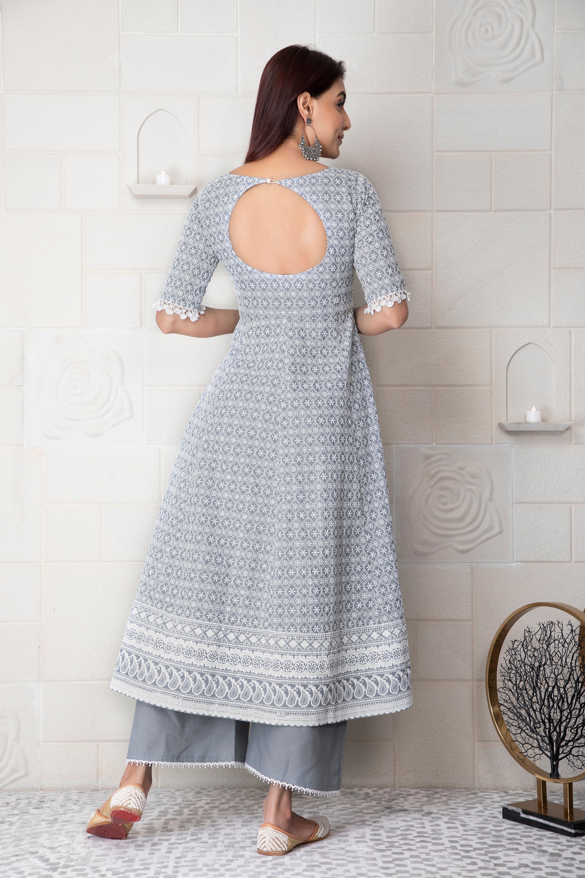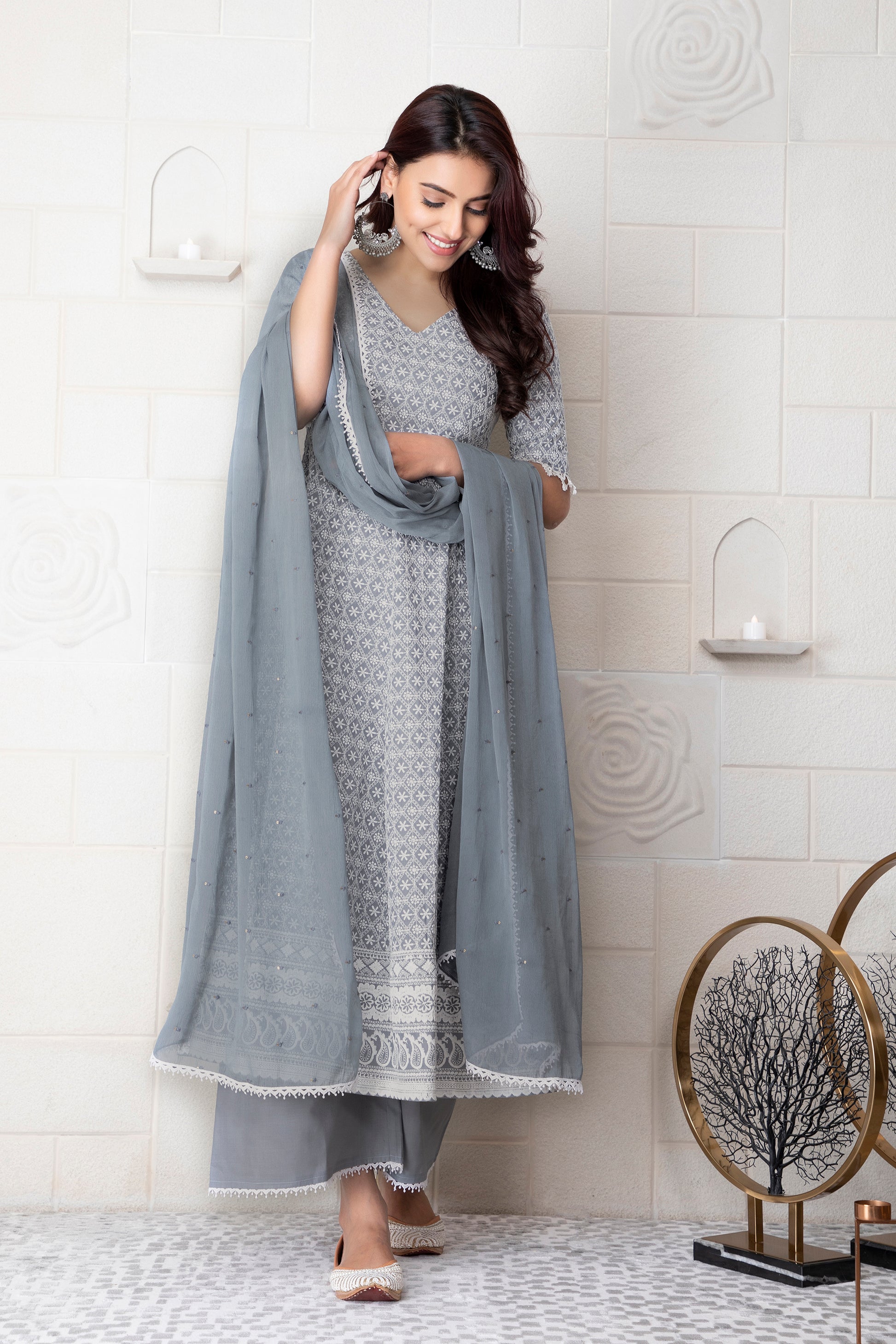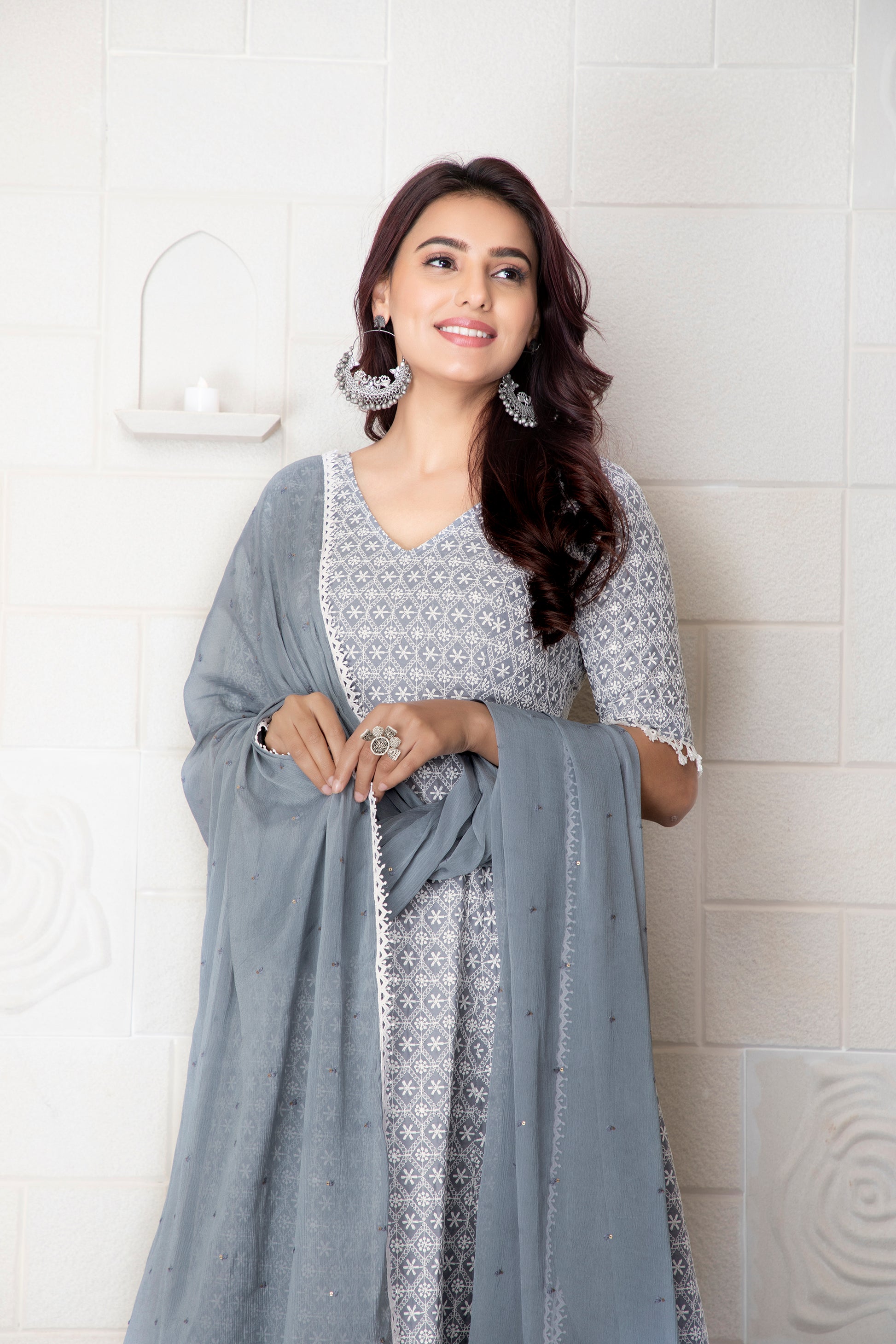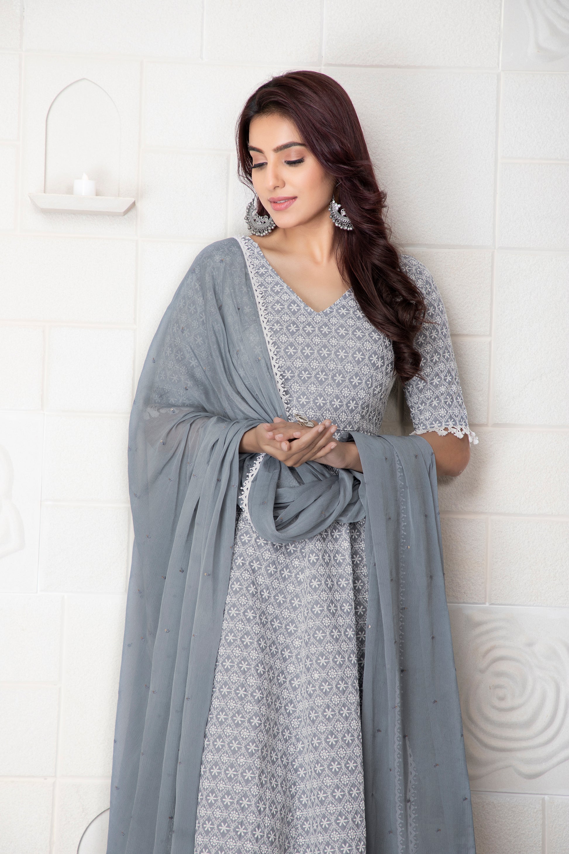 Look regal and flaunt elegance in this Grey Chikankari Anarkali Set with Dupatta. Enlivened with intricate floral chikankari embroidery and the anarkali style of the kurta with a deep round back, it gives a beautiful fit and looks so elegant. The set comes with a beautiful matching chiffon dupatta with white sequence butti, outlined with white lace which adds so much grace to the whole look. Pair it with your favorite earrings and rock your festivities.