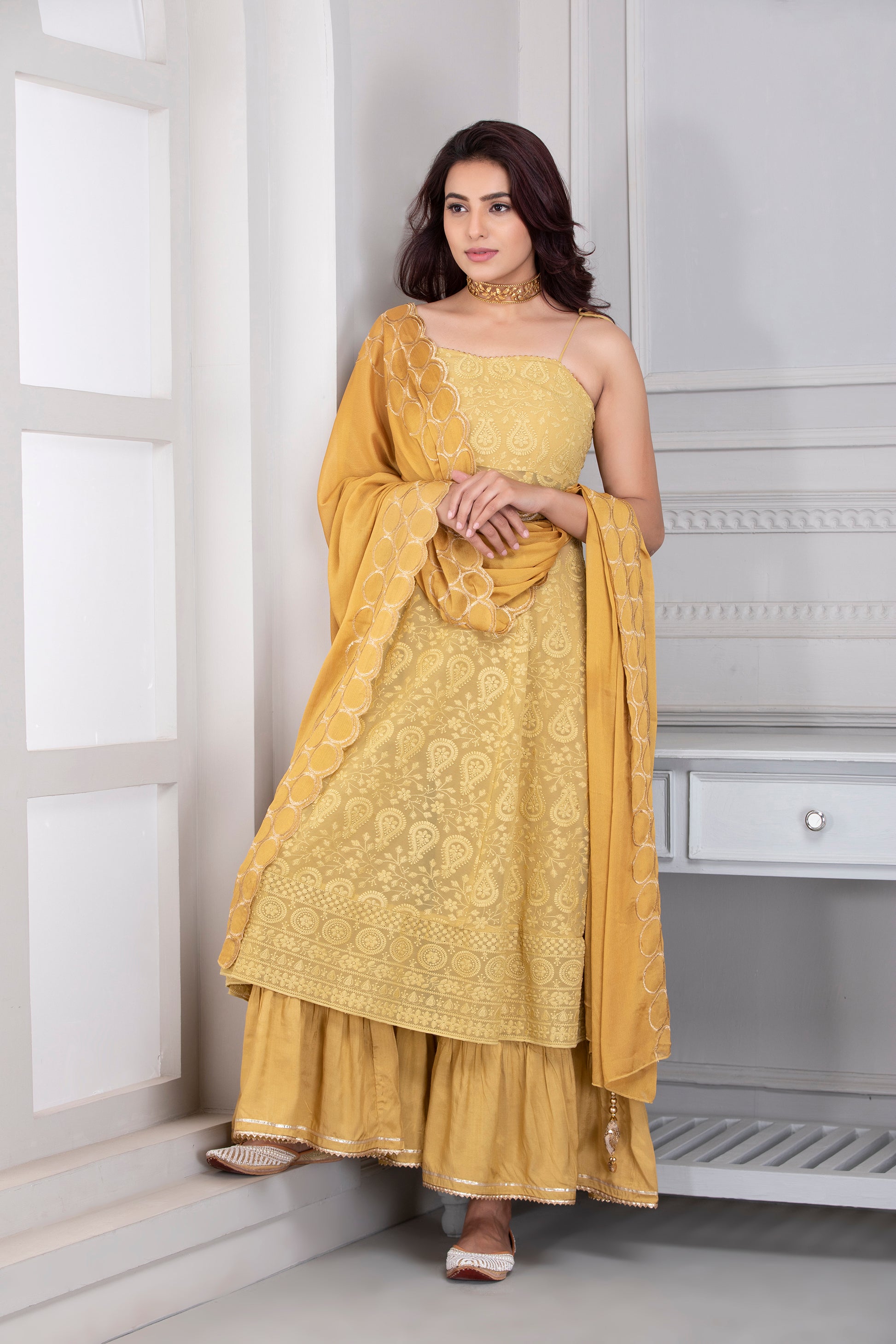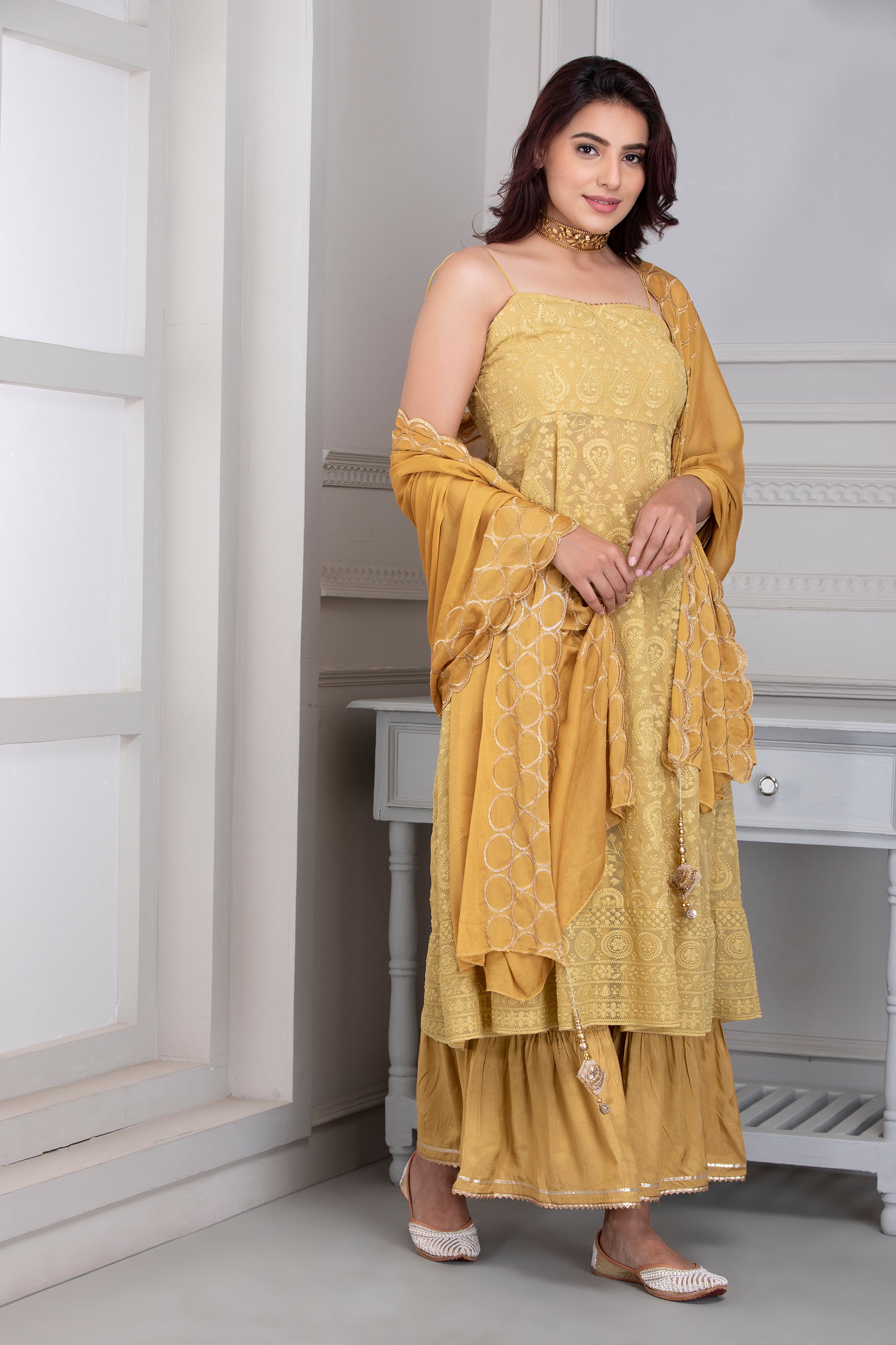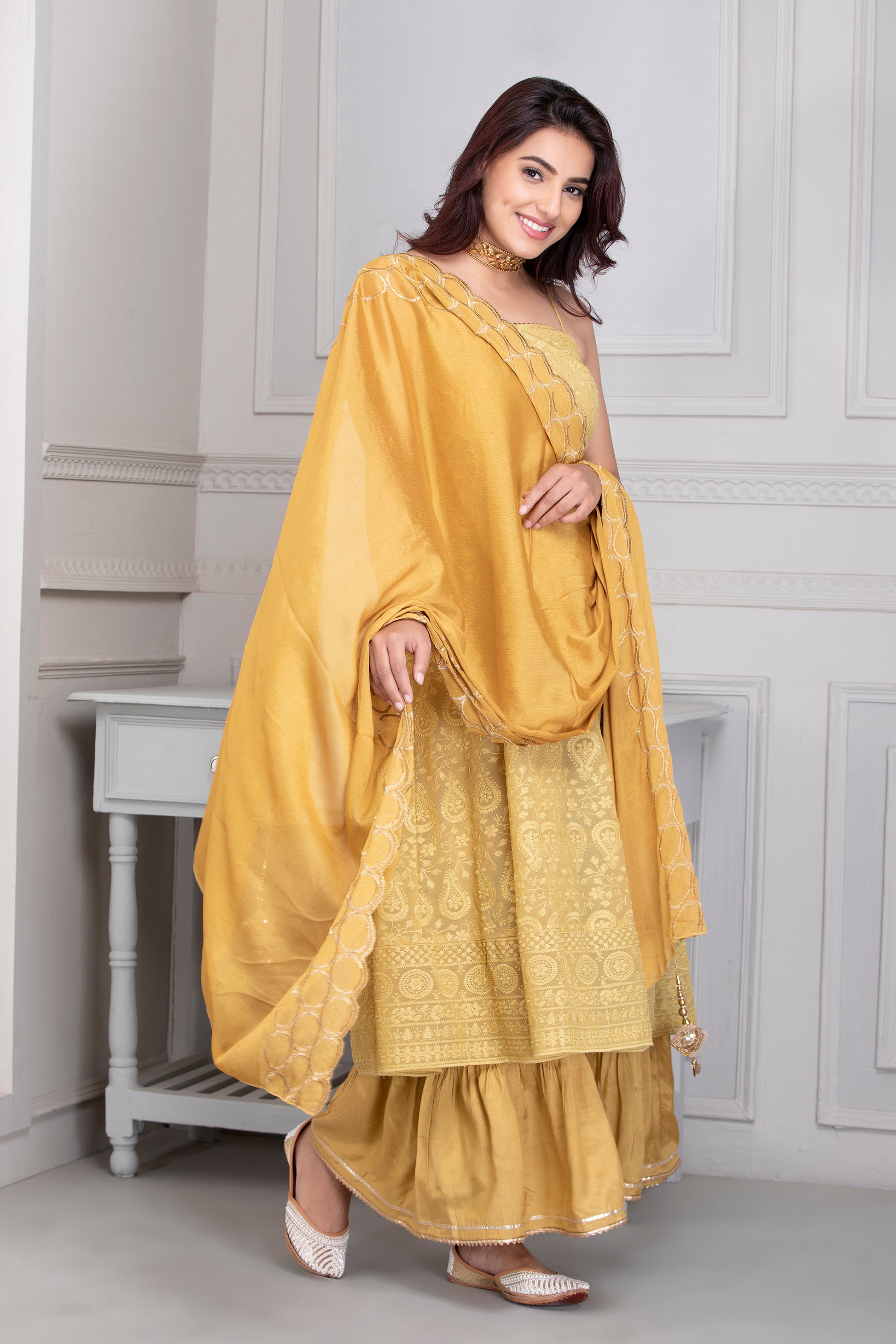 Personify sheer grace and elegance, as we enter the festive season with our feminine Honey Halter Chikankari Kurta Set enlivened with gold gotta lace on neck and stitched from machine embroidered chikankari georgette fabric. Creating a pattern play with a tiered palazzo with lace detailing at hem . The set comes with a beautiful chiffon dupatta with beautiful scallop embroidery and drop tassels. Paired together with gold earrings and matching juttis to create a stunning evening look.