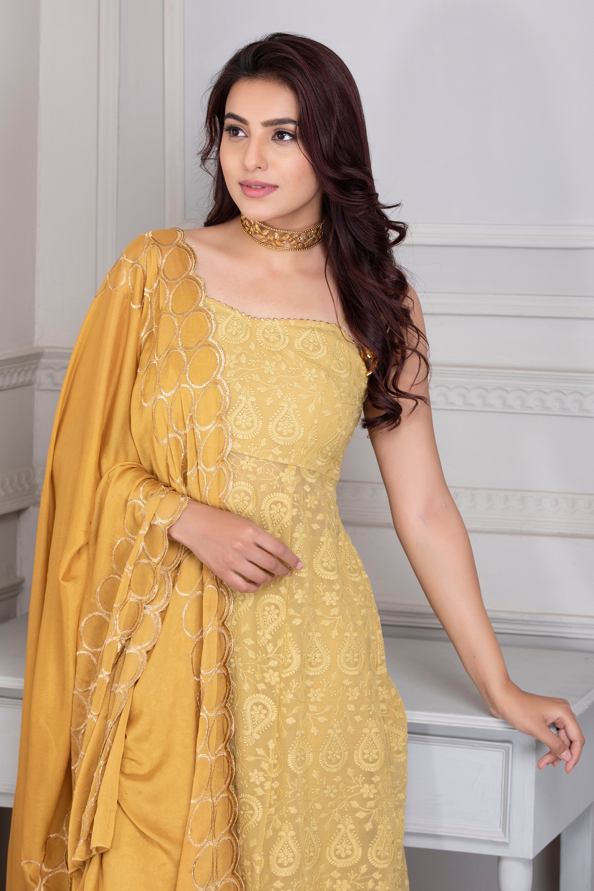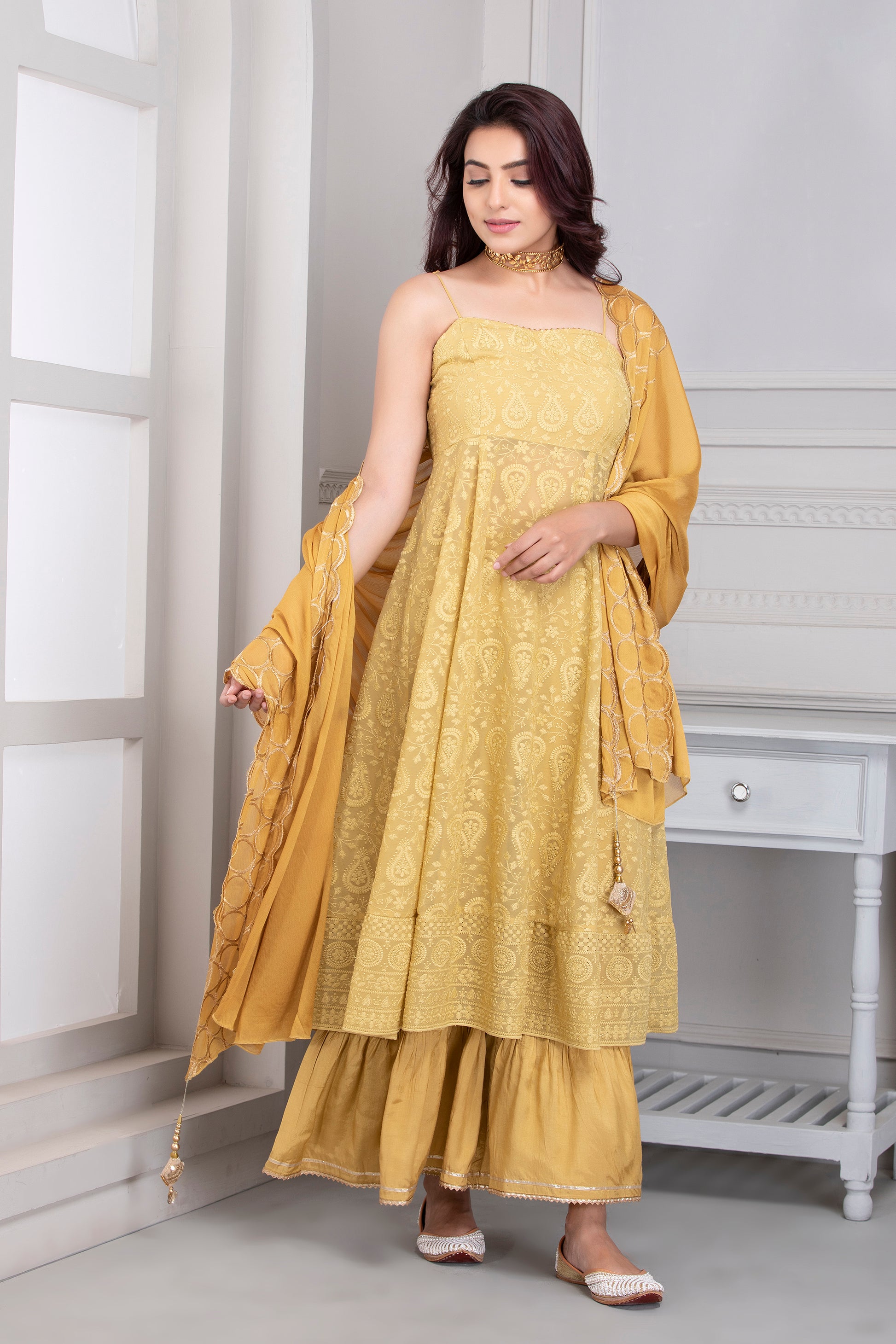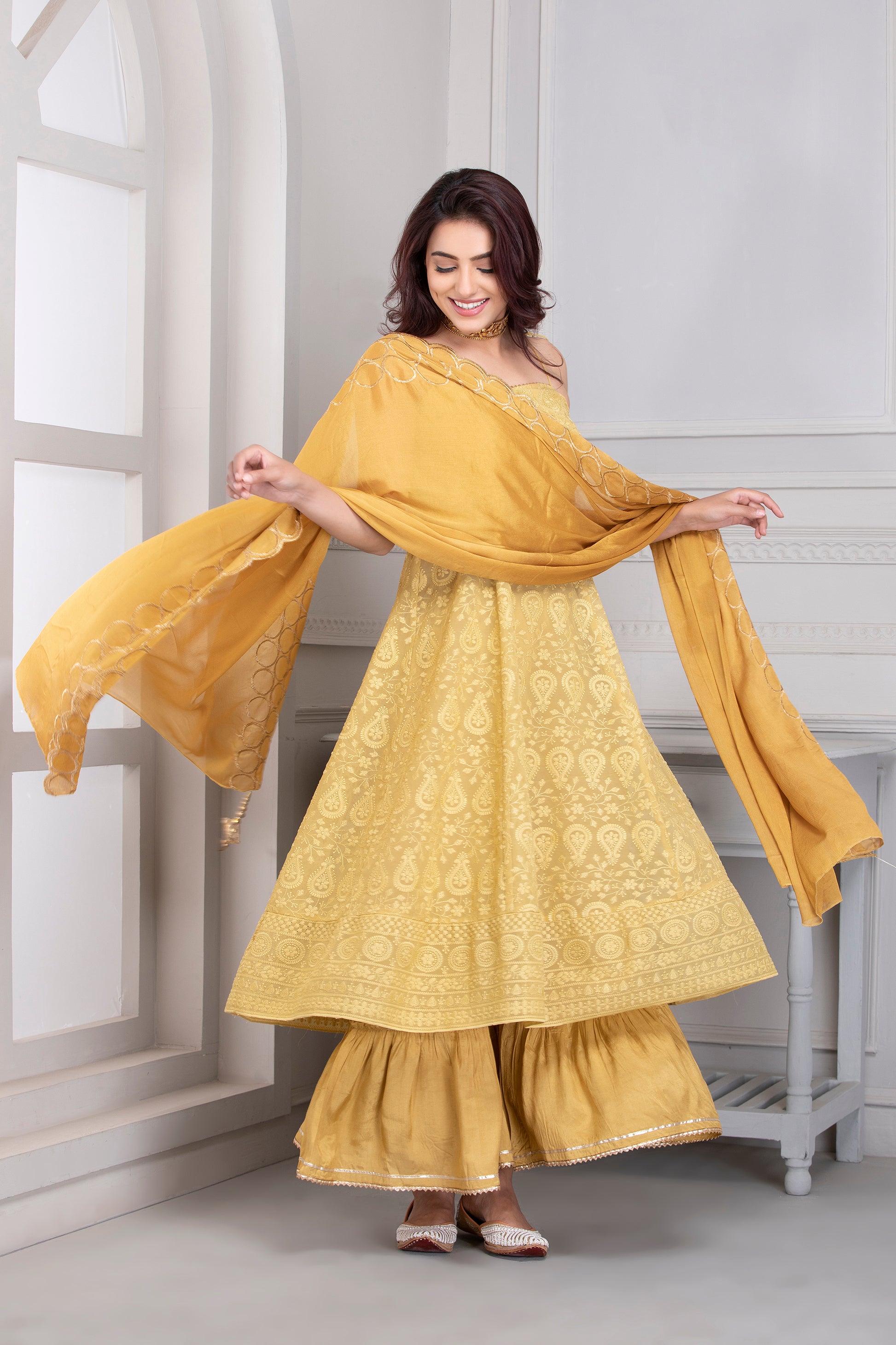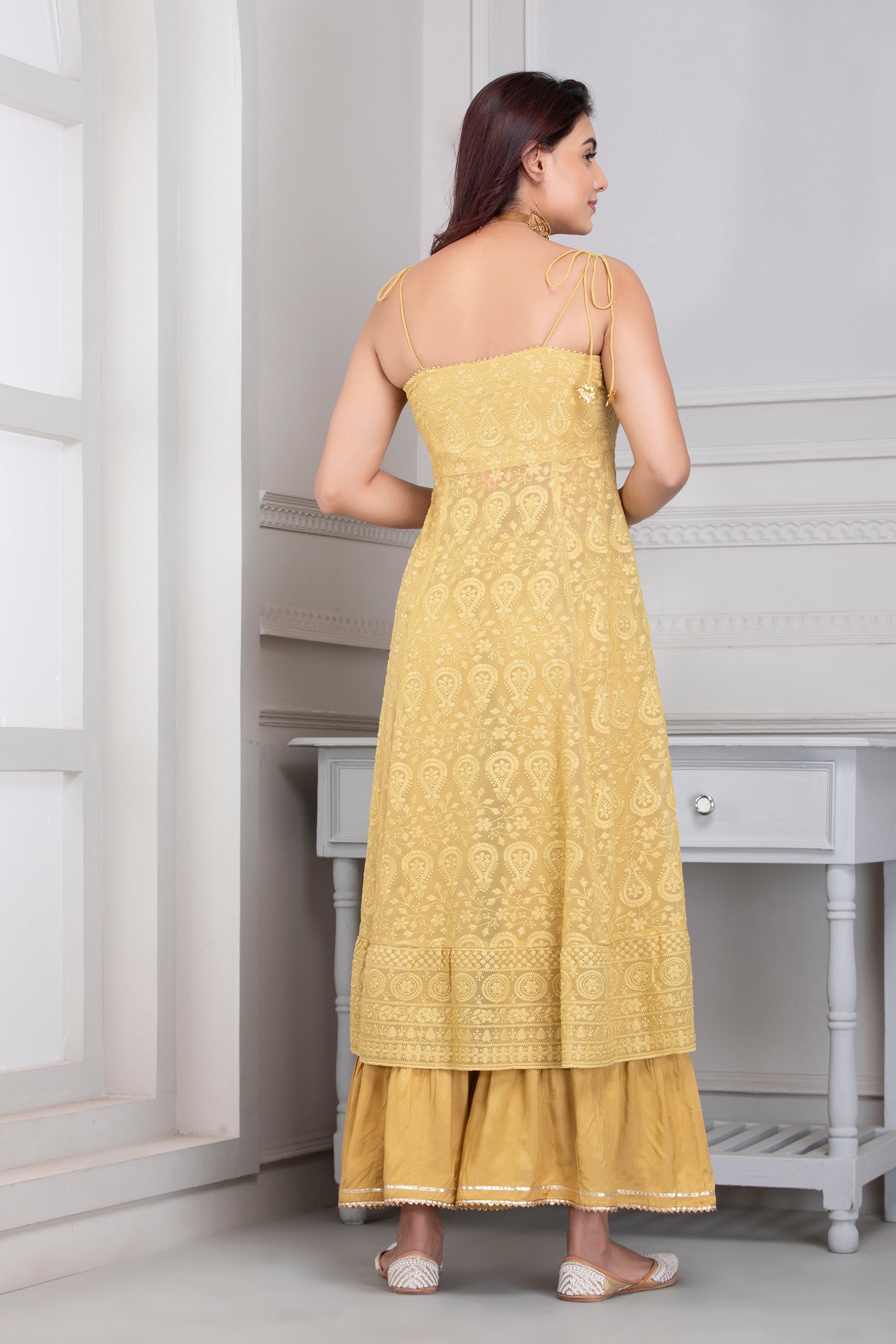Personify sheer grace and elegance, as we enter the festive season with our feminine Honey Halter Chikankari Kurta Set enlivened with gold gotta lace on neck and stitched from machine embroidered chikankari georgette fabric. Creating a pattern play with a tiered palazzo with lace detailing at hem . The set comes with a beautiful chiffon dupatta with beautiful scallop embroidery and drop tassels. Paired together with gold earrings and matching juttis to create a stunning evening look.