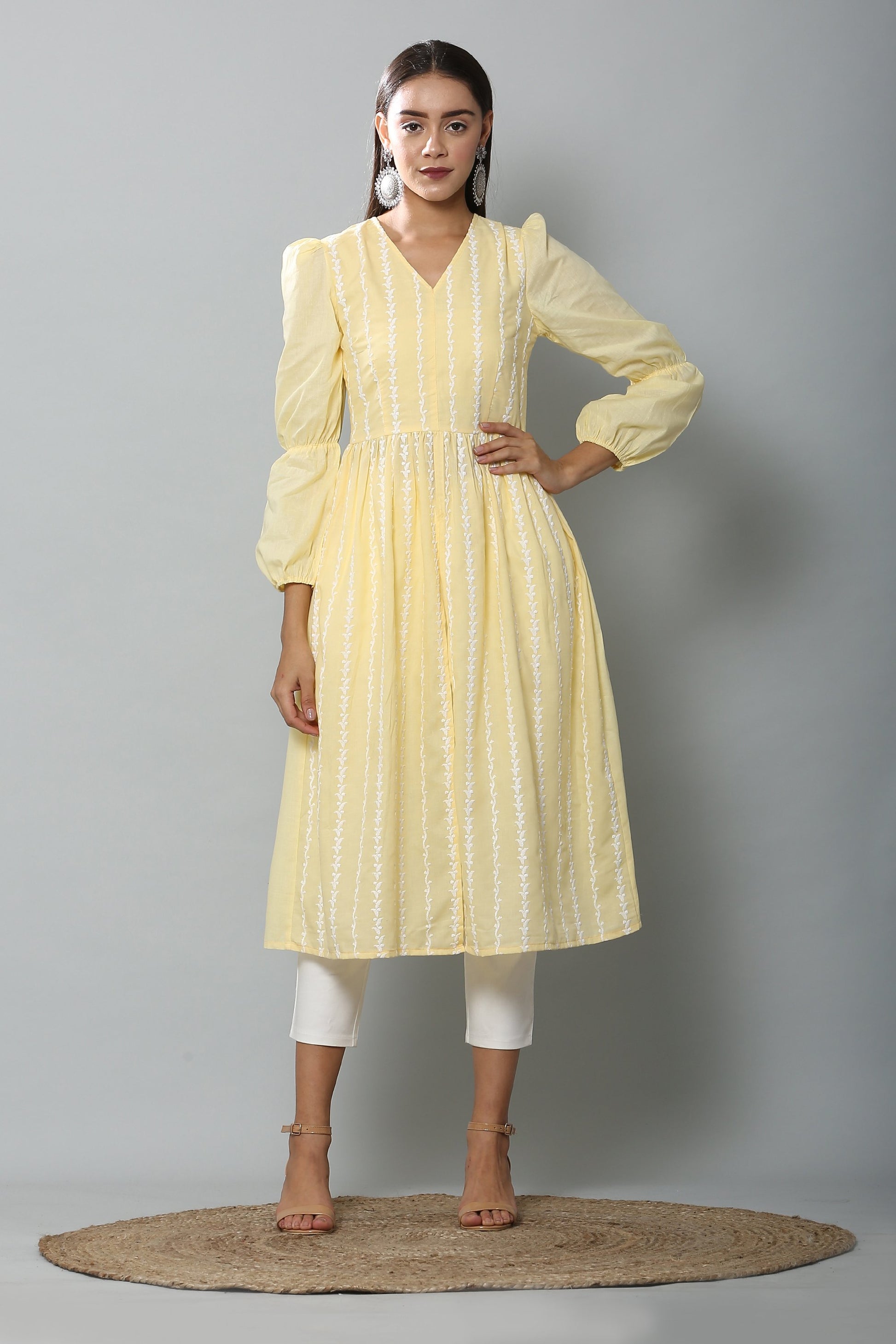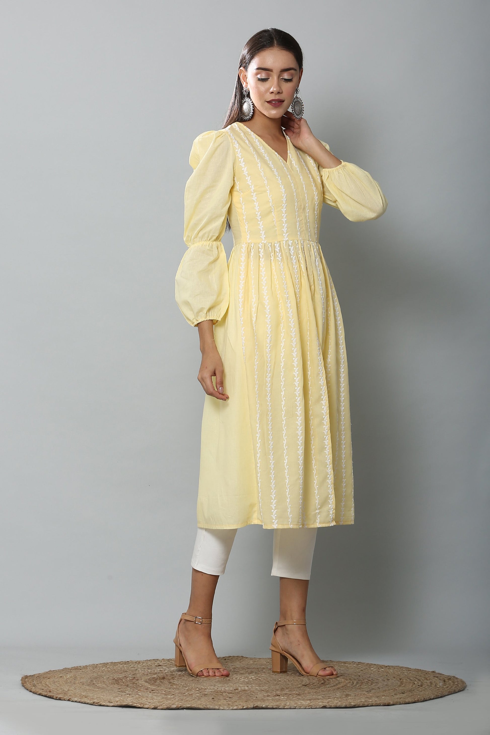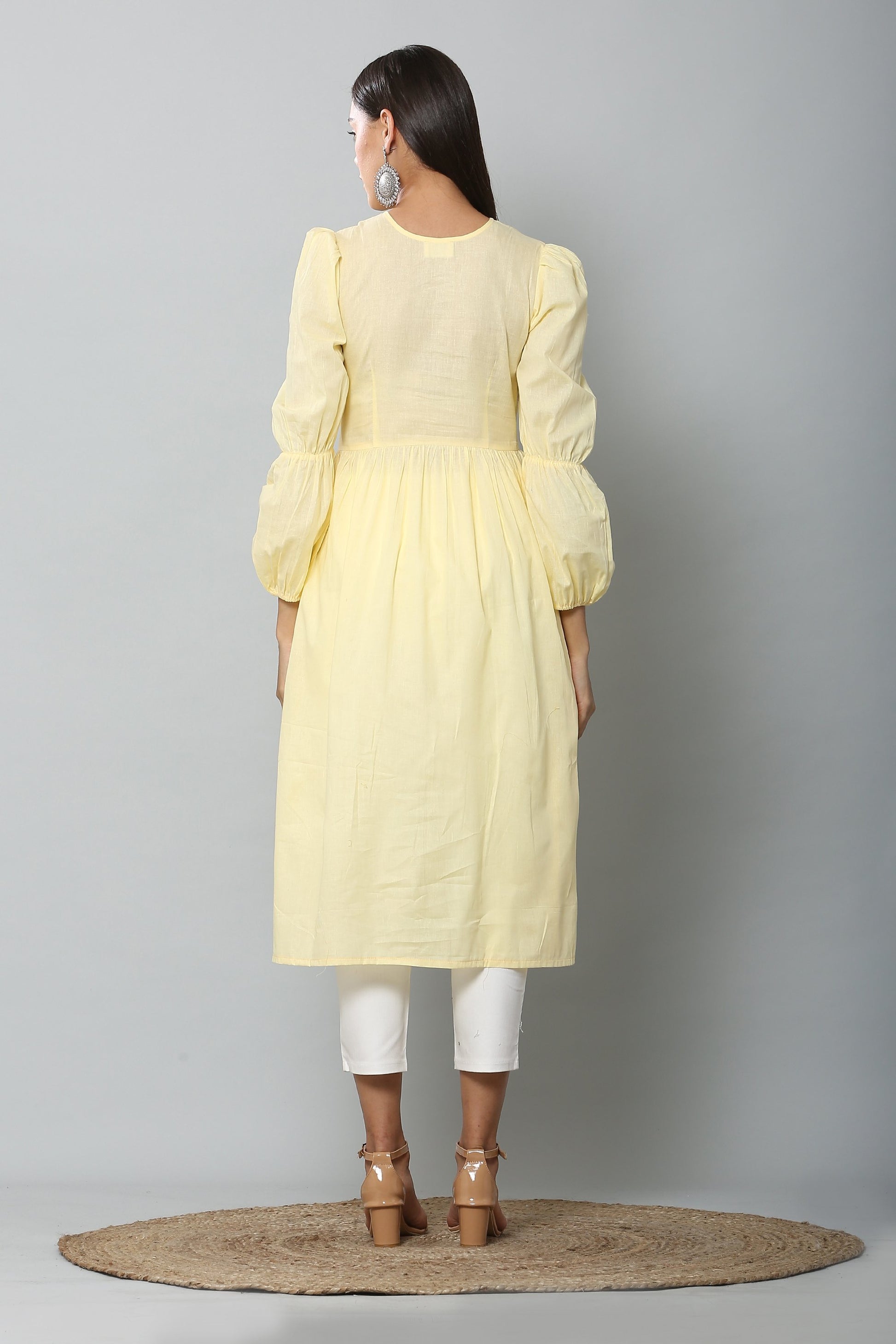 For a easy breezy outfit, wear this lemon kurta top with your favorite denims and look super stylish. Easy to wear this top is a perfect combination of comfort and fashion. It can be flaunted at your office or a day out with friends. It is designed intricately with beautiful white embroidered front, gathered pattern and long puffed sleeves to give utmost comfort all day.