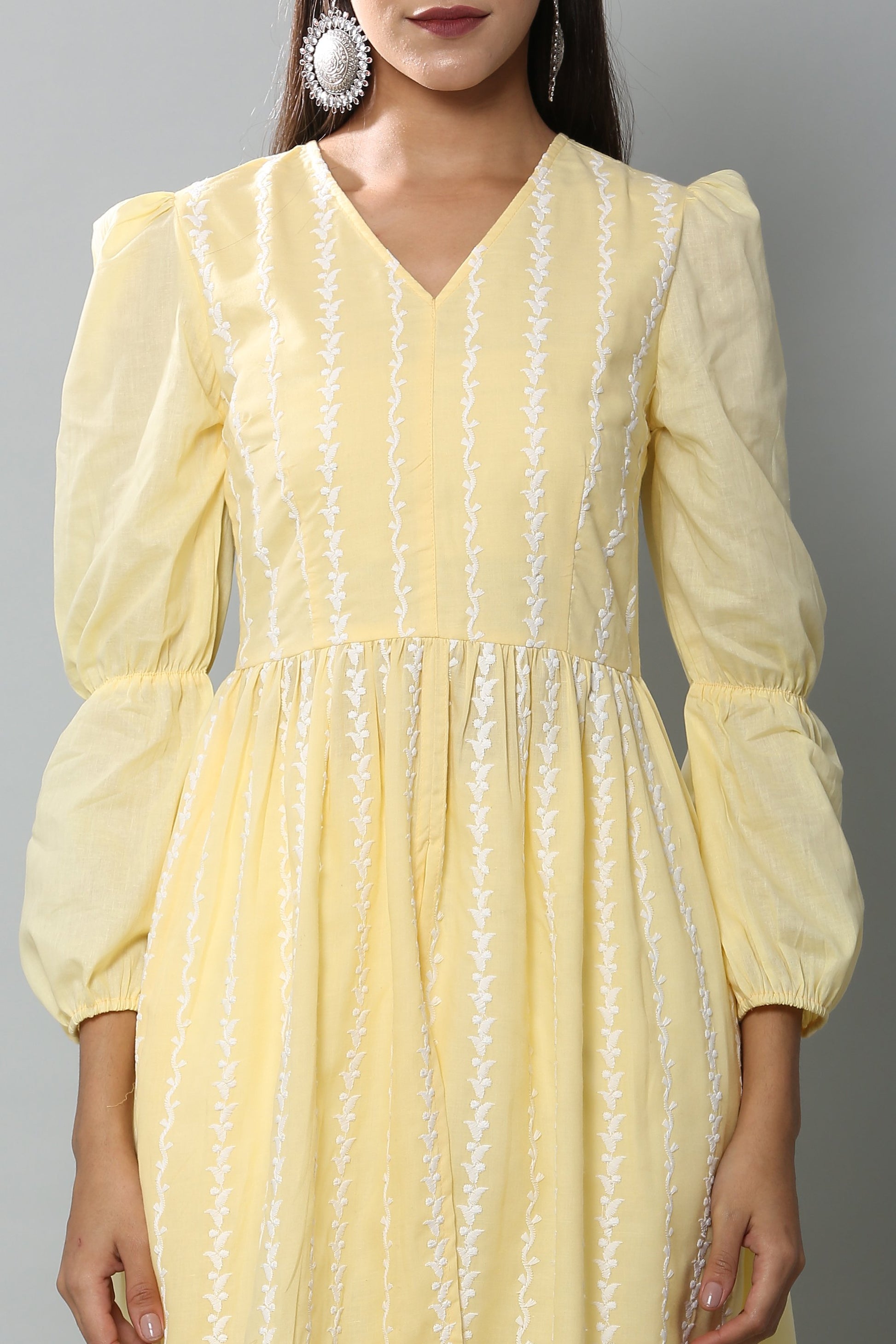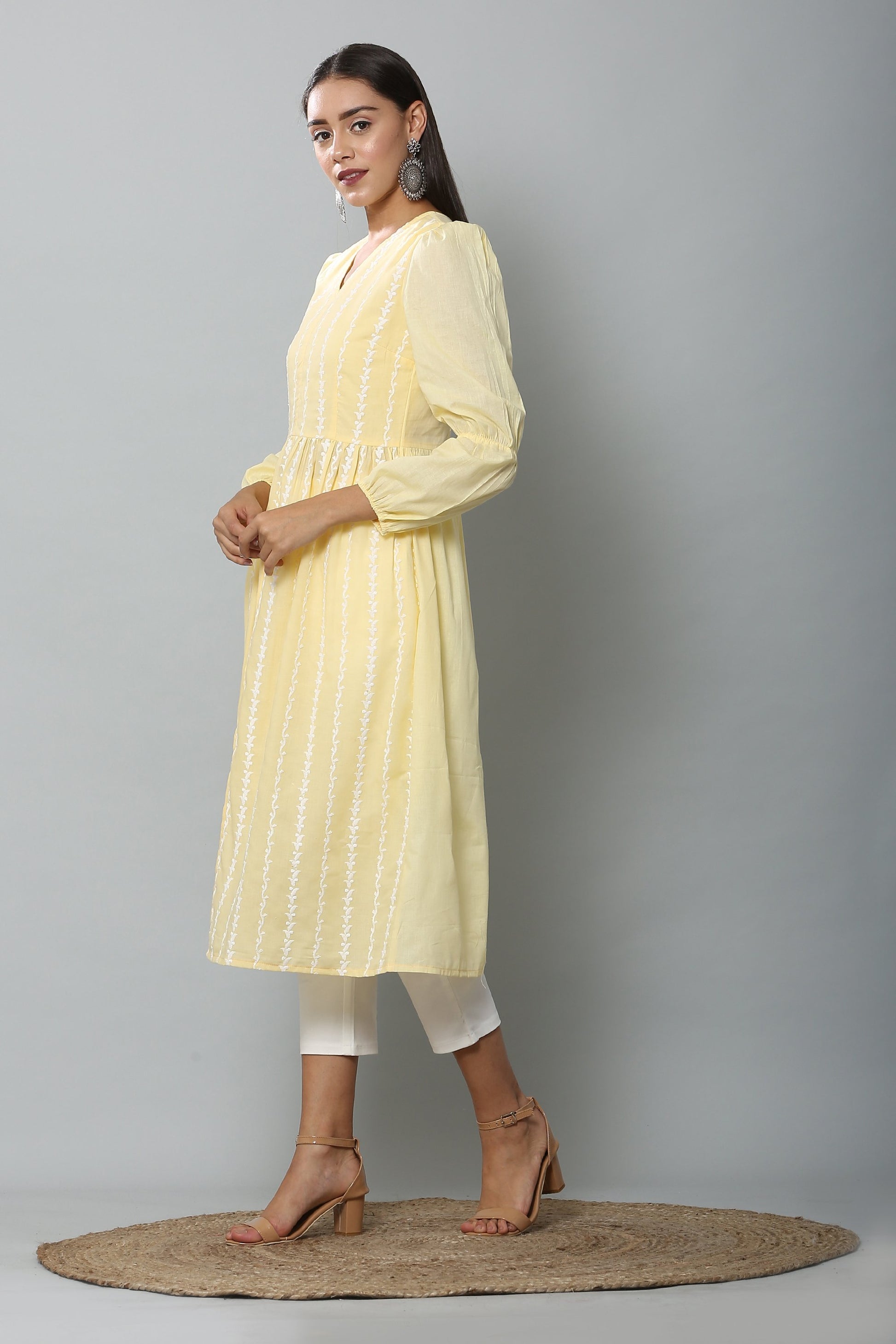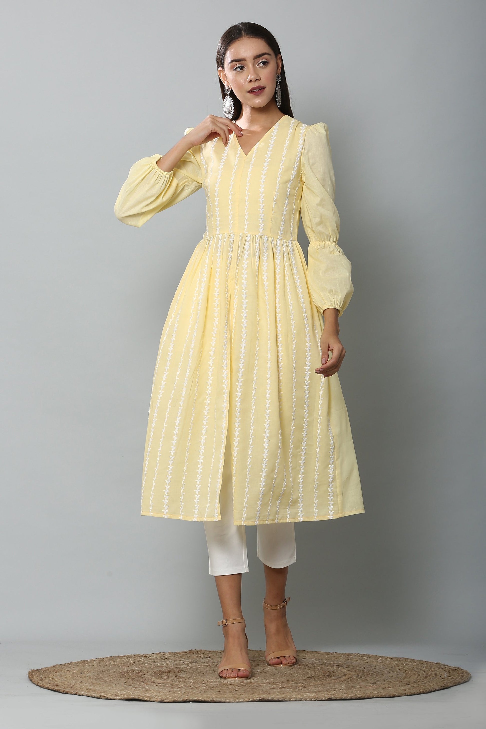 For a easy breezy outfit, wear this lemon kurta top with your favorite denims and look super stylish. Easy to wear this top is a perfect combination of comfort and fashion. It can be flaunted at your office or a day out with friends. It is designed intricately with beautiful white embroidered front, gathered pattern and long puffed sleeves to give utmost comfort all day.