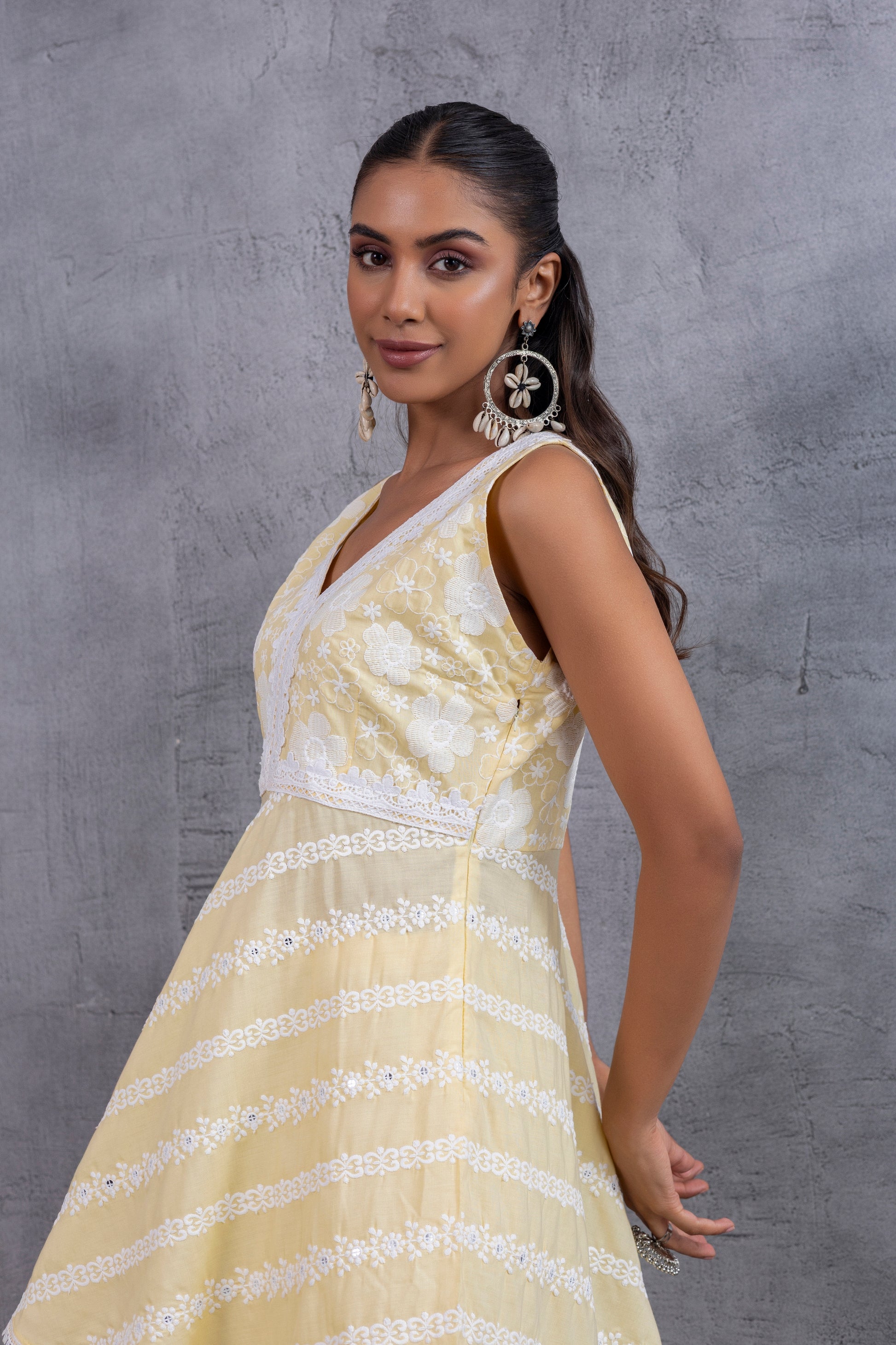 Lemon Yellow Floral Embroidered Bias Cut Kurta set