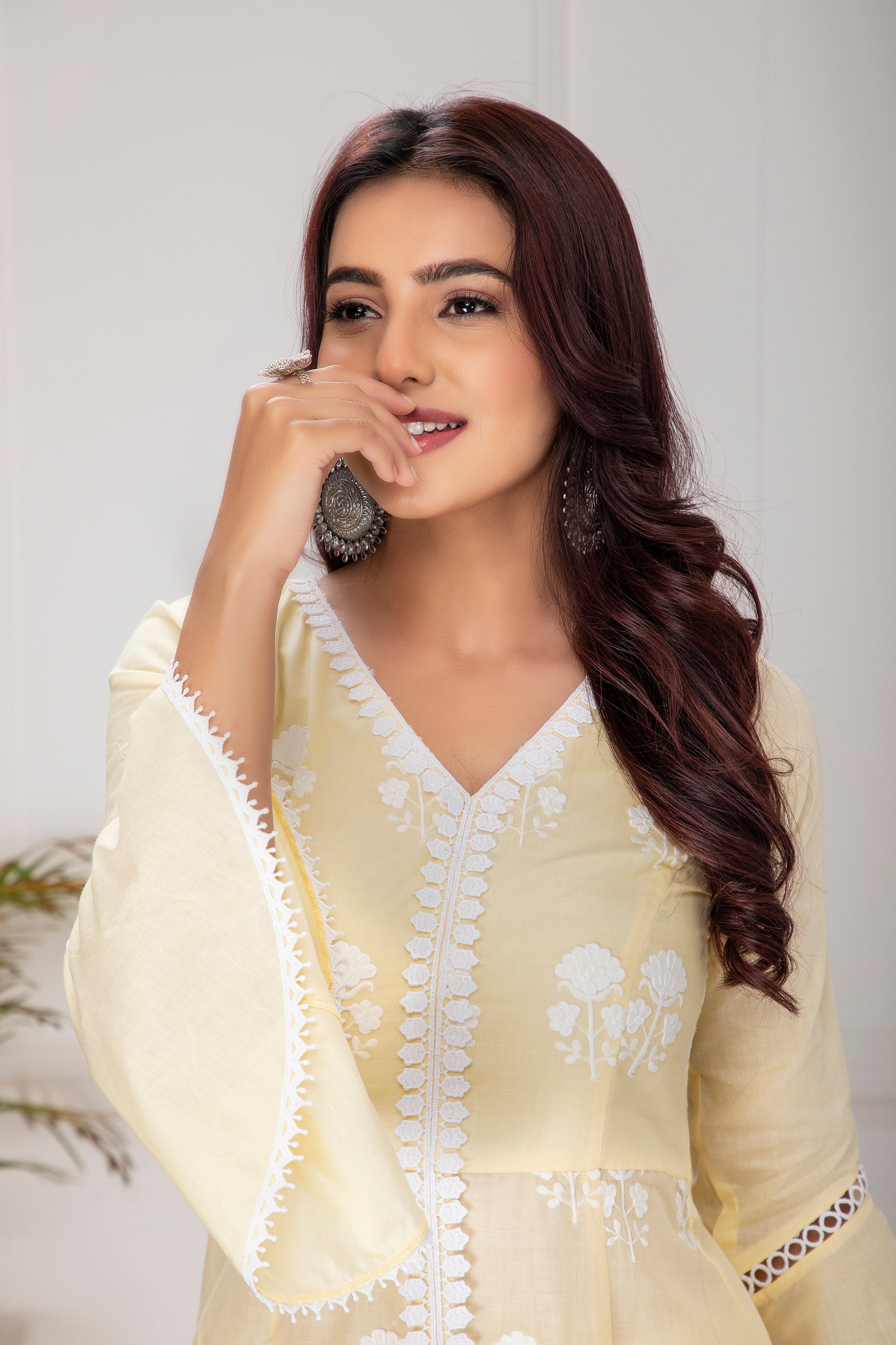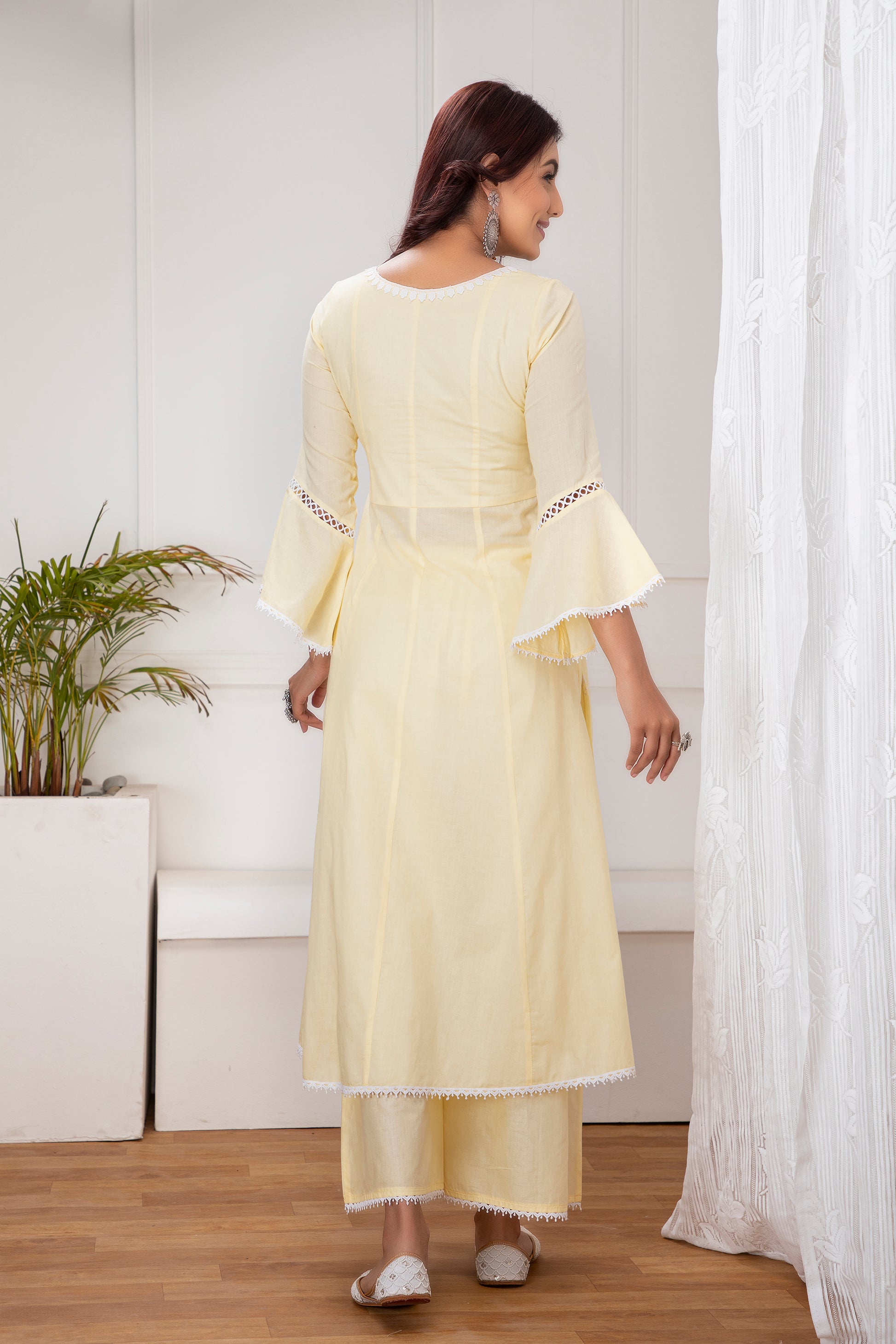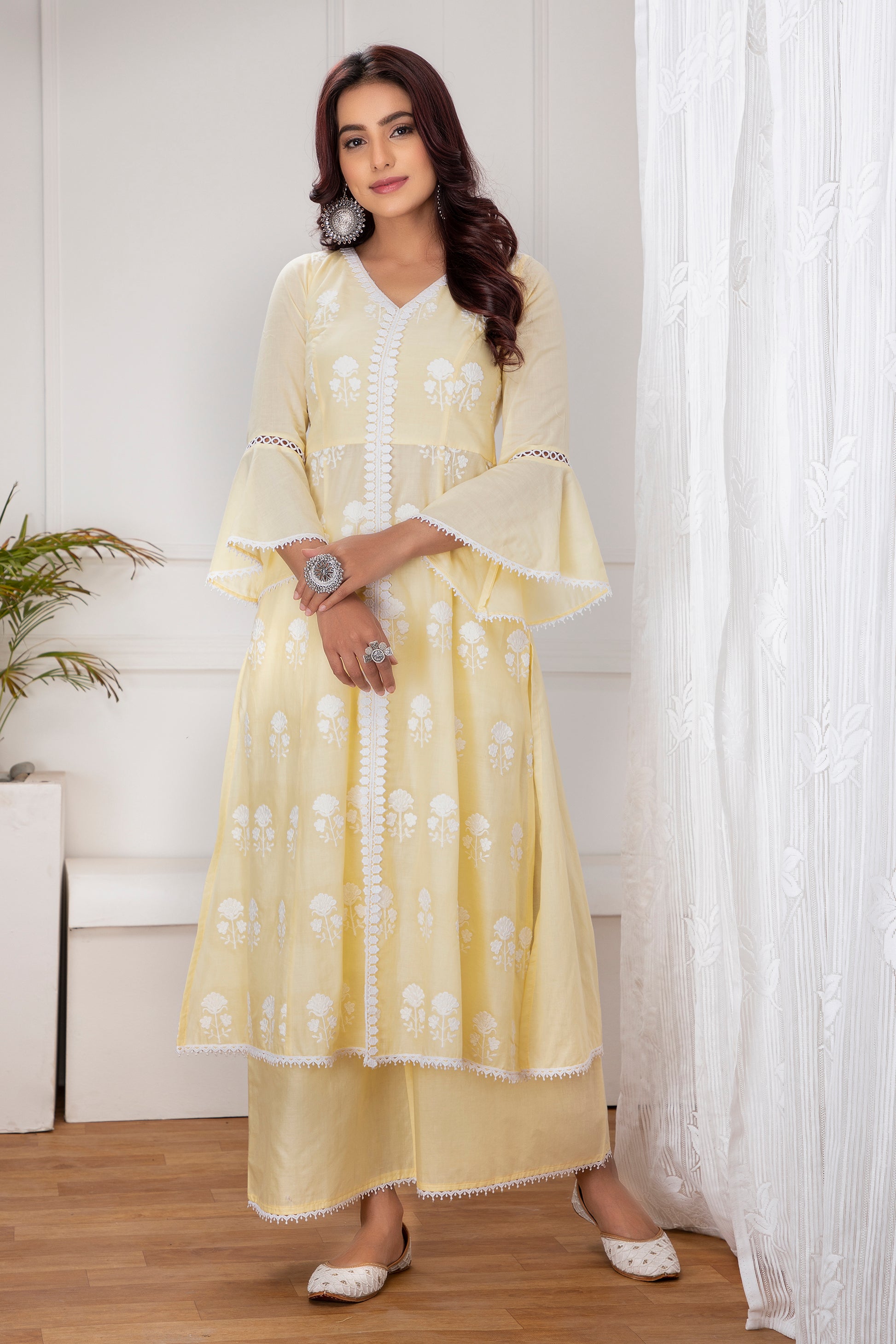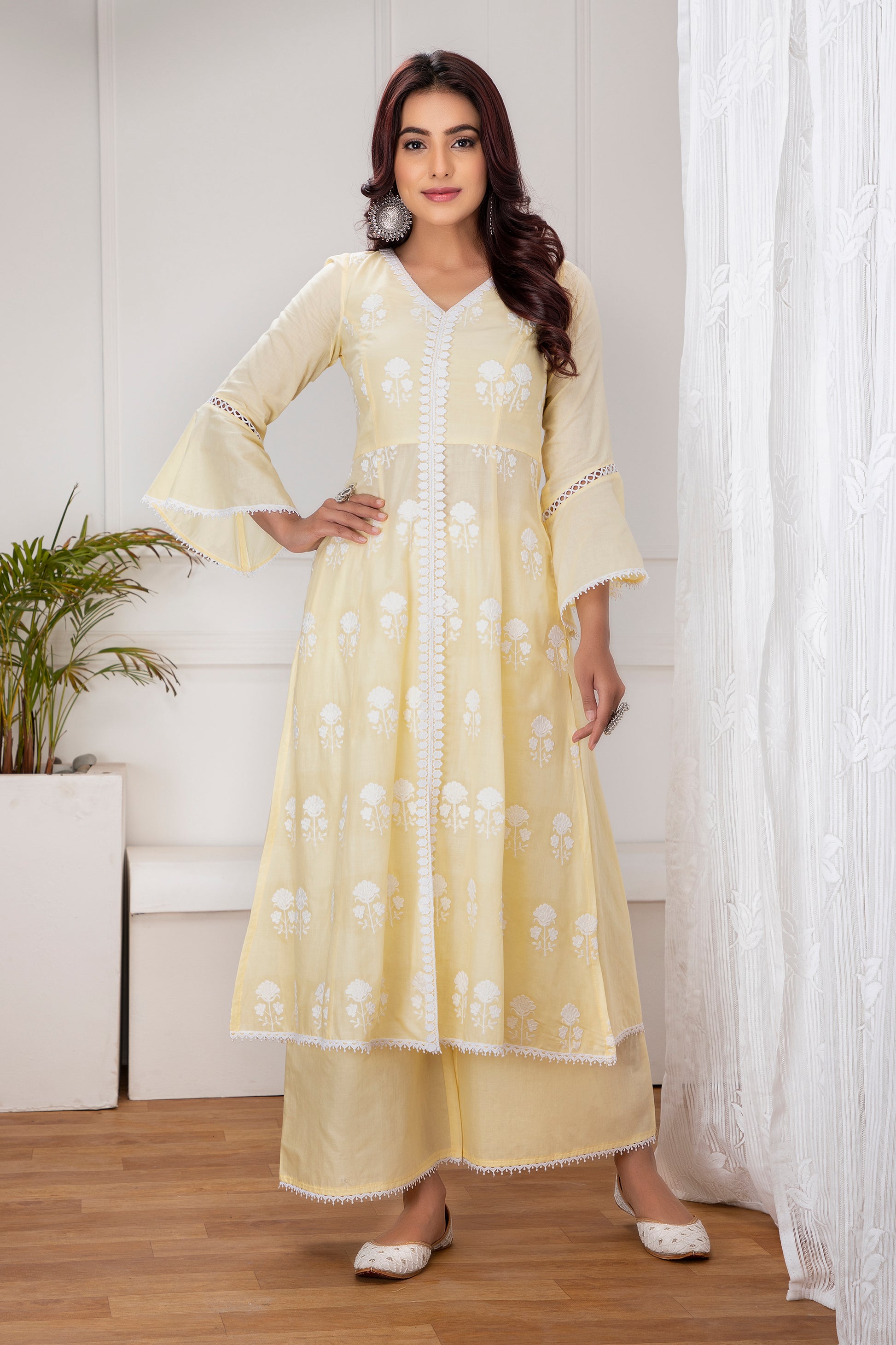 Made from cotton floral embroidered fabric, this kurta set from SEW offers a sophisticated, elegant style, making it an exclusive addition to your ethnic collection. Made from mul cotton, this set comprises a kurta with neck embossed with lace and round cut sleeves highlighted with lace and beautiful embroidery design. It includes a pair of plazzo that half elasticated waist and lace at hem that adds to the sublime style.