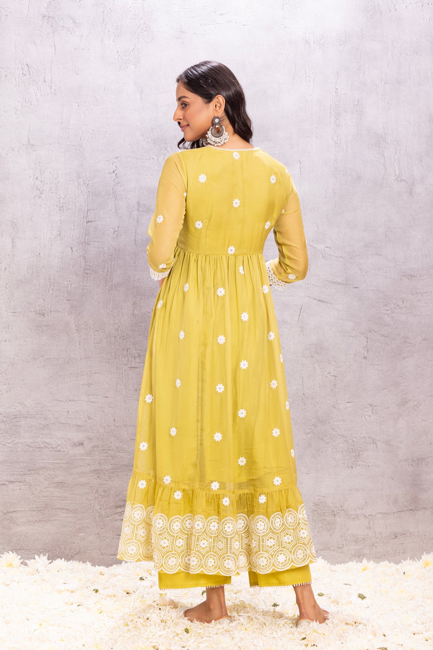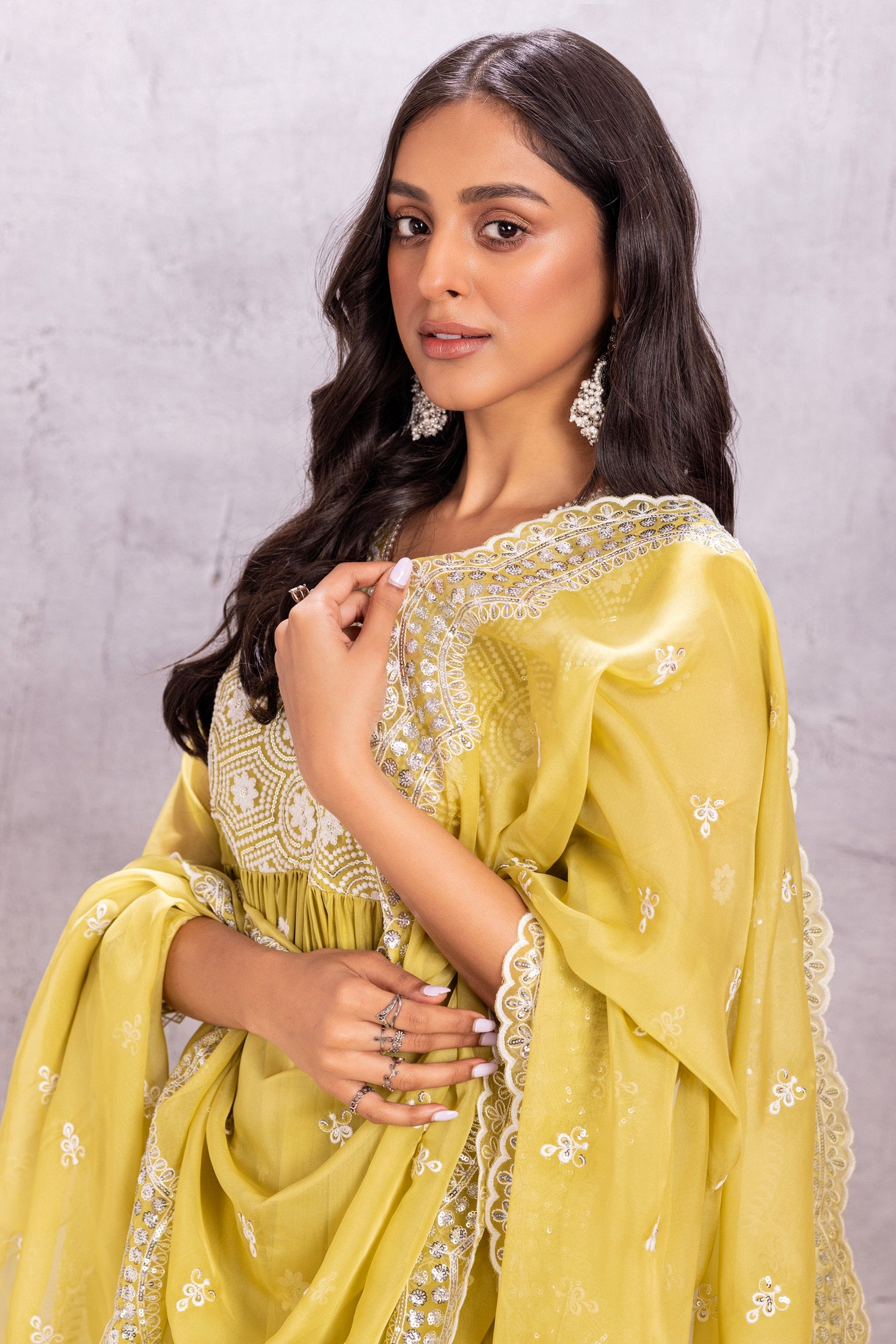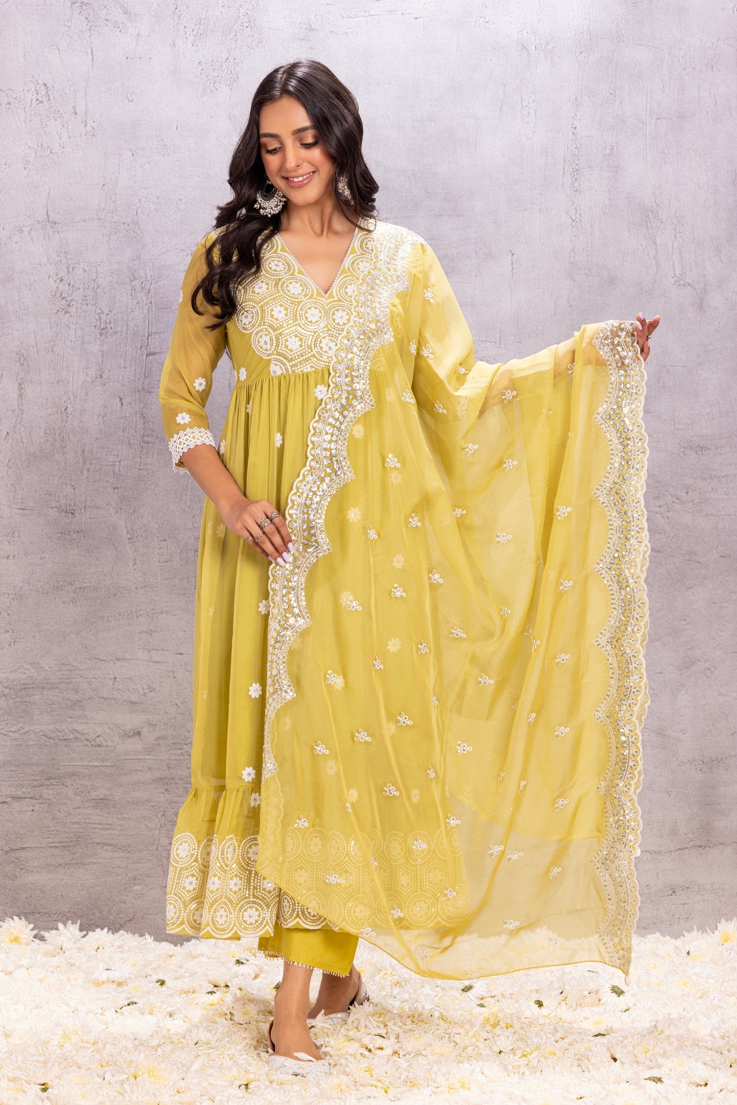 Citrus Lime Flared Suit Set with sequence embellished dupatta