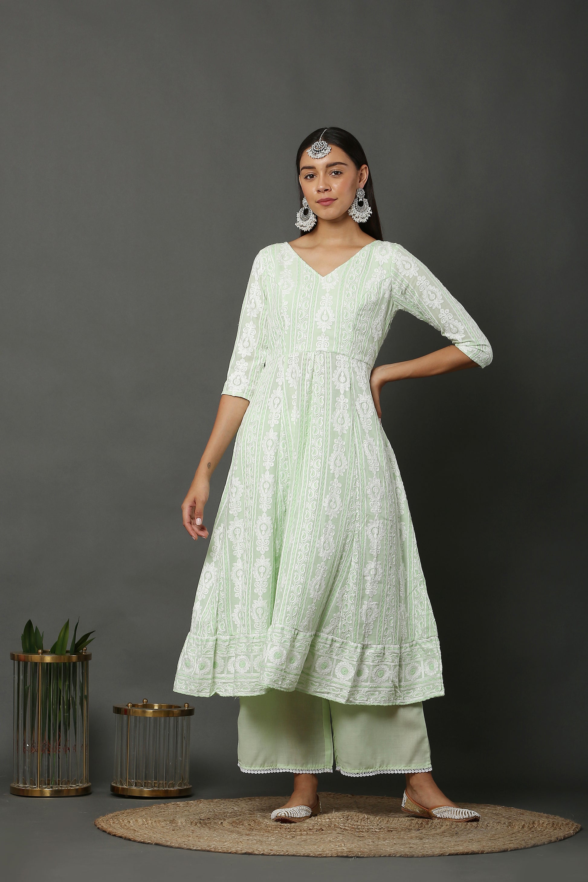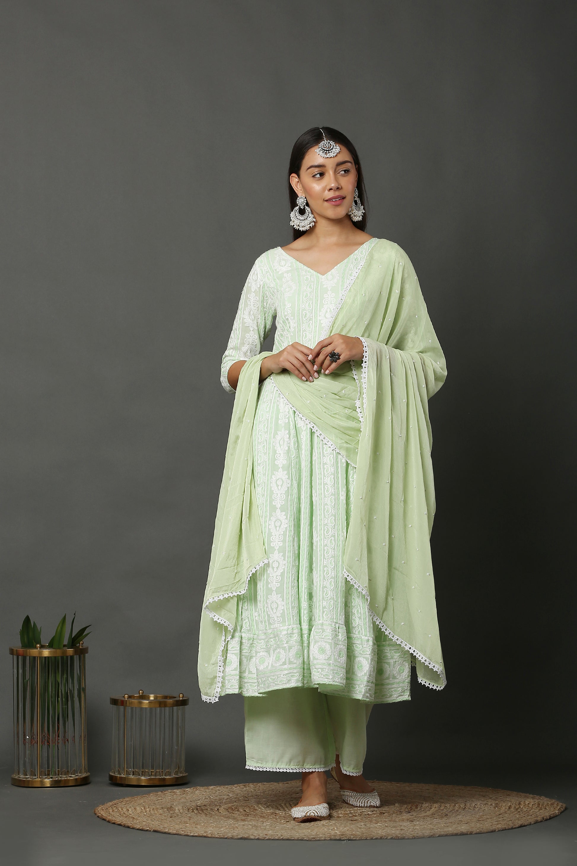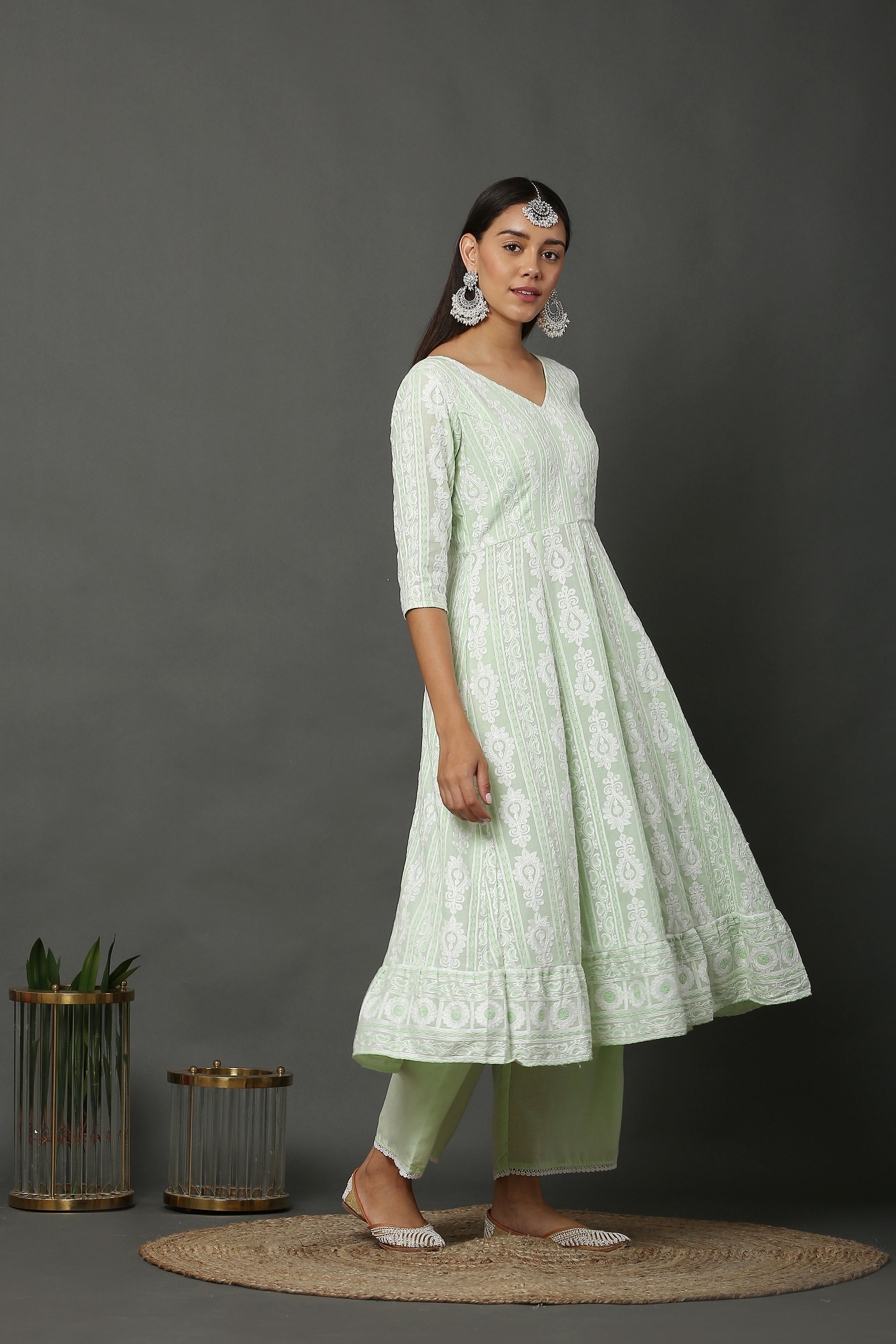 A Classic blend of exquisite craftsmanship and flattering silhouette, this Lavender Chain stitch Anarkali Kurta Set With Dupatta is a dream ensemble. Enlivened with intricate floral chain stitch embroidery in chikankari style and with a deep round back with tie-around tassels, it gives a beautiful fit and looks so elegant. The set comes with a beautiful matching chiffon butti dupatta , outlined with white lace which adds so much grace to the whole look. Pair it with your favorite earrings and rock your festivities.