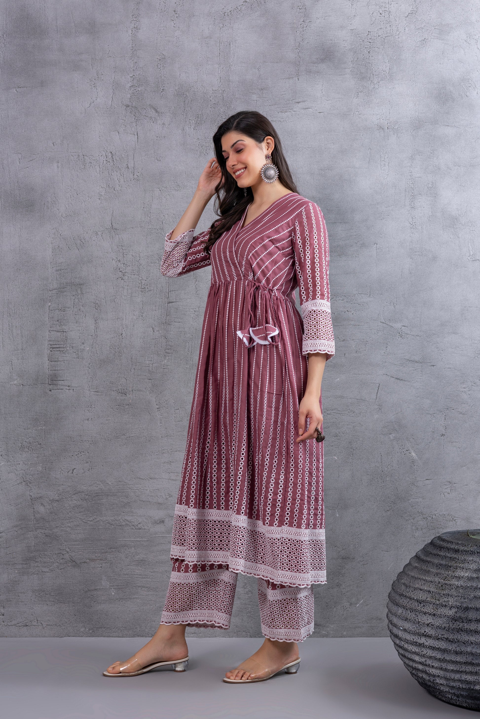 Make a style statement with our signature Angrakha-style Kurta Set, crafted in breathable cotton and elevated with intricate Schiffli embroidery. This Dusty Pink ensemble features a flattering wrap silhouette with tie-up tassel details at the waist, enhancing its traditional yet contemporary charm. The full sleeves and hem are highlighted with delicate cutwork-inspired embroidery, giving it a refined finish. Paired with matching scalloped hem pants, this set offers effortless elegance — perfect for festive gatherings, intimate celebrations, or standout everyday wear.