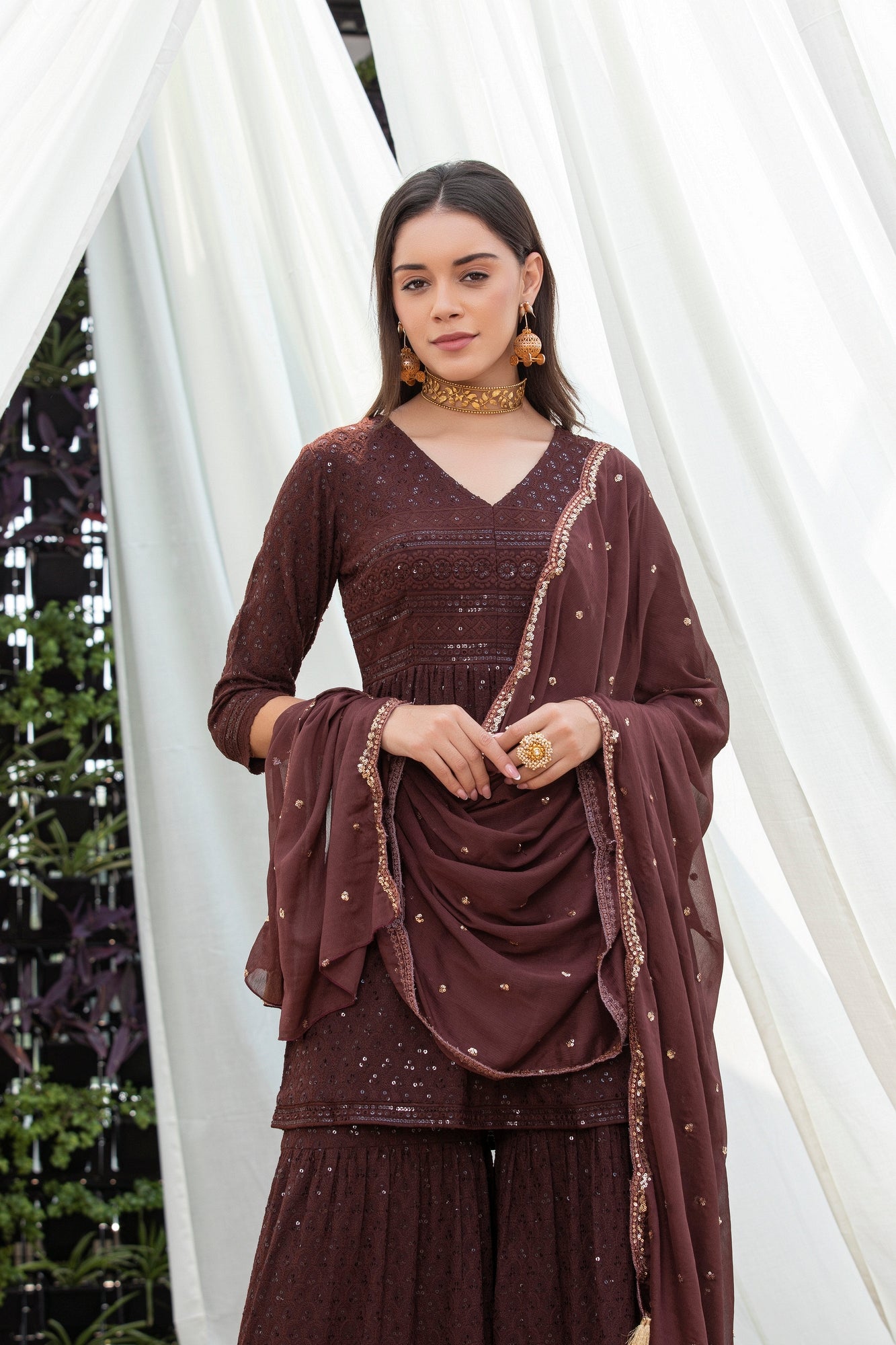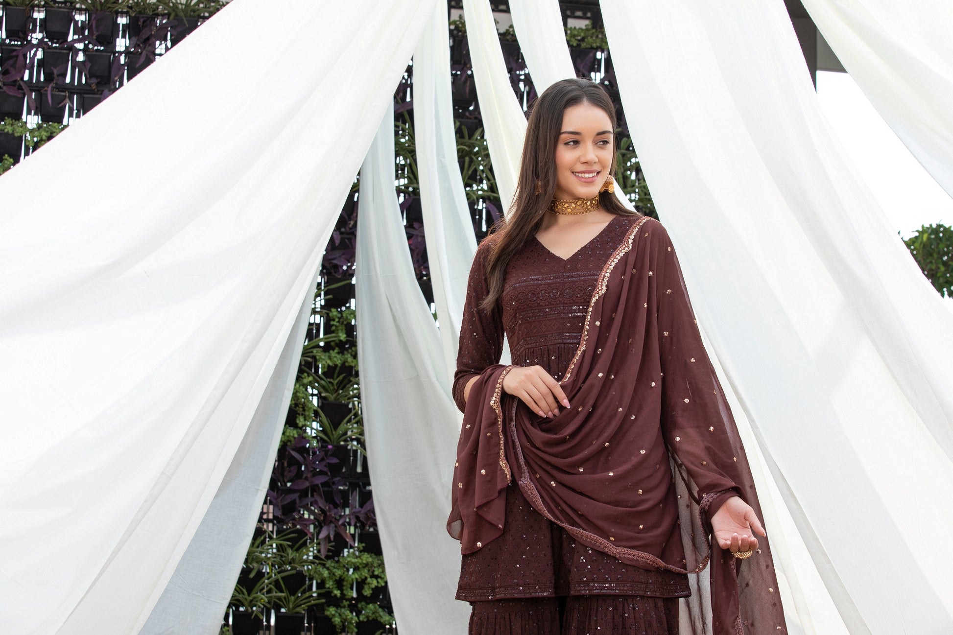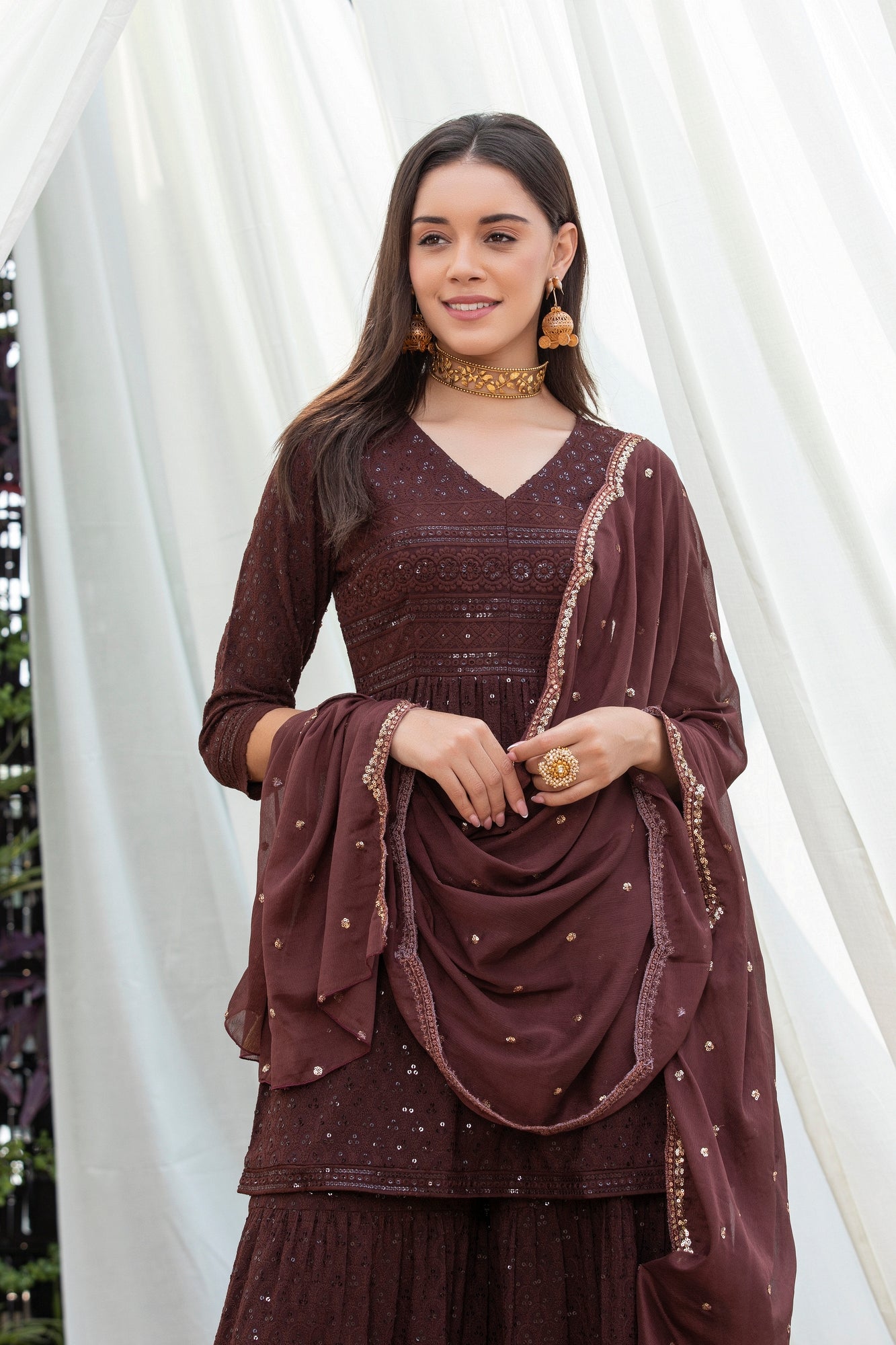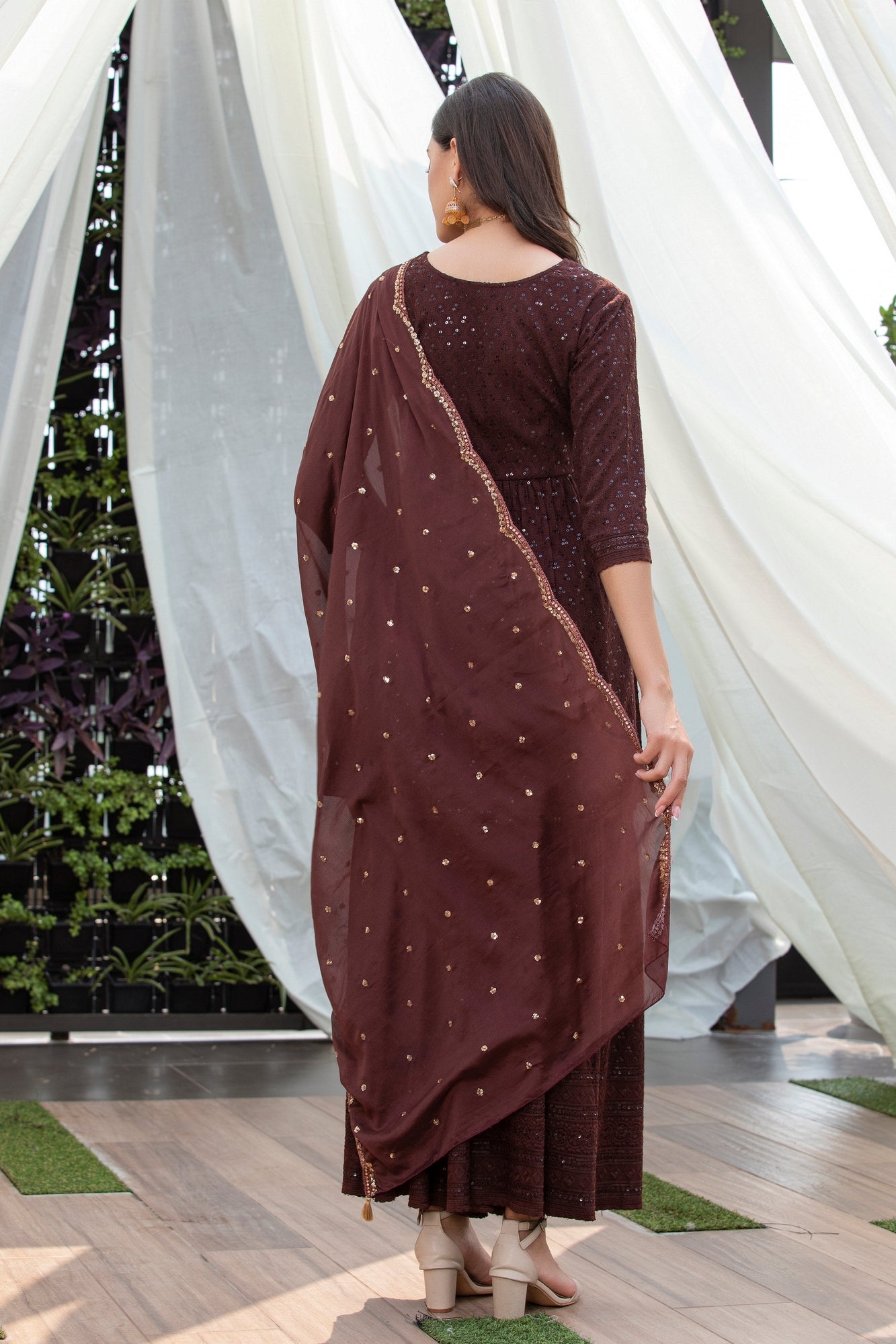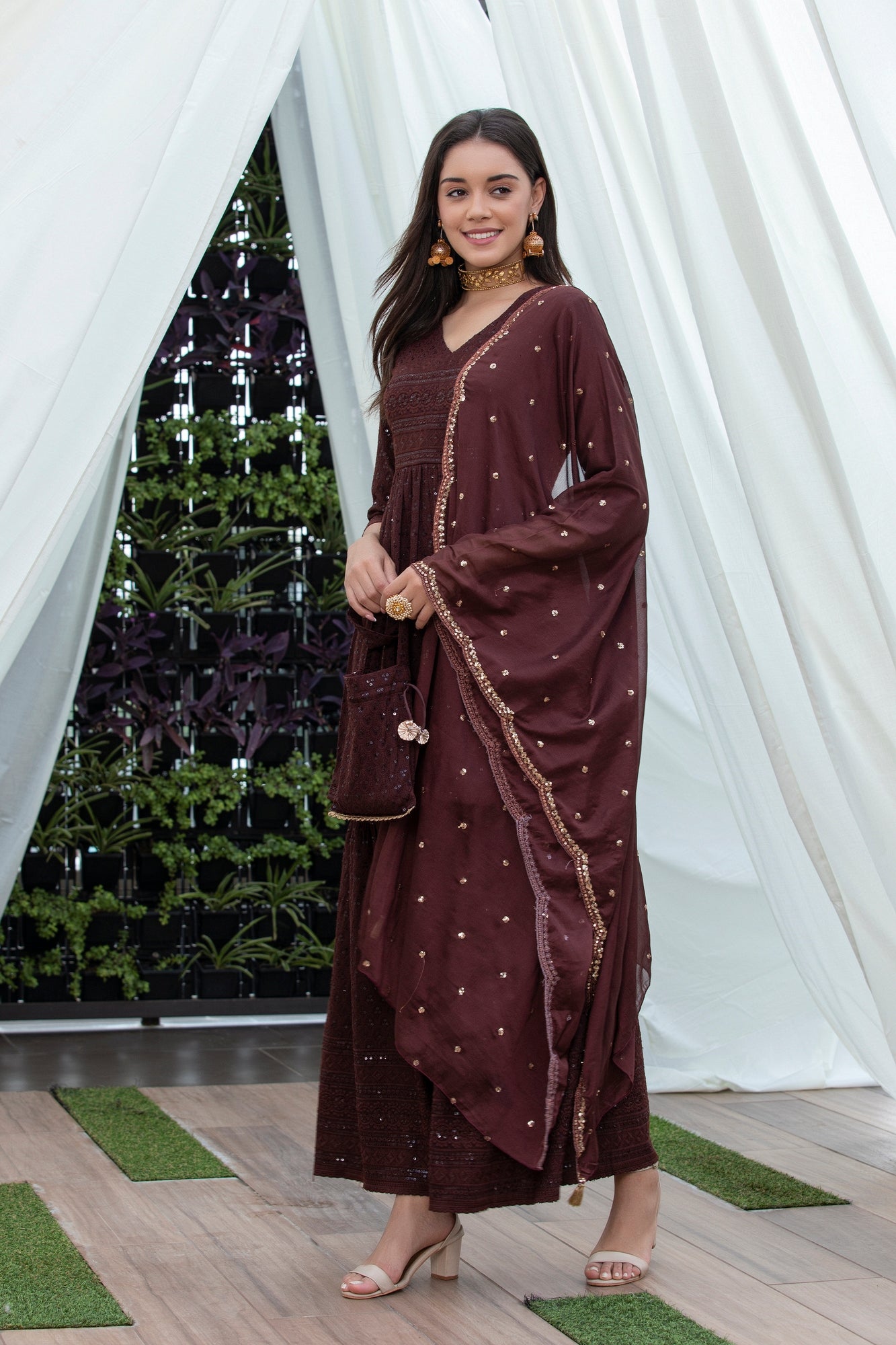 Give a fresh spin to your ethnic wardrobe with this gorgeous mocha sequence embroidered kurta set. Enlivened with overall intricate embroidery and fit and flare pattern highlighting the yoke and fit and flare palazzo, this set has a beautiful fit and looks so feminine. It comes with matching scallop sequence embroidered dupatta that elevates the whole look of the outfit.