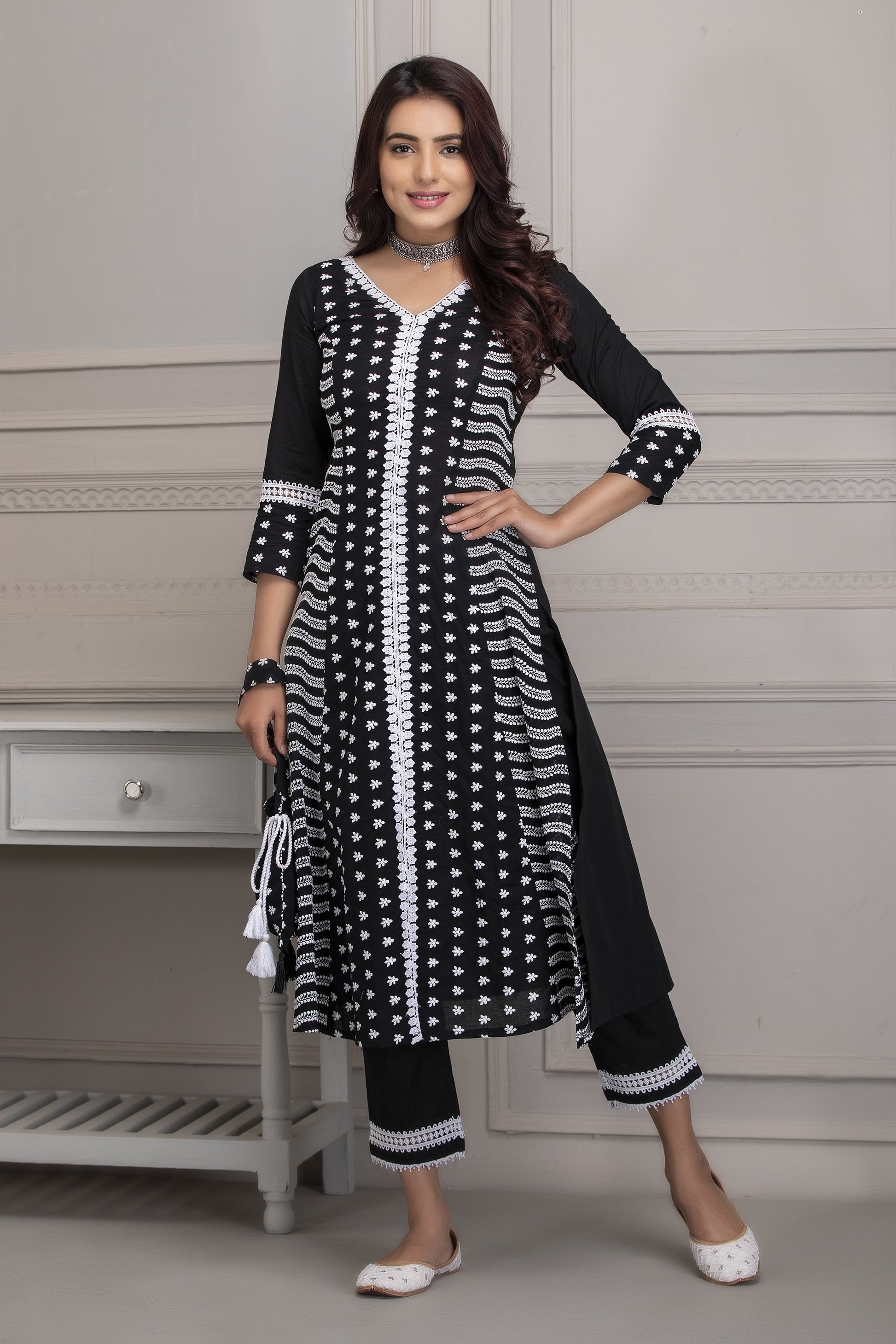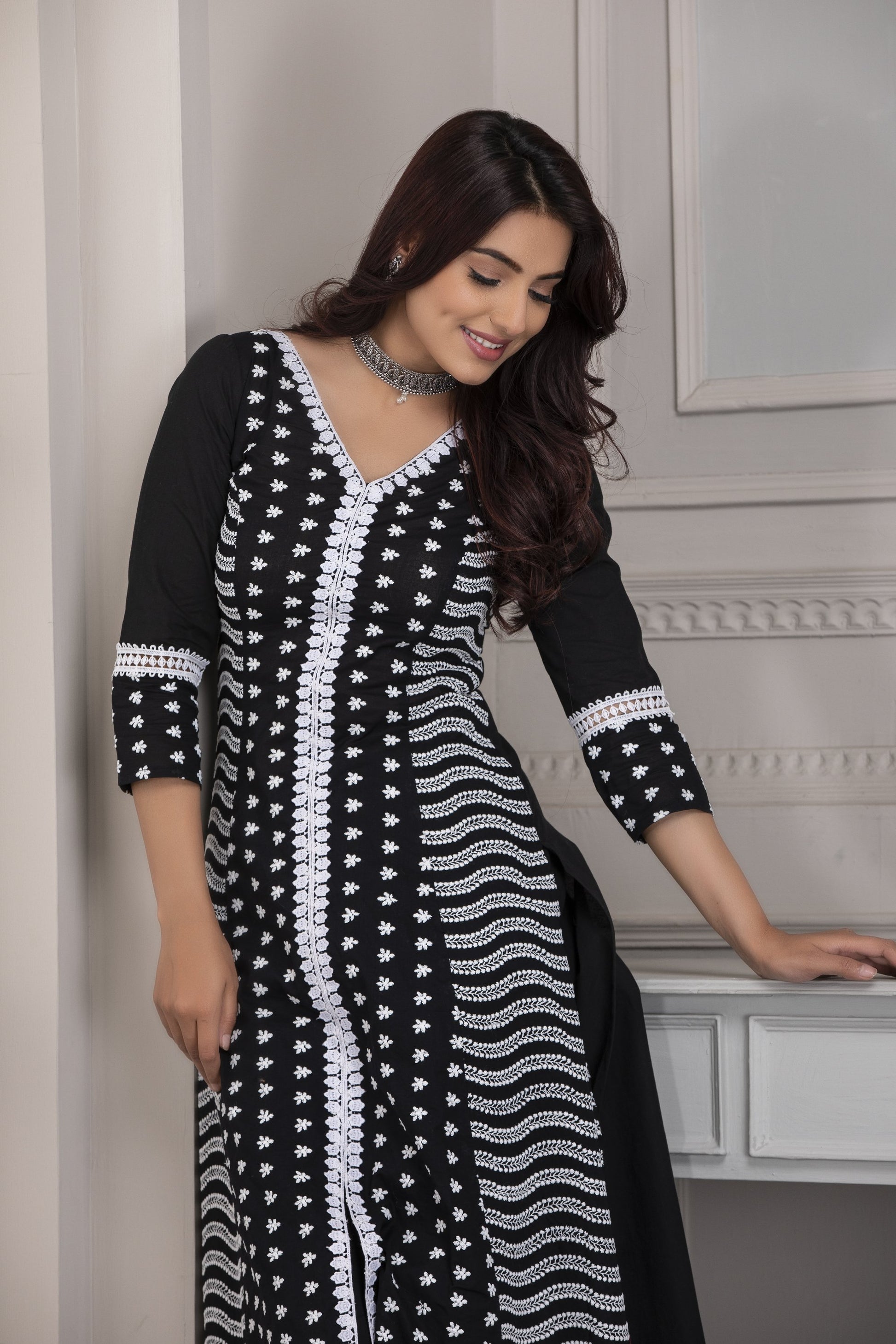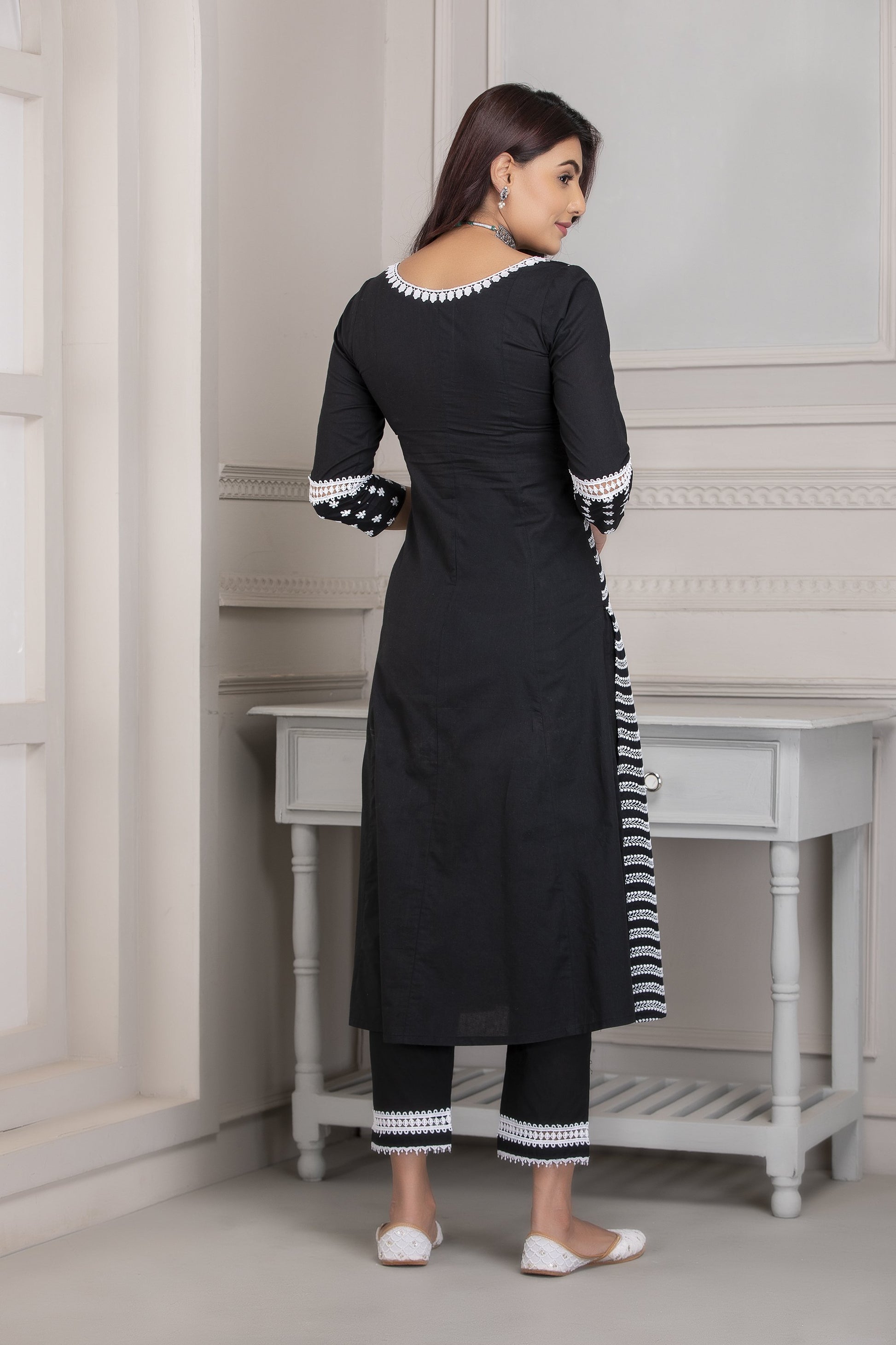Personify sheer grace and elegance, as we enter the festive season with our beautiful Black Embroidered Kurta enlivened with lace outlined on neck and stitched with a fusion of two embroideries highlighted with vertical lace detailing in the front. Creating a pattern play with black straight pants with lace detailing at hem . Paired together with silver jewelry and matching juttis create a stunning evening look.