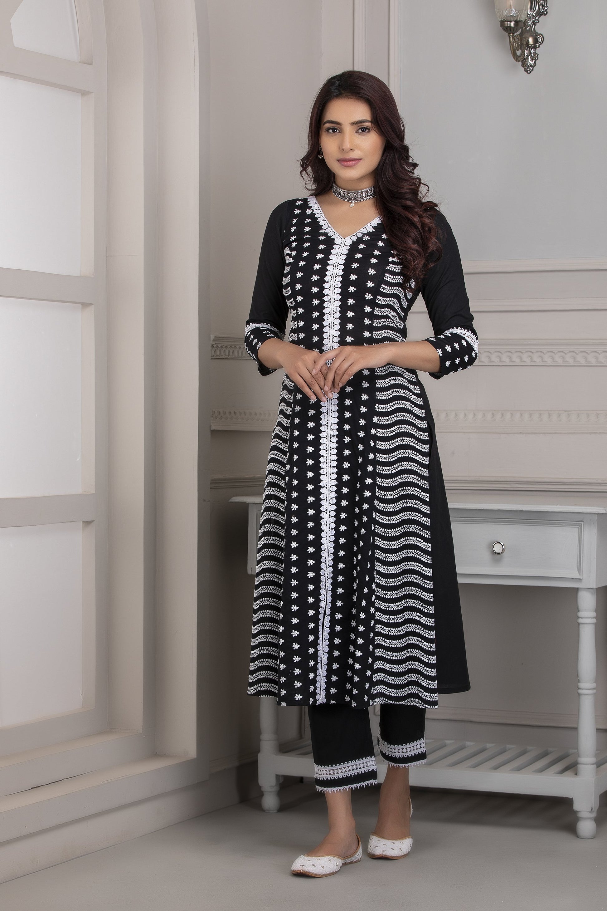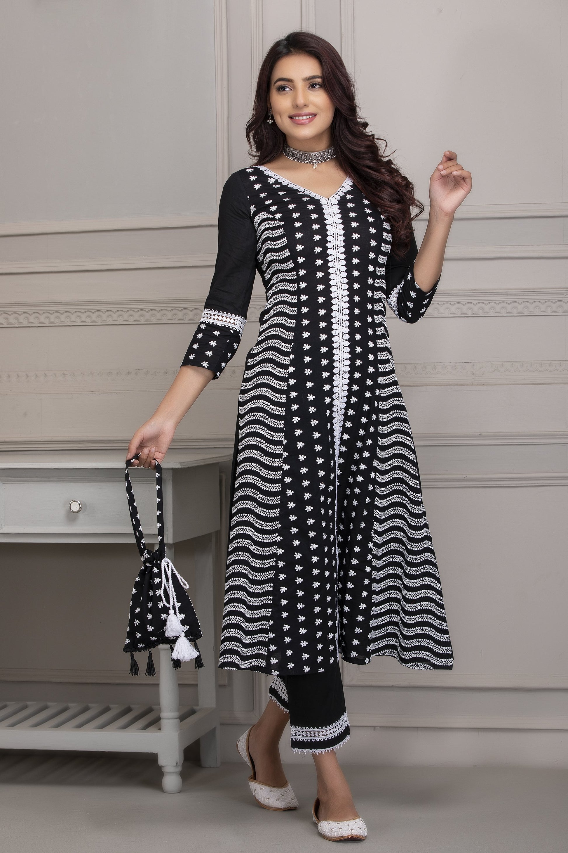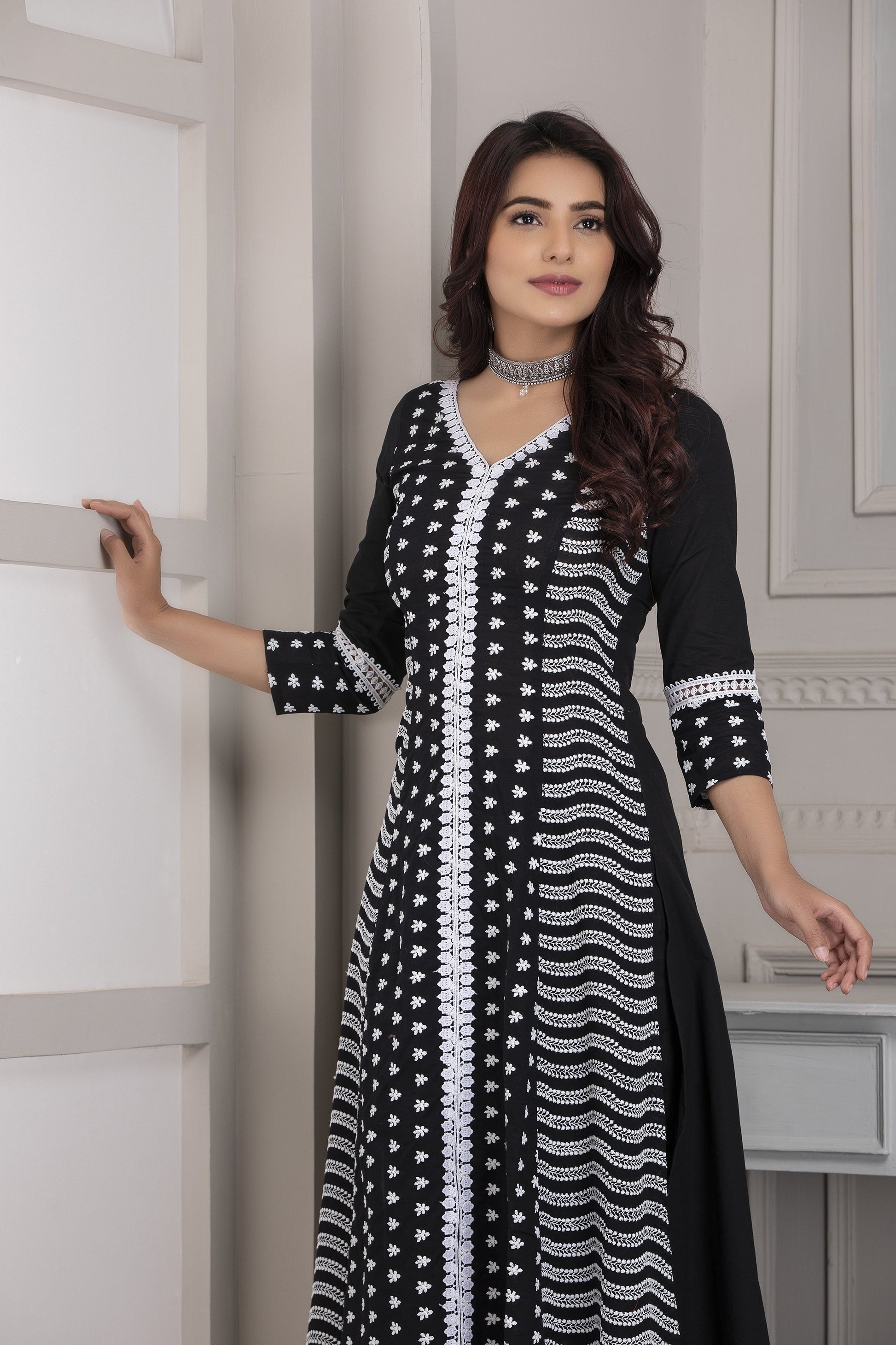Personify sheer grace and elegance, as we enter the festive season with our beautiful Black Embroidered Kurta enlivened with lace outlined on neck and stitched with a fusion of two embroideries highlighted with vertical lace detailing in the front. Creating a pattern play with black straight pants with lace detailing at hem . Paired together with silver jewelry and matching juttis create a stunning evening look.