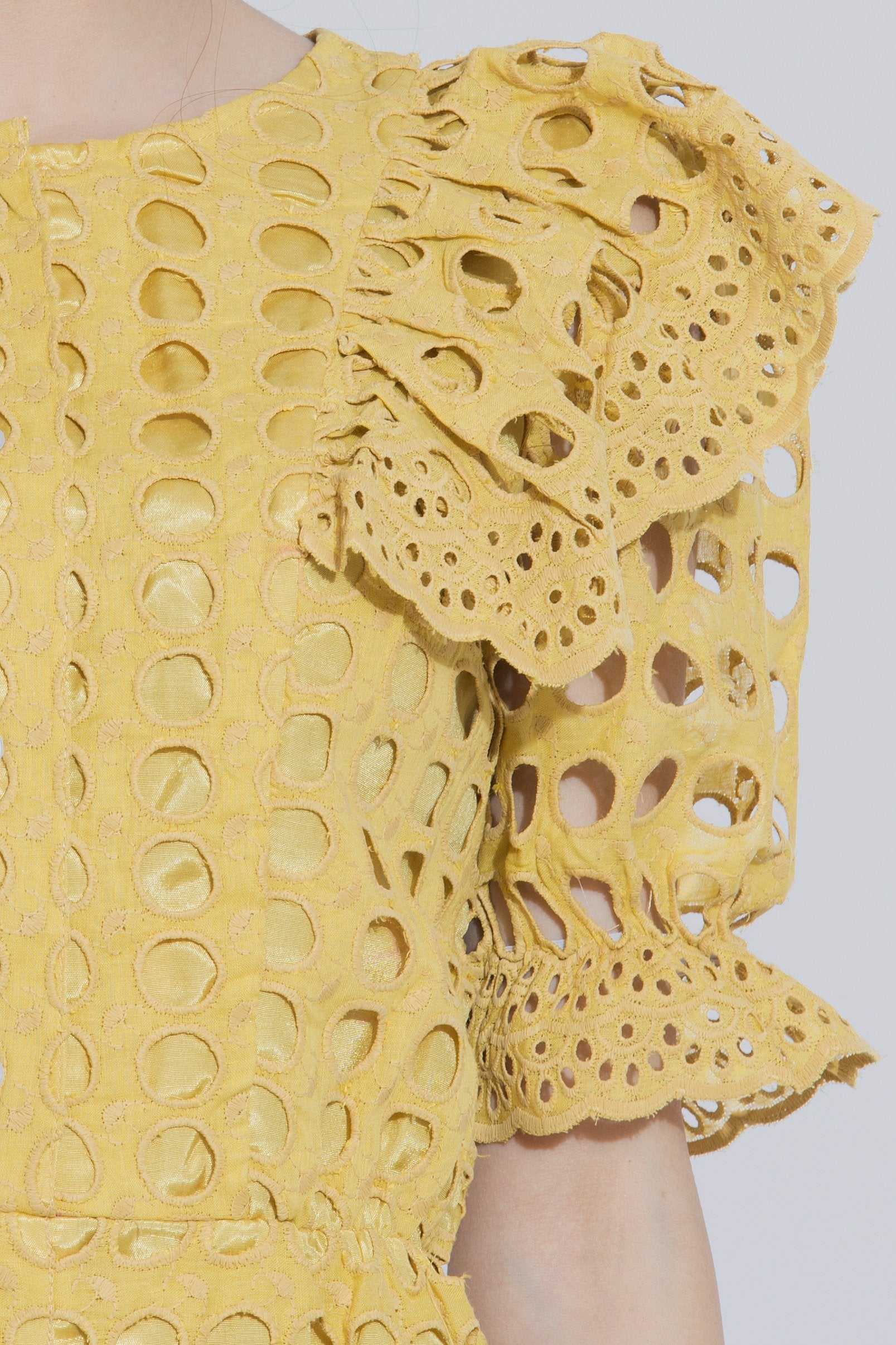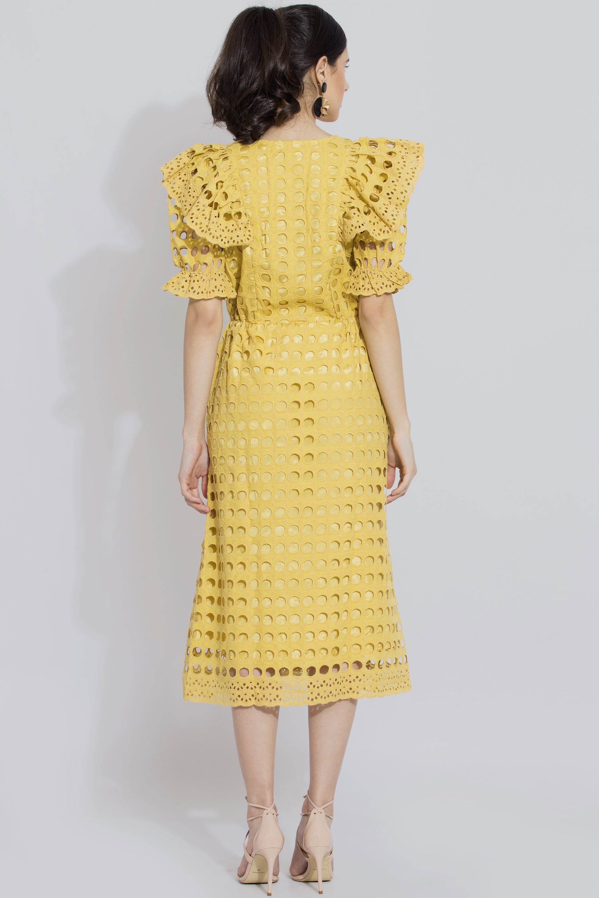 Unleash your stylish self and be the first to grab this uber chic mustard midi dress from SEW. From unique peek-a-boo delicately crafted fabric to classic ruffle design along the sleeves, this dress is a head turner. From brunches to sunday musings this dress is a statement you would love to flaunt. The Button detailings in the centre and elastic at waist gives an elegant fit. Pair it with minimal accessories and be look your stylish best.