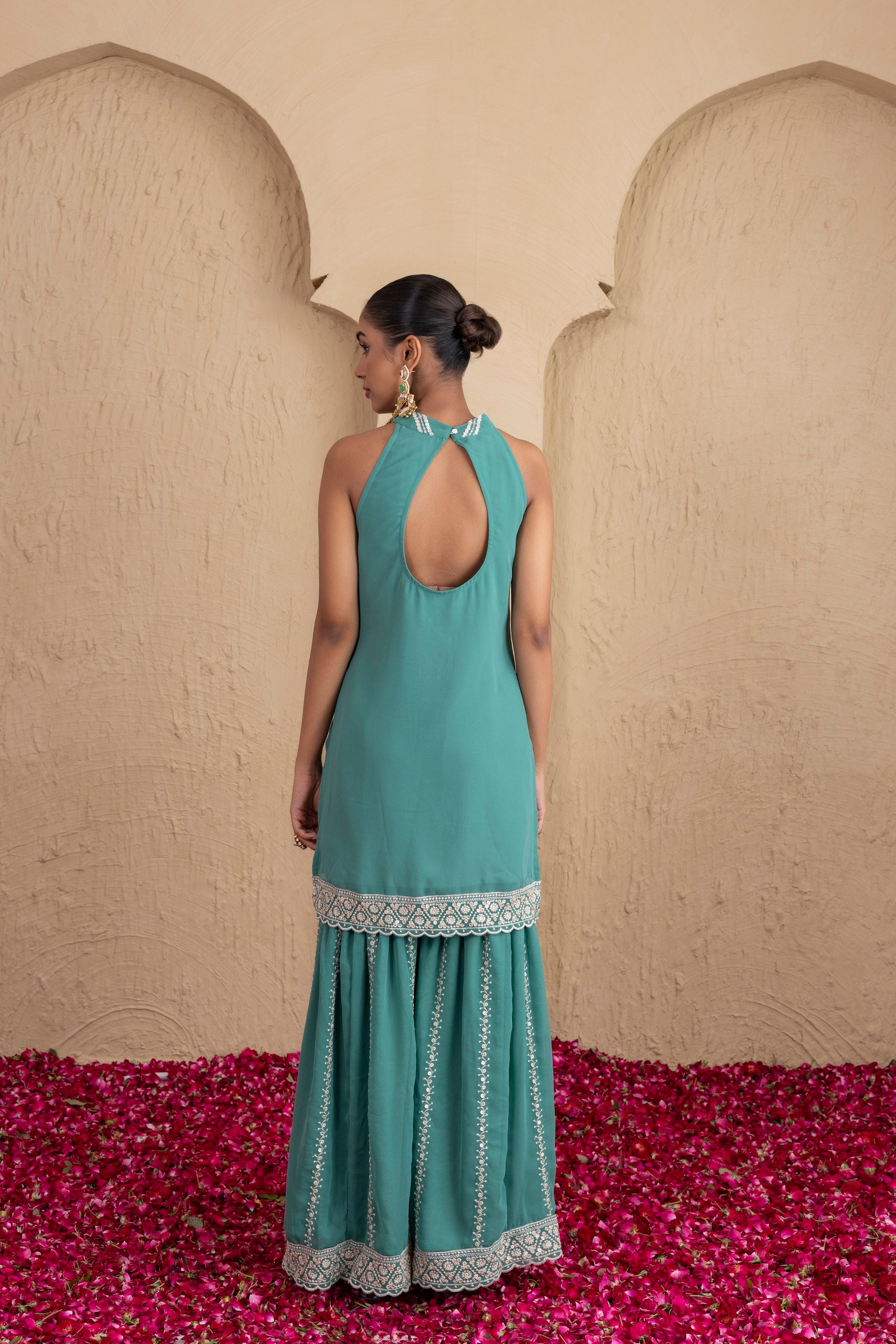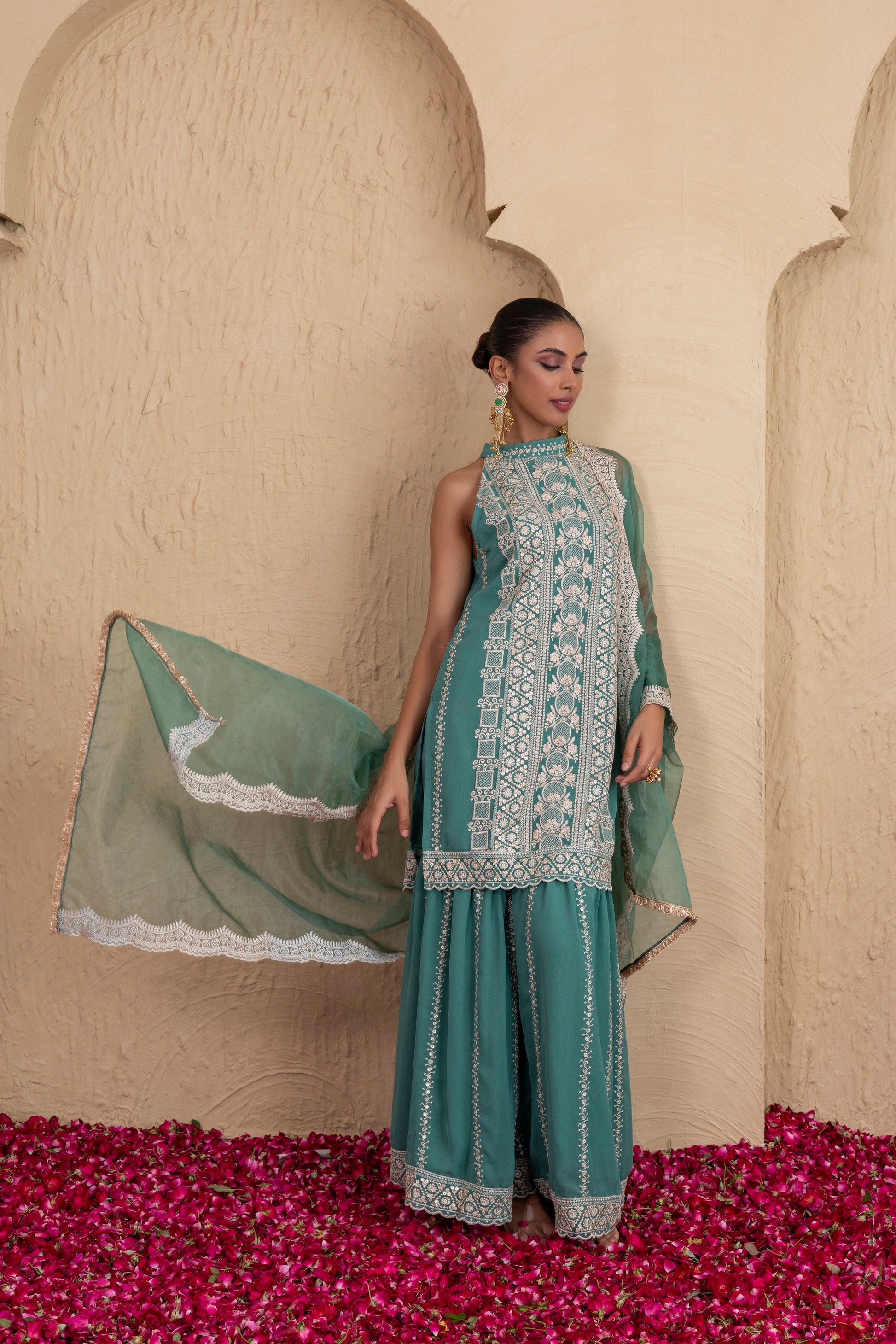 Channel timeless grace in this stunning georgette suit set, intricately adorned with pastel gold embroidery and delicate dull gold sequins. The kurta features rich Schiffli embroidery that adds a heritage touch, while the flared pants enhance the silhouette with understated elegance. Paired with a matching organza dupatta featuring beautifully scalloped embroidered borders, this ensemble is perfect for festive gatherings, intimate weddings, or evening soirées. A refined blend of tradition and sophistication in every stitch.