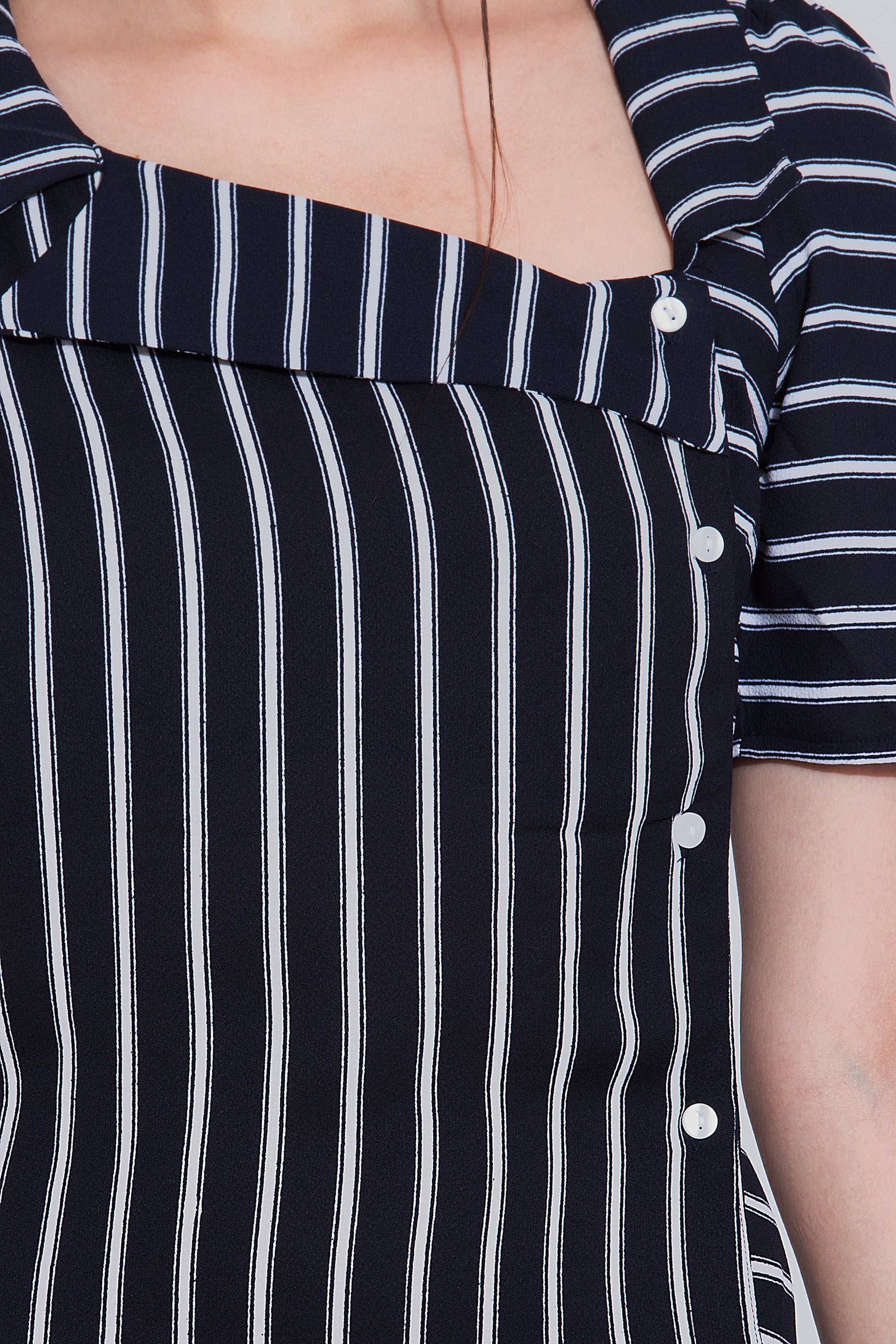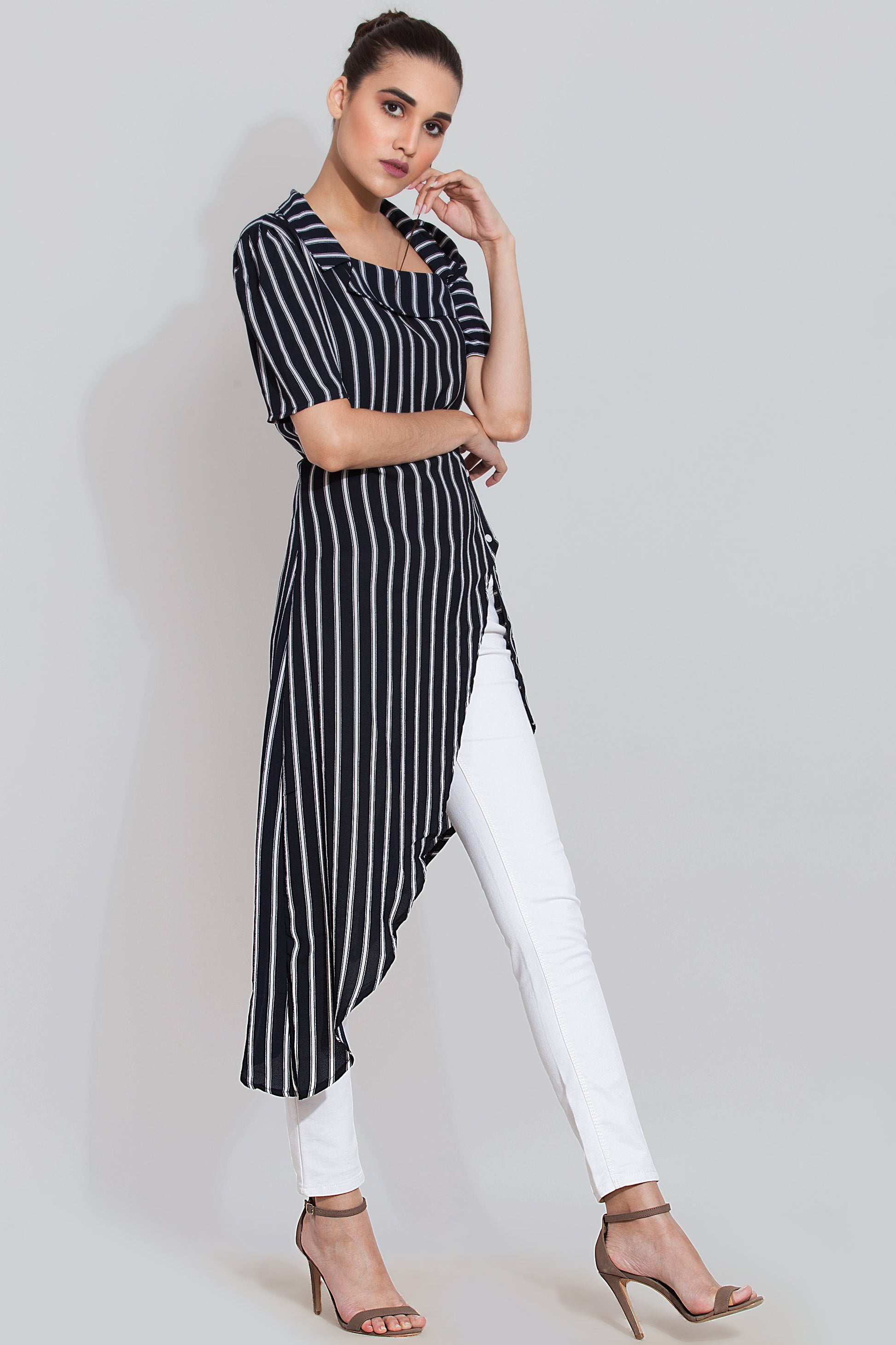This navy stripes maxi top is a wardrobe staple every girl should own. It has a beautifully designed collared neck with asymmetrical hem that fits beautifully. We have paired it with a white pants and pumps.