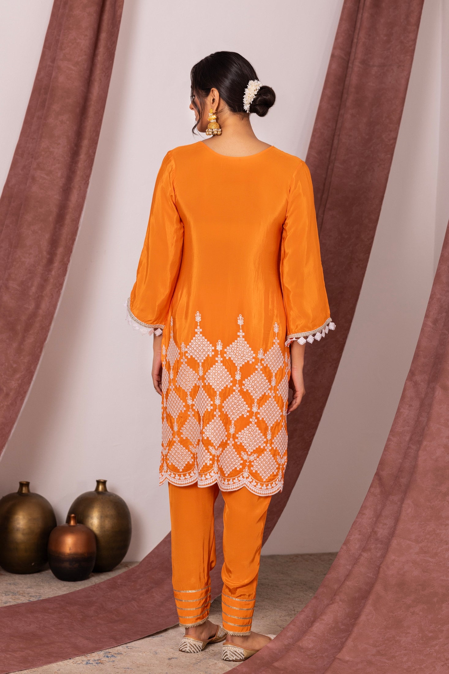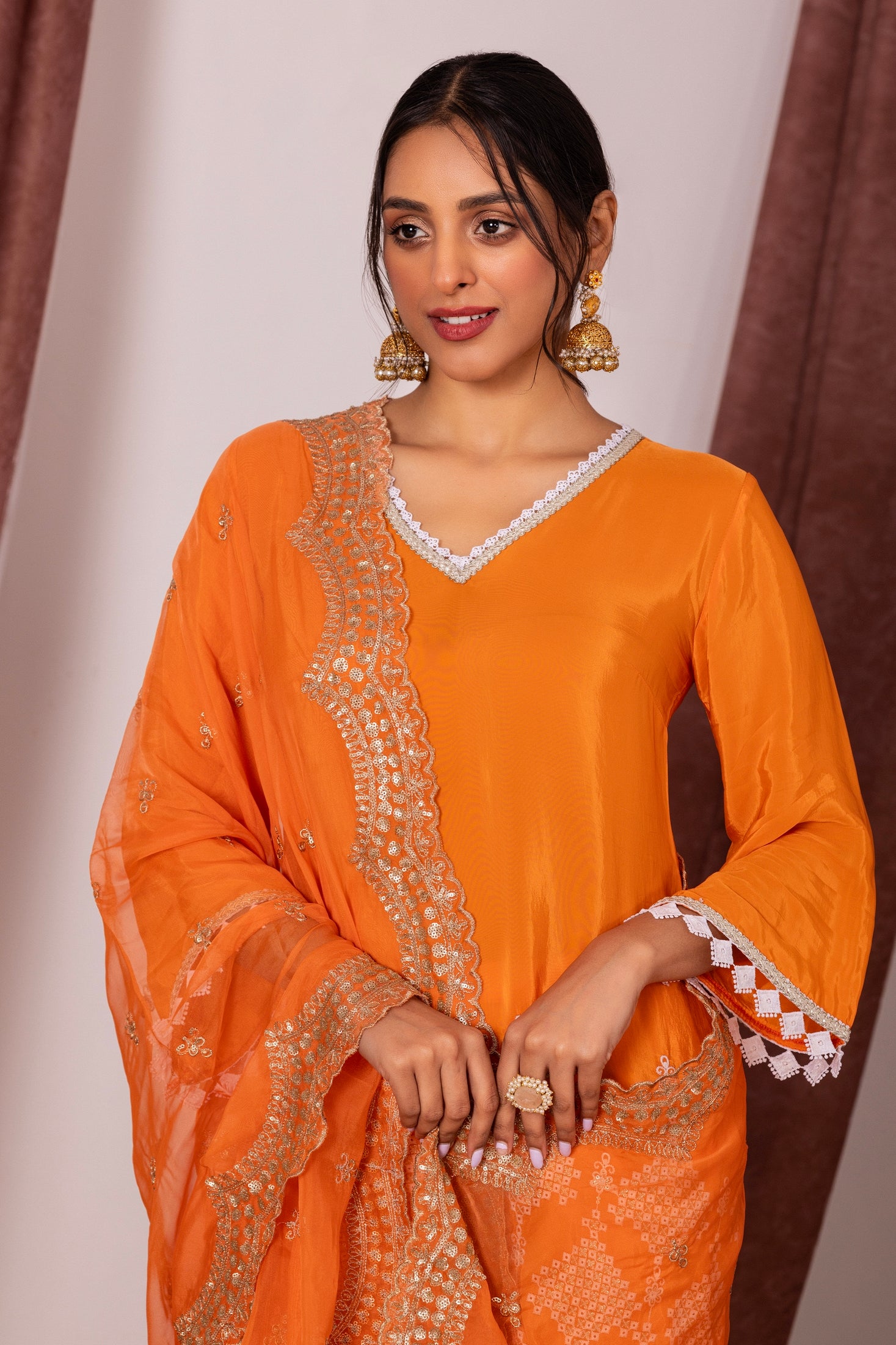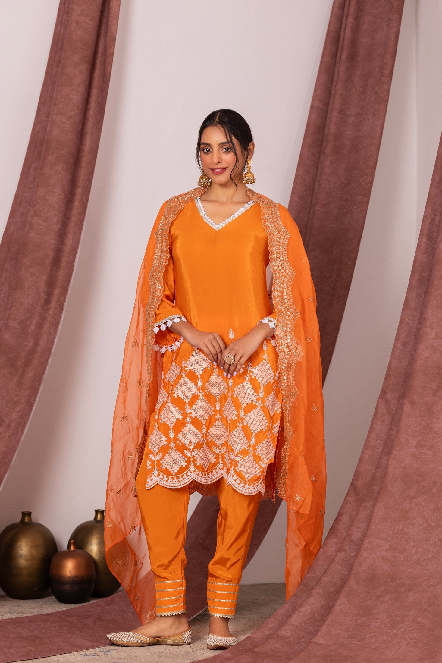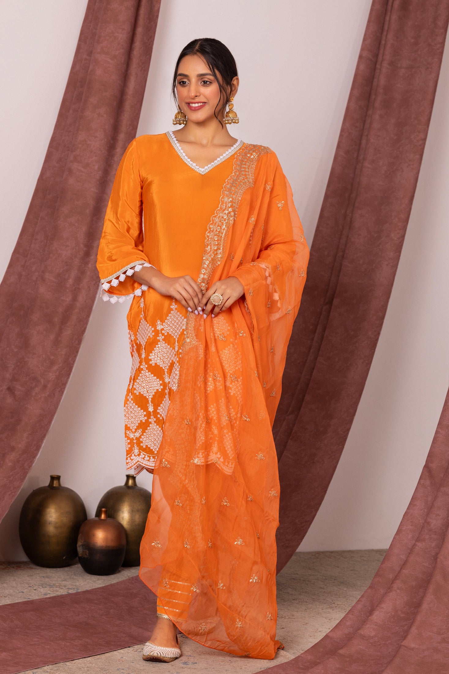 ORANGE CREPE SUIT SET WITH ORGANZA DUPATTA