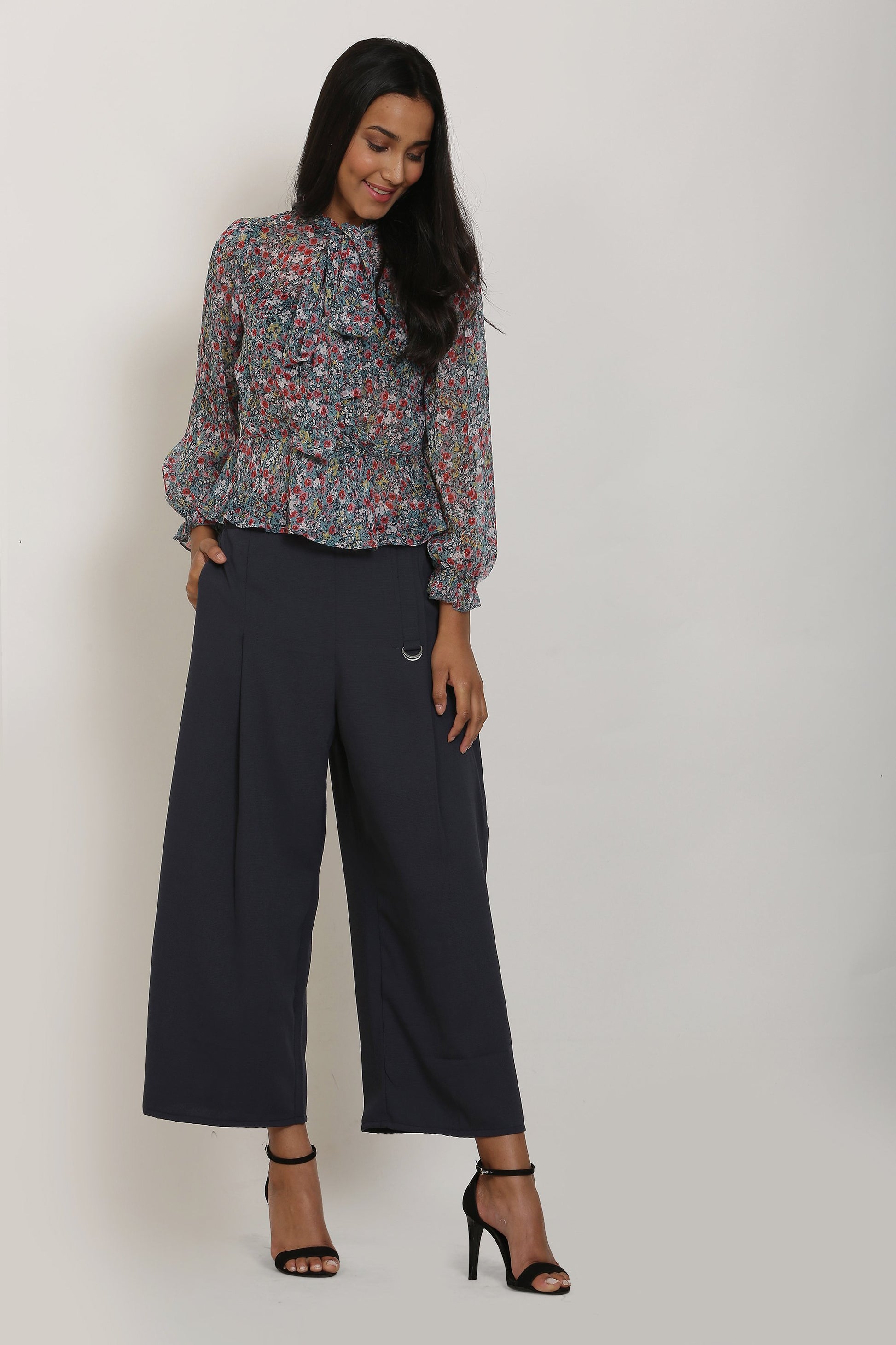 We have paired it with our chiffon printed top and heels.