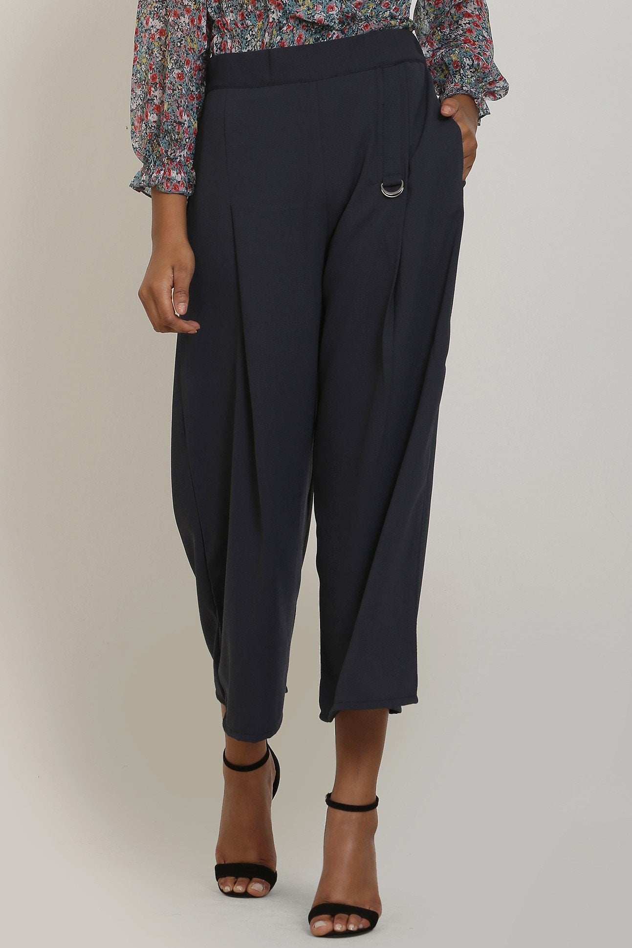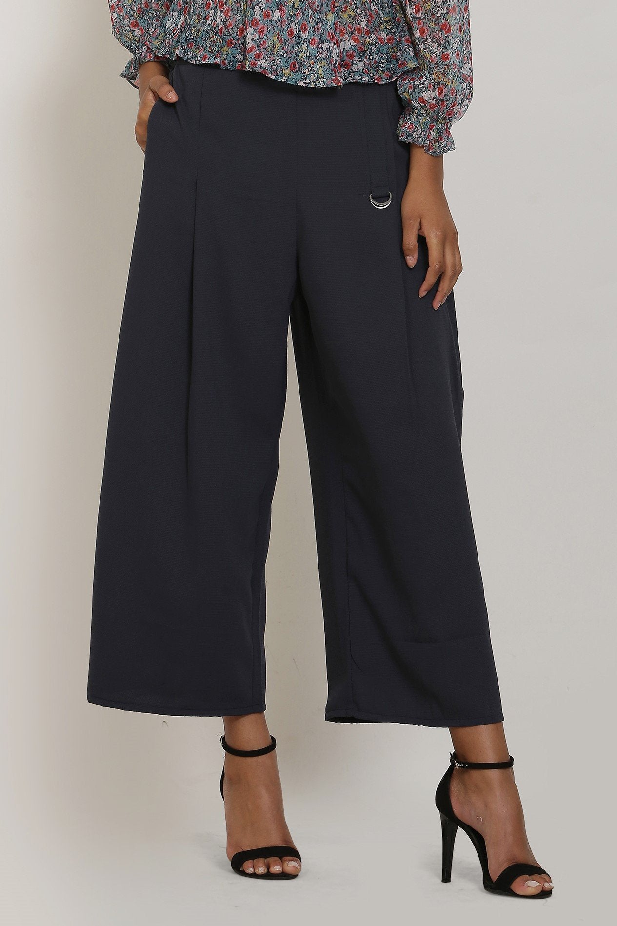 Stylish yet comfortable , this stone blue culottes will see you through a myriad of social occasions. High waist belt gives a shape definition while the flared cut ensure relaxed fit. The front pleats with D-buckle detailing is the unique style of the pants. Crafted with poly moss fabric and elasticized belt, the pants will give all day comfort and stone blue color adds to its universal appeal. Wear it to your lounge parties to make a statement.