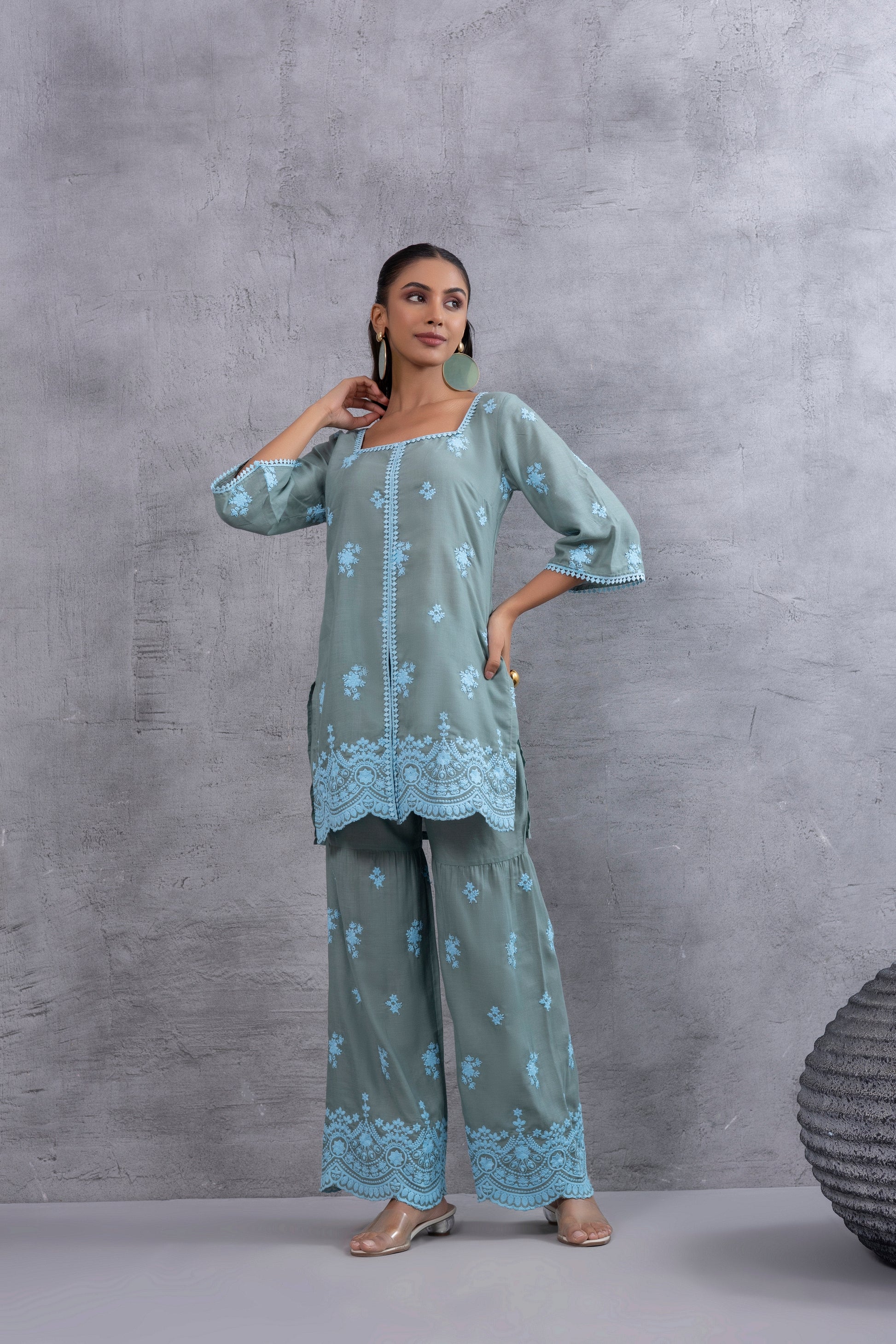 DUSTY BASIL GREEN BLUE EMBROIDERED SUIT SET