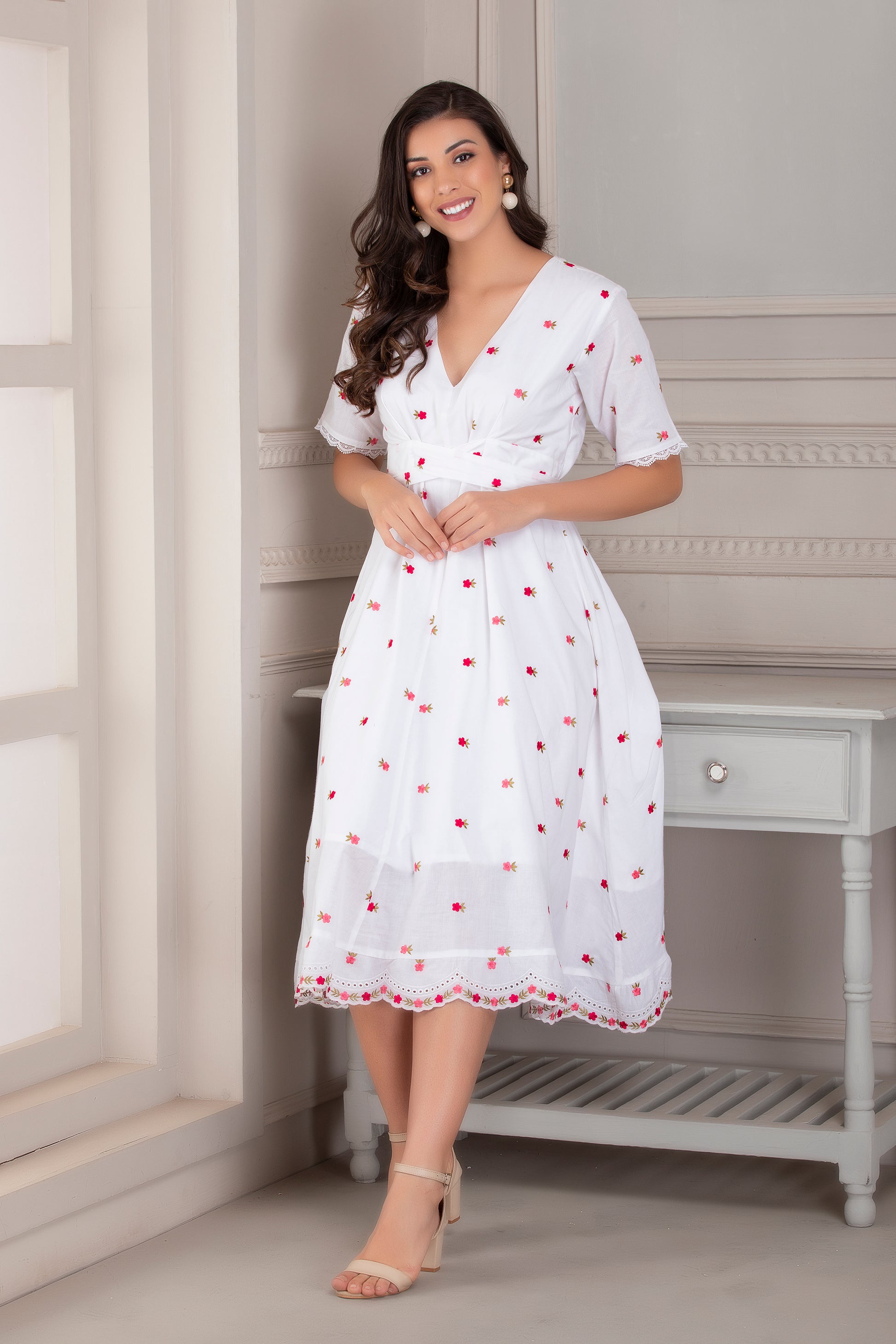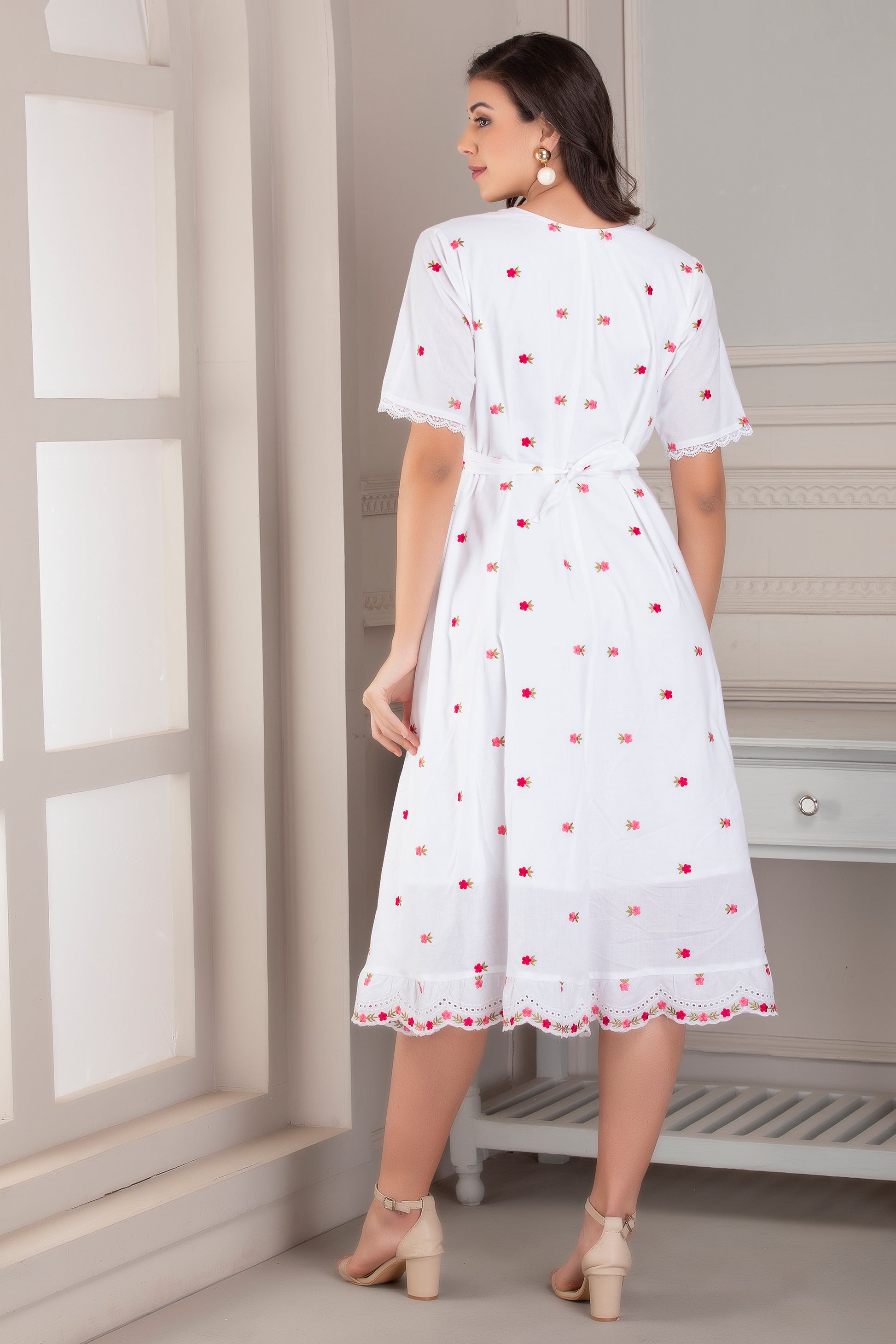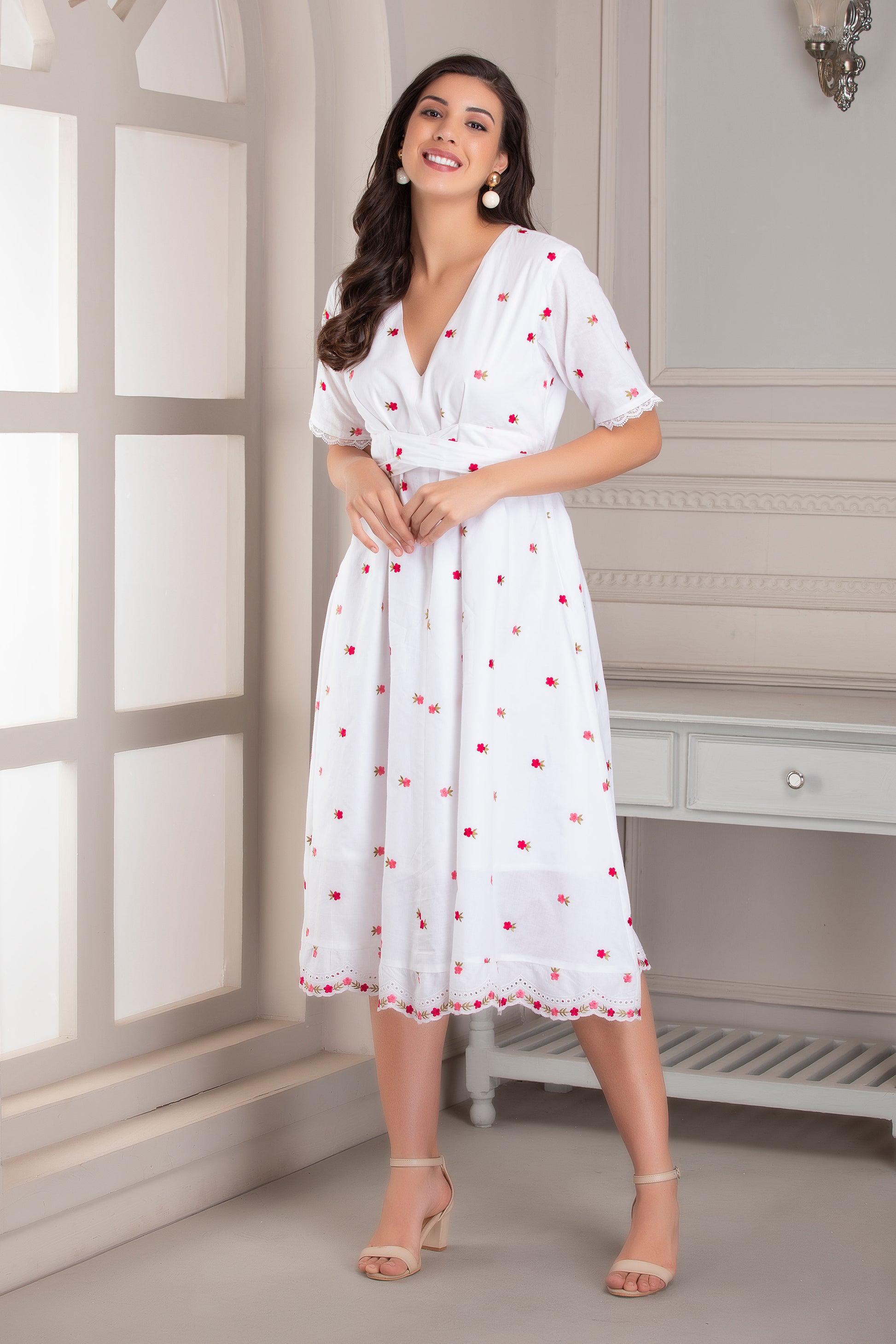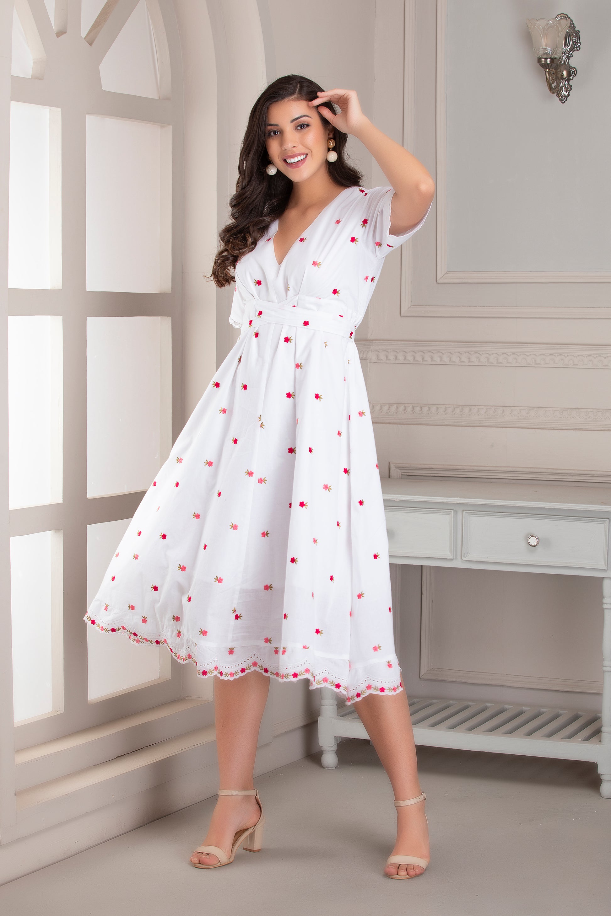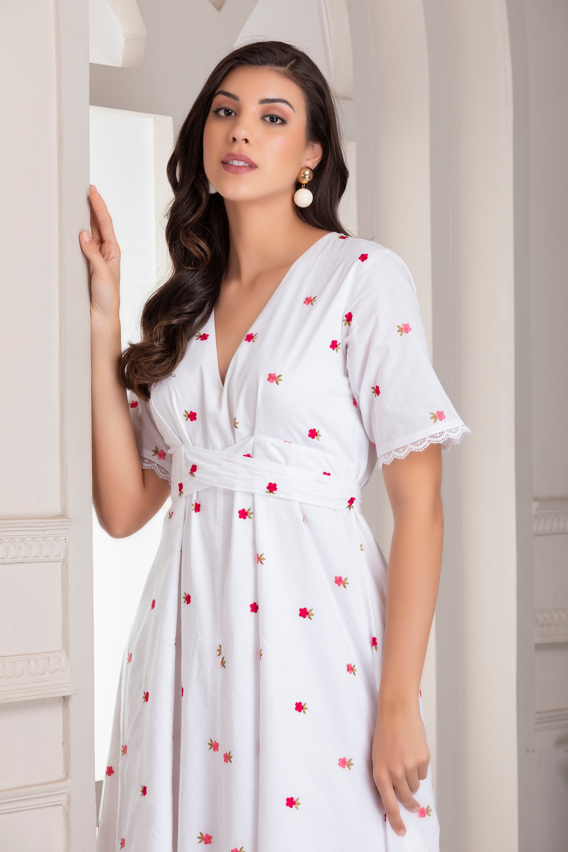 Give your closet something stylish yet comfortable with this white floral embroidered indie dress from SEW. Crafted with beautiful embroidered floral fabric with lace embossed loose sleeves and a cross tie belt at waist, this dress is going to garner you a lot of compliments. Twirl and swirl in this cute dress with lots of flare and fit as tie at back as per your comfort and fit.