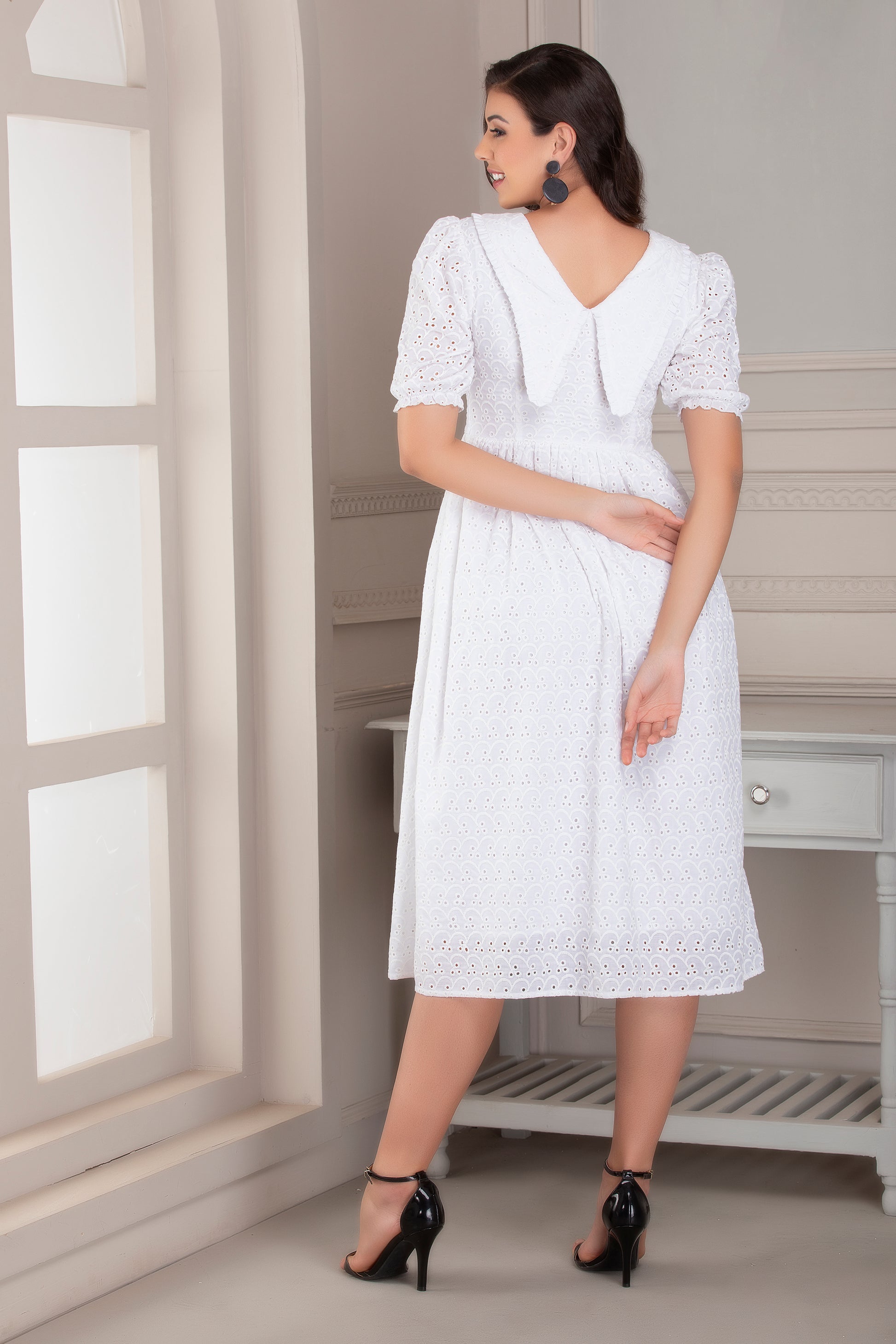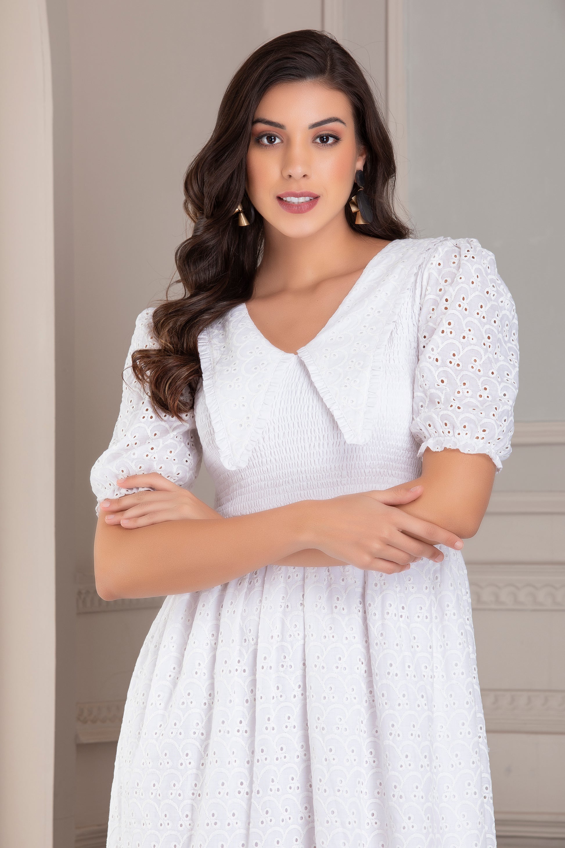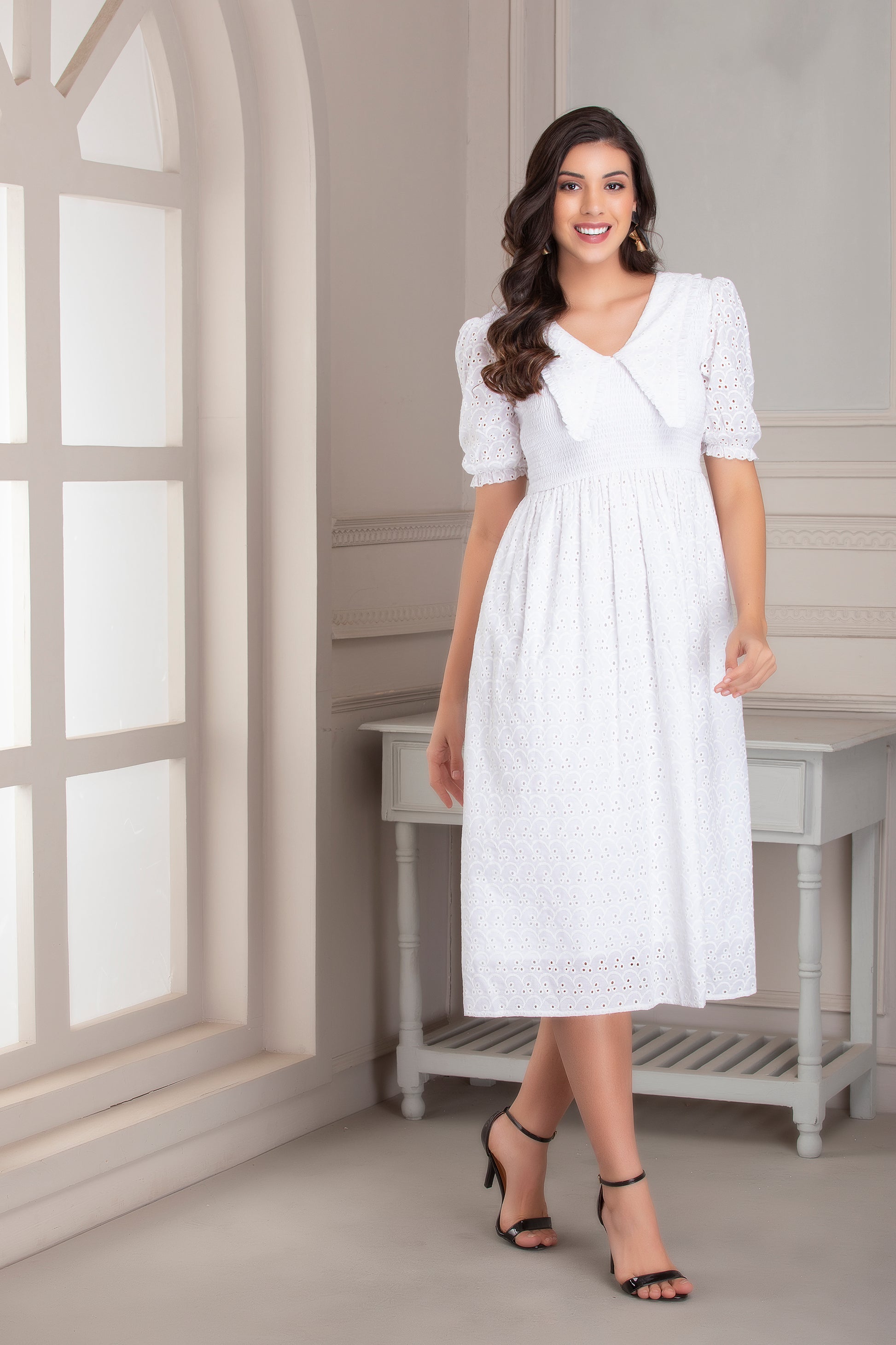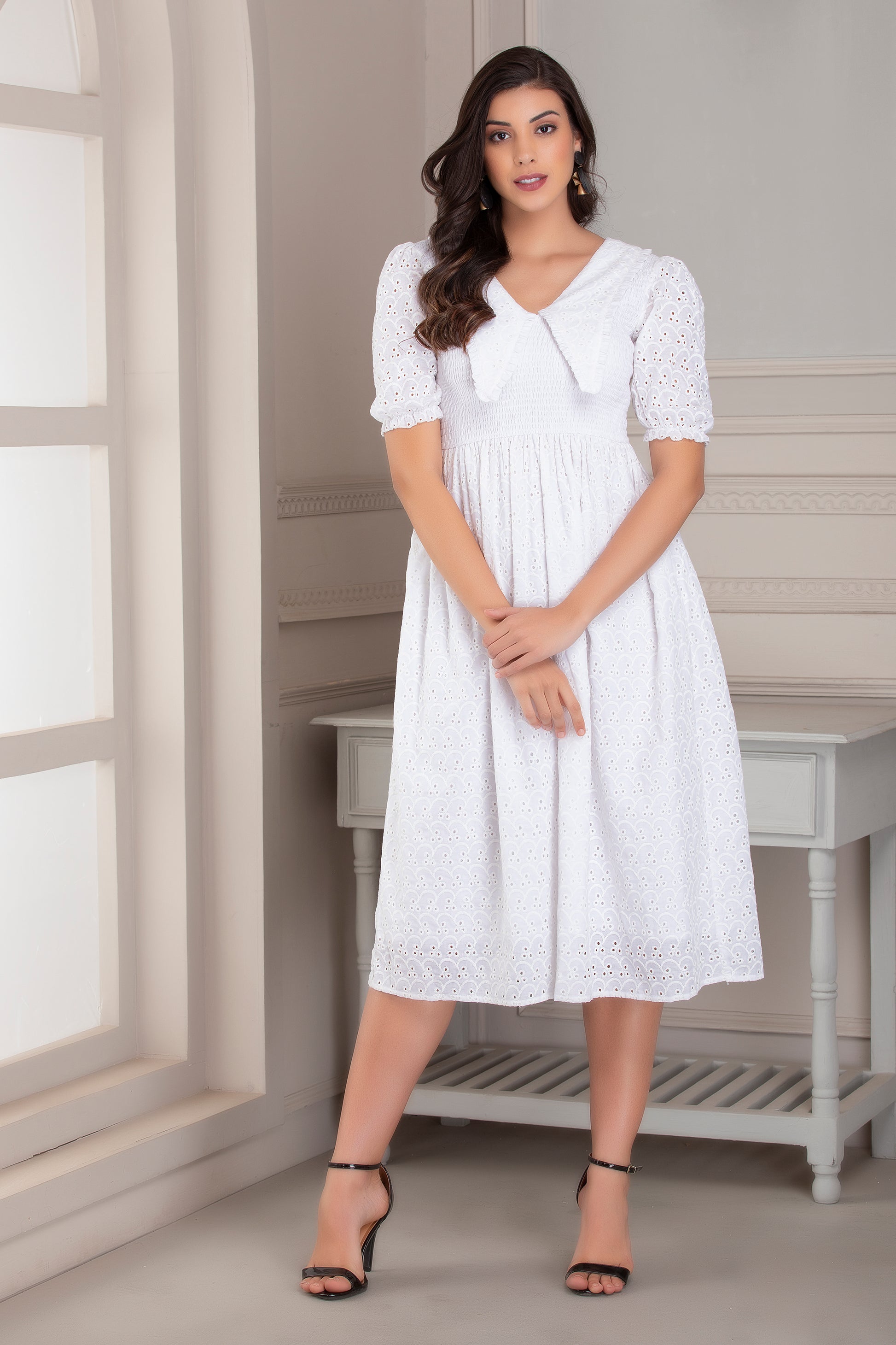 Step out in a cute vintage vibes with this feminine White Long Collared Sciffili Dress that has alluring cutouts to balance its midi length. Smocked Yoke Front and Back hugs your body to give that perfect shape and the long collars highlighted with frills looks so stylish. The Fit and flare pattern with embroidered skirt adds to the beauty and silhouette.