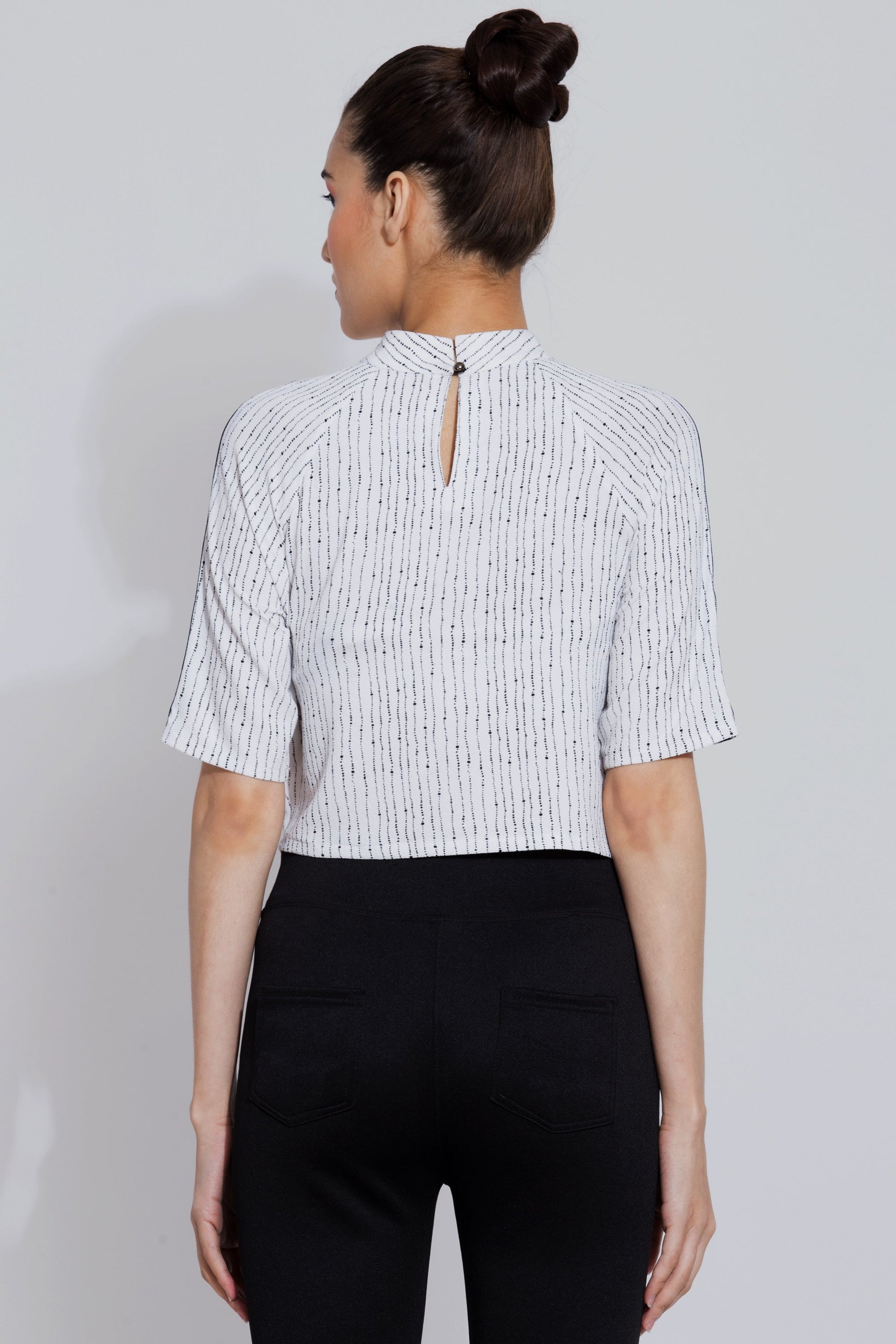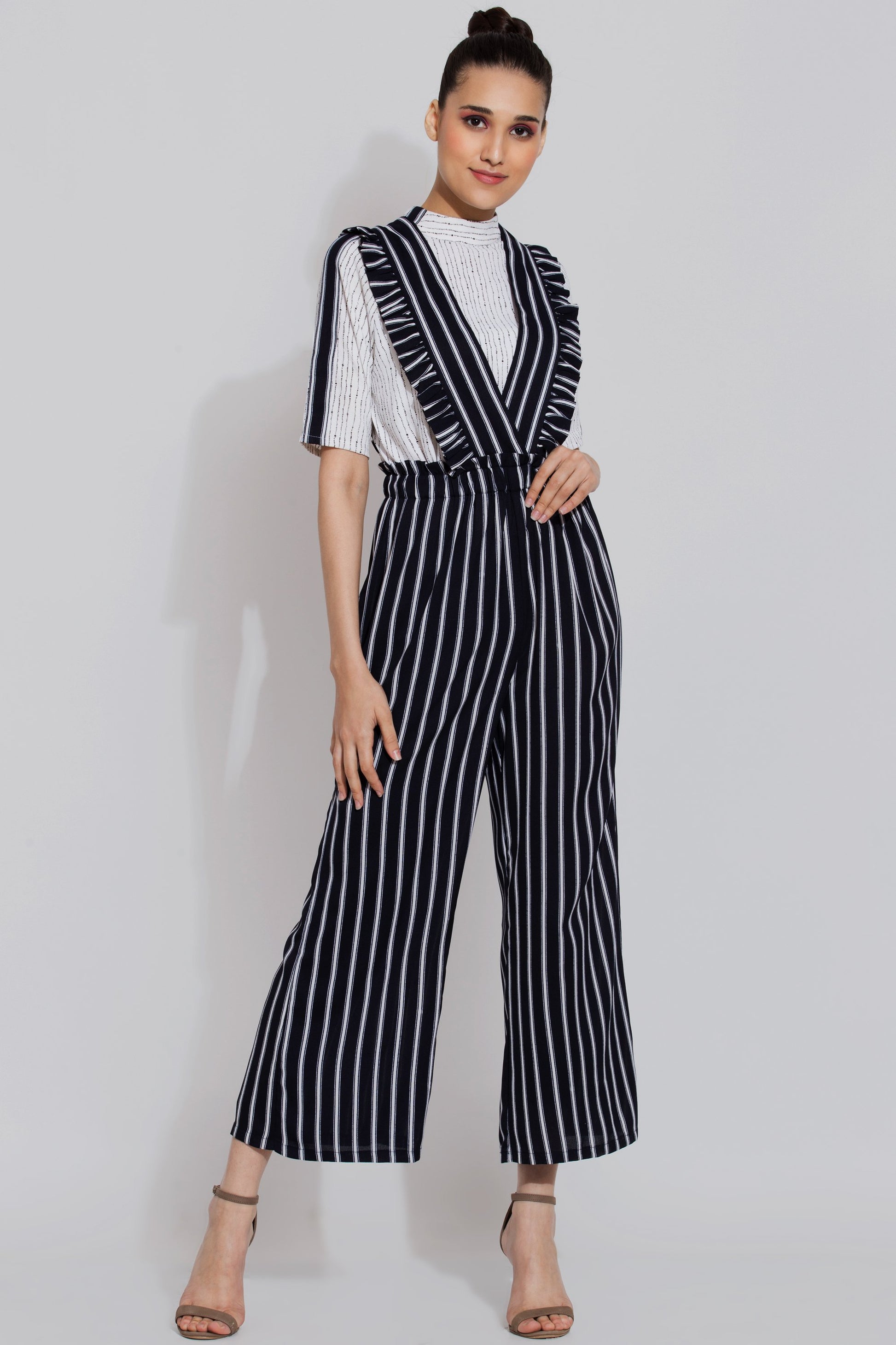 Stitched with excellence, short tops for girls is a timeless fashion staple. The beautiful striped band detailing from collar to sleeves, breaking the monotone of the top is a beautiful pattern. Made from poly moss fabric, the fabric has stretch in it and fits the body really well. For a perfect match, we have paired it with our navy ruffle pants to create a perfect evening look. Crop Top and Jeans is a perfect combination for any casual look.