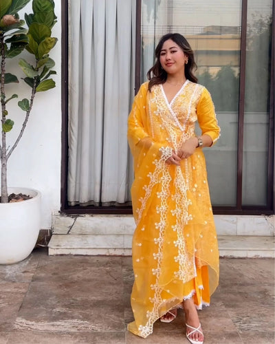 Brighten up any festive occasion with this stunning yellow kurta set! Crafted with with softest cotton satin fabric with schiffli floral modern embroidery with high-low Flared palazzo highlighted with lace at hem, makes it a versatile ensemble. The wrap around kurta gives a flattering fit while as the neck and sleeves highlighted with lace makes it more beautiful. The floral buti and scalloped borders on the organza dupatta will add oodles of elegance to this ensemble.